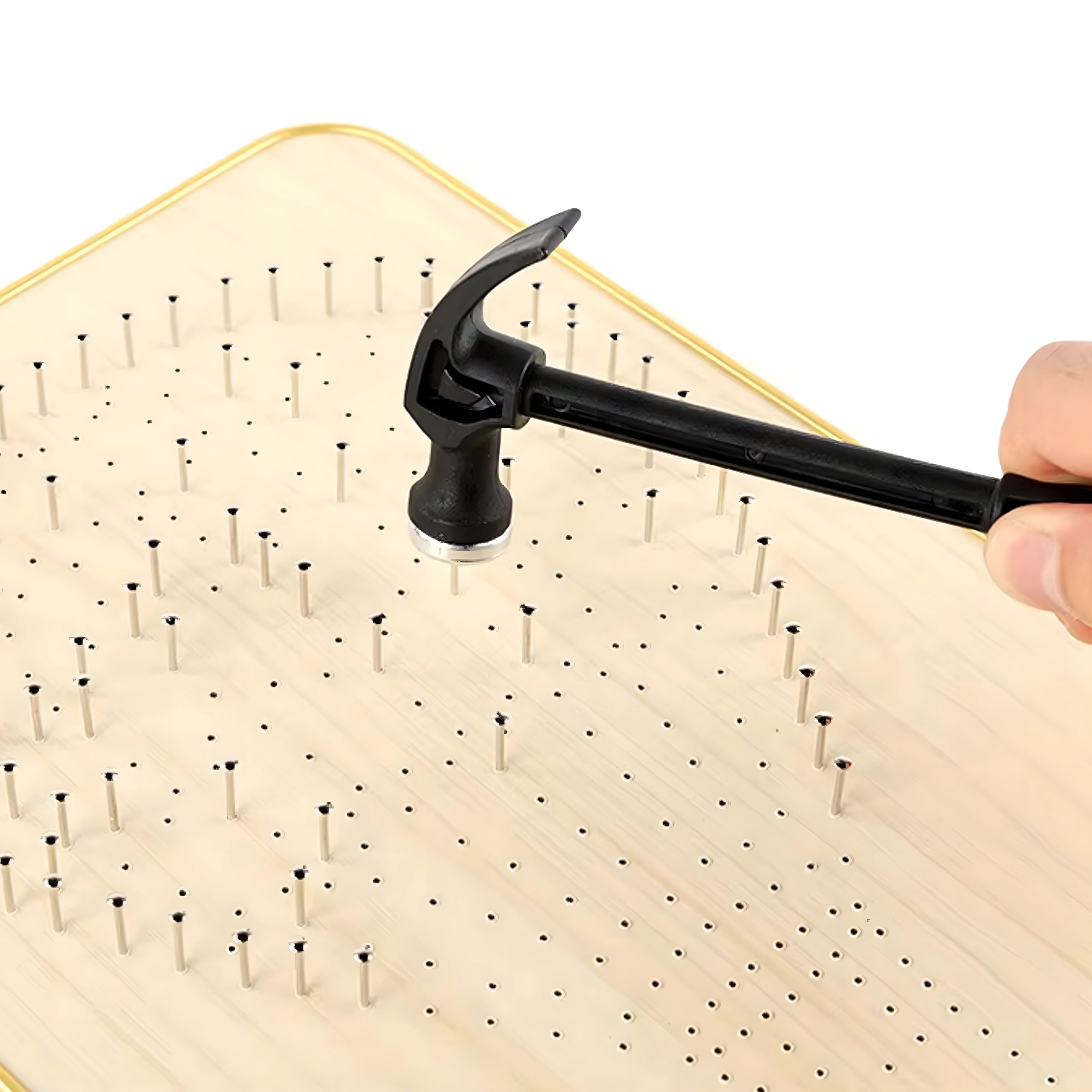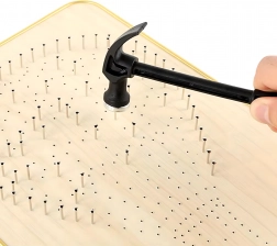 Een raster met voorgeboorde gaatjes en kleine spijkertjes versnelt het werk en zorgt voor preciezere vormen. Geschikt voor beginners en kinderen onder begeleiding.