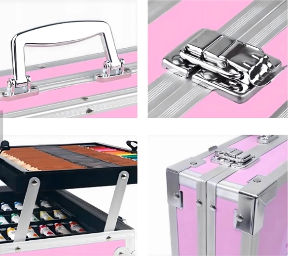 Duurzame uitvoering met metalen handgreep, sluitingen en verstevigde hoeken beschermt de materialen. Gelaagde vakken houden alles netjes geordend, thuis en onderweg.