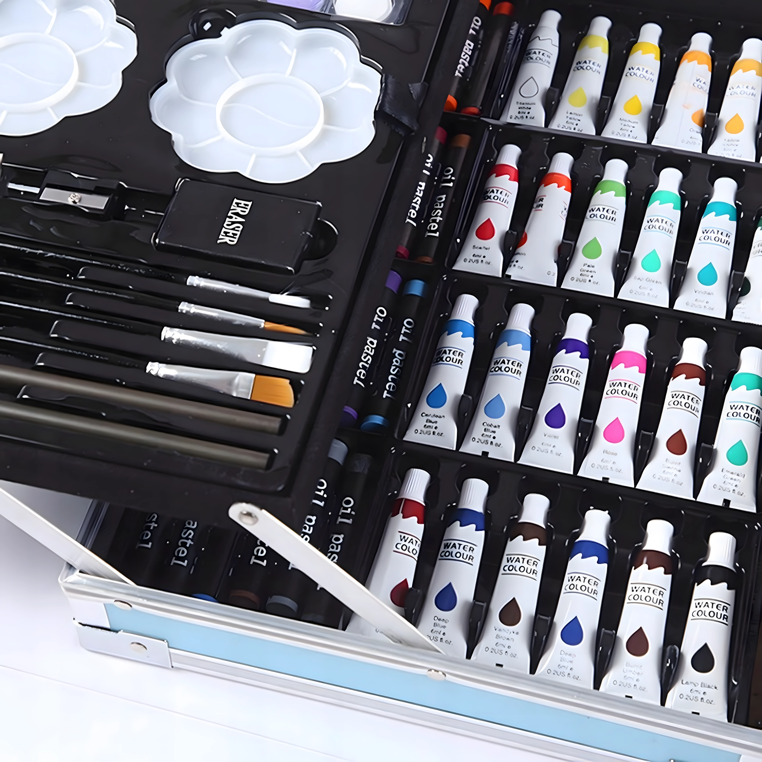 De set combineert kleurpotloden, stiften, waskrijtjes, oliepastels, aquarellen, penselen, paletten en accessoires. Kinderen hebben altijd het juiste hulpmiddel bij de hand voor elk idee.