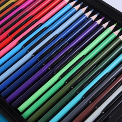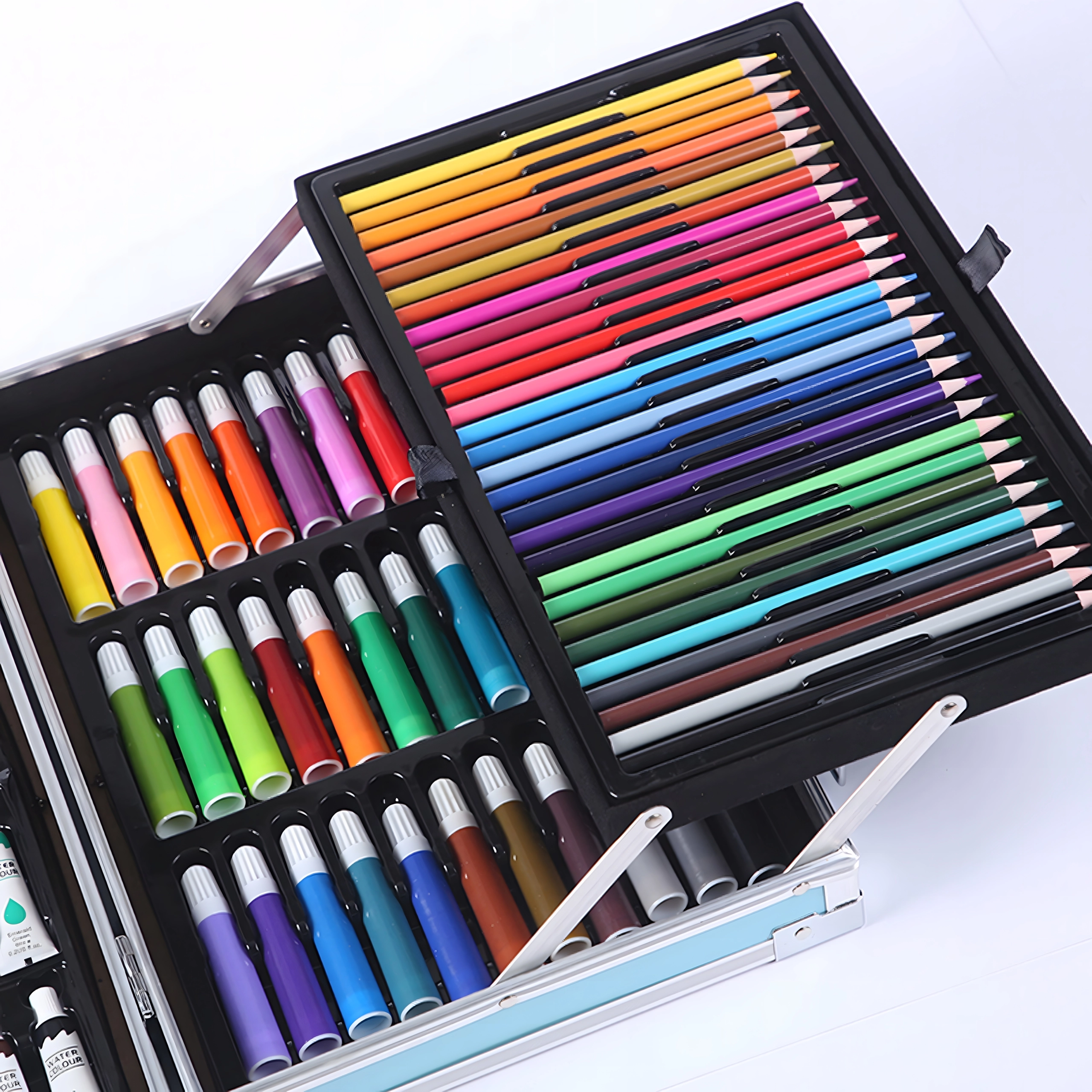 Kleurpotloden, viltstiften, waskrijtjes, oliepastels, aquarelbakjes, penselen, paletten en meer accessoires – alles overzichtelijk geordend voor direct creatief gebruik.