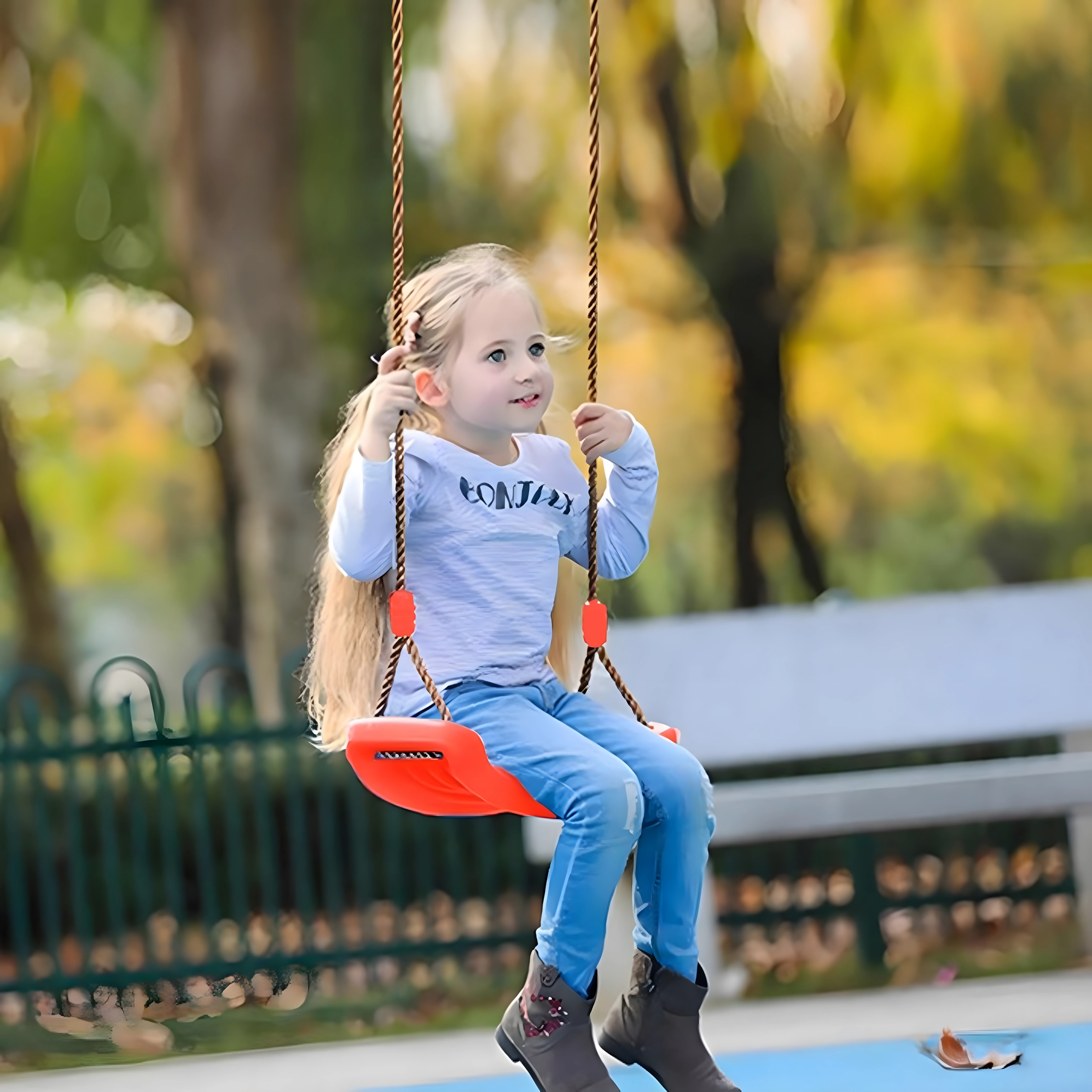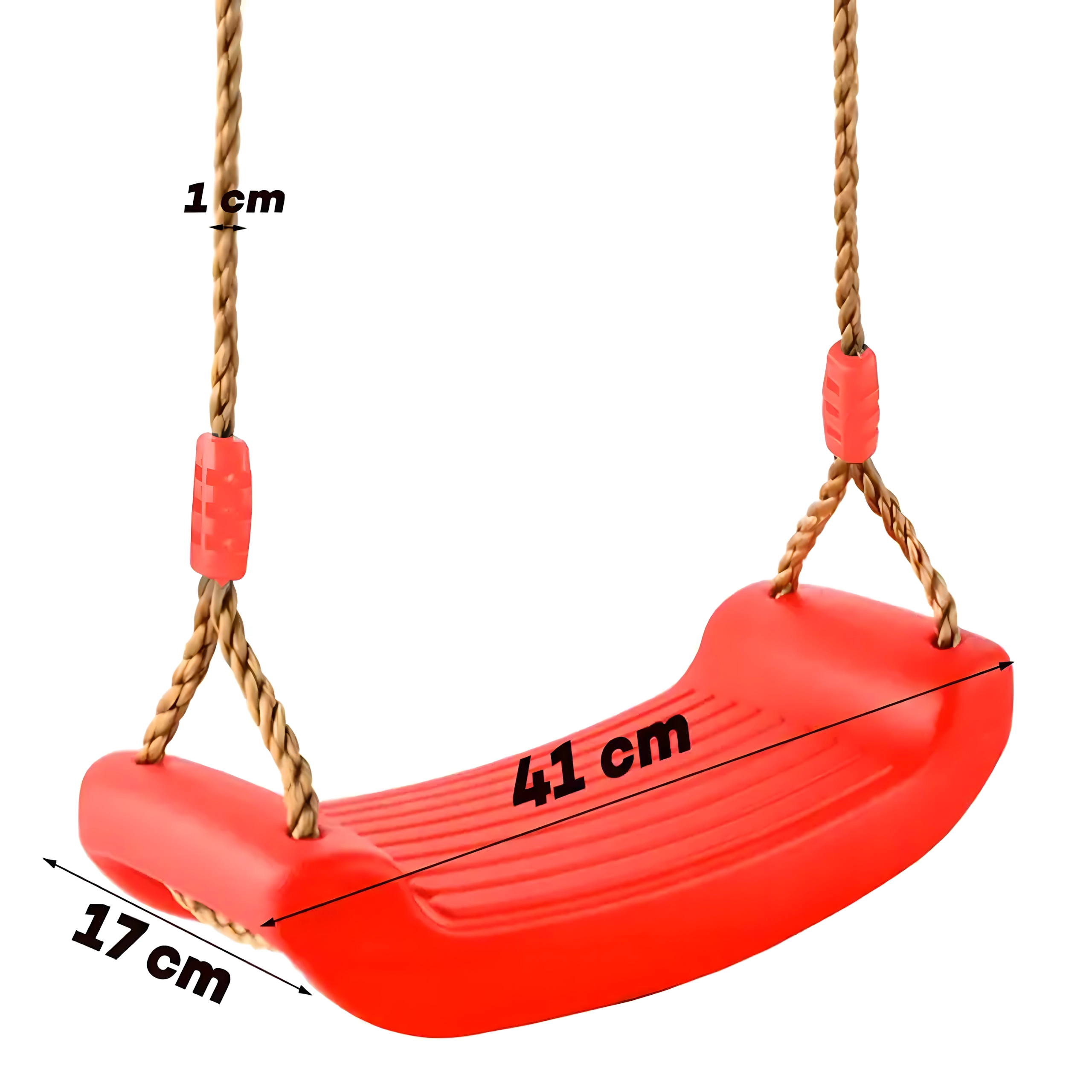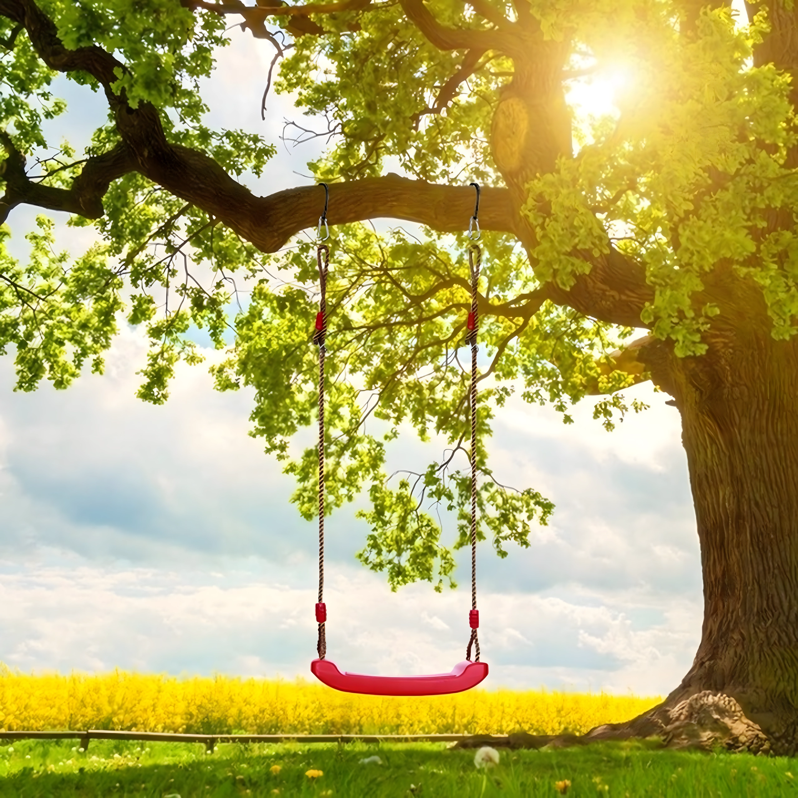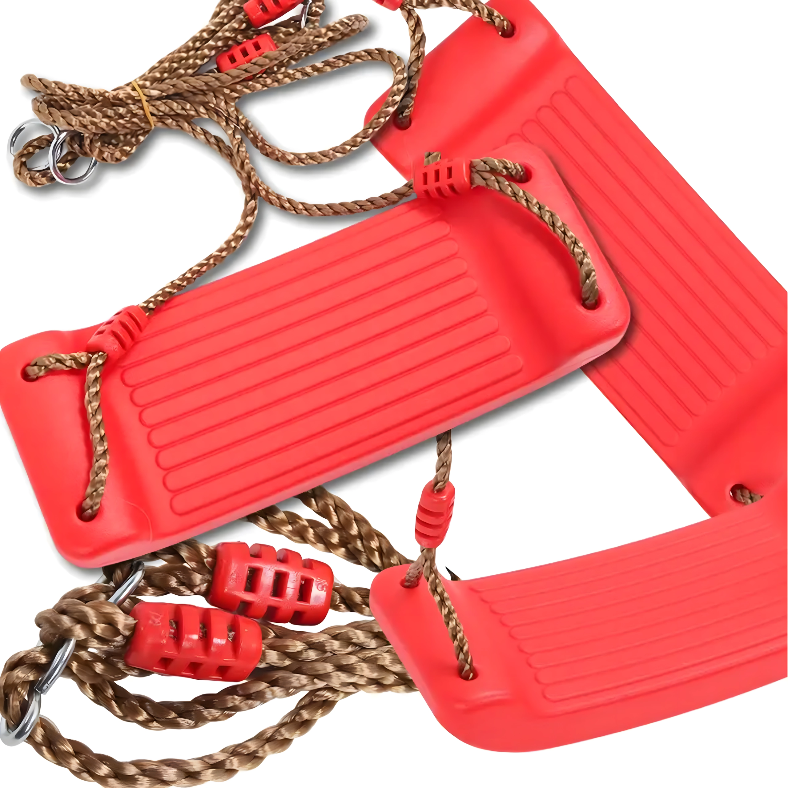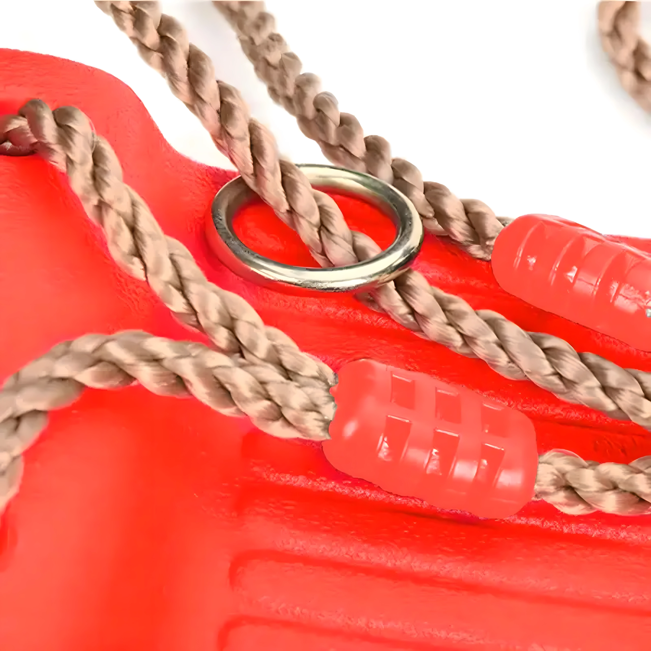 De hoogte is traploos verstelbaar met behulp van kunststof gespen, zodat de schommel meegroeit met je kind en zich makkelijk aanpast aan verschillende ophangpunten – speeltoestellen, pergola’s of stevige boomtakken. Slijtvaste materialen zijn bestand tegen normaal weer en langdurig gebruik.
