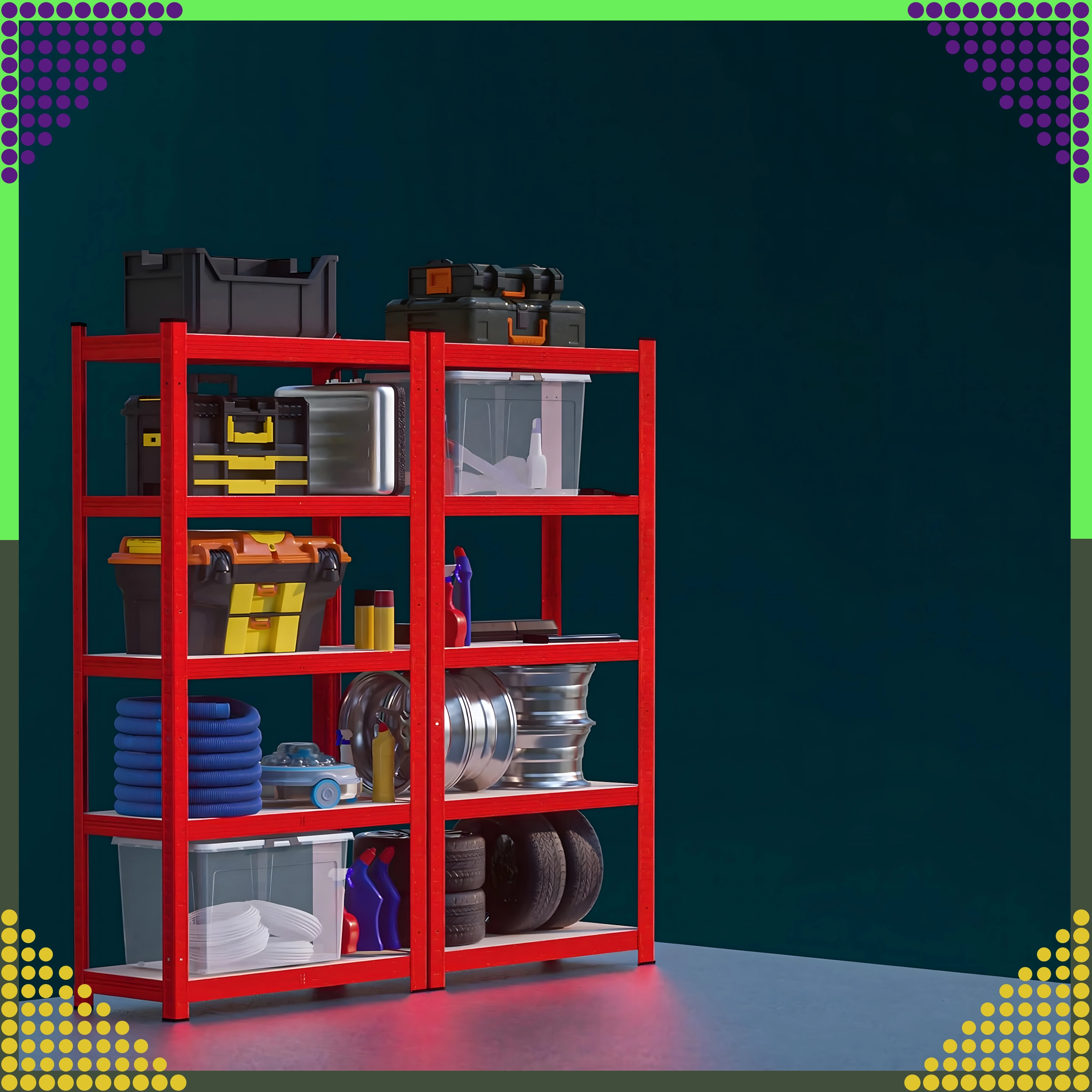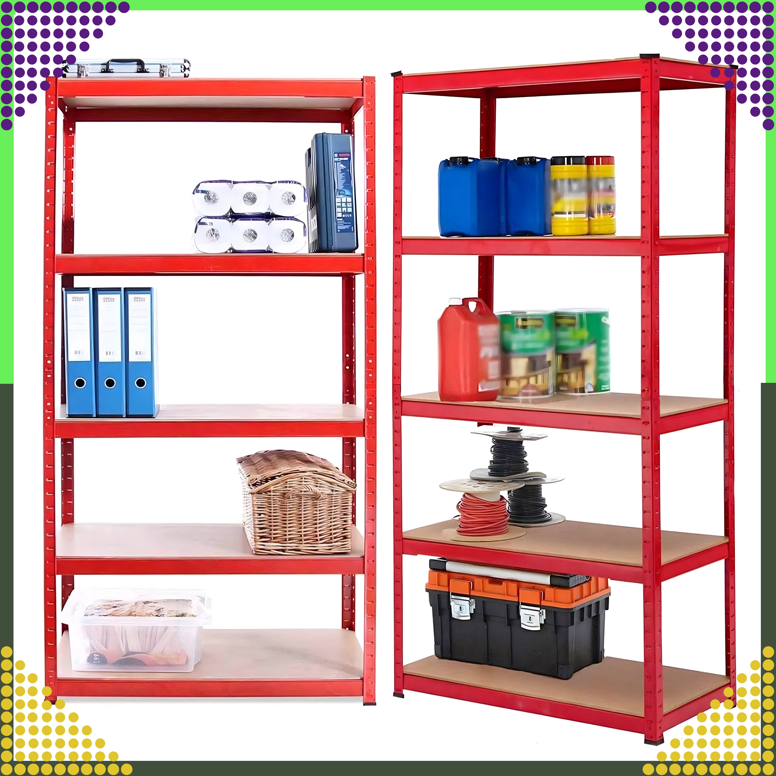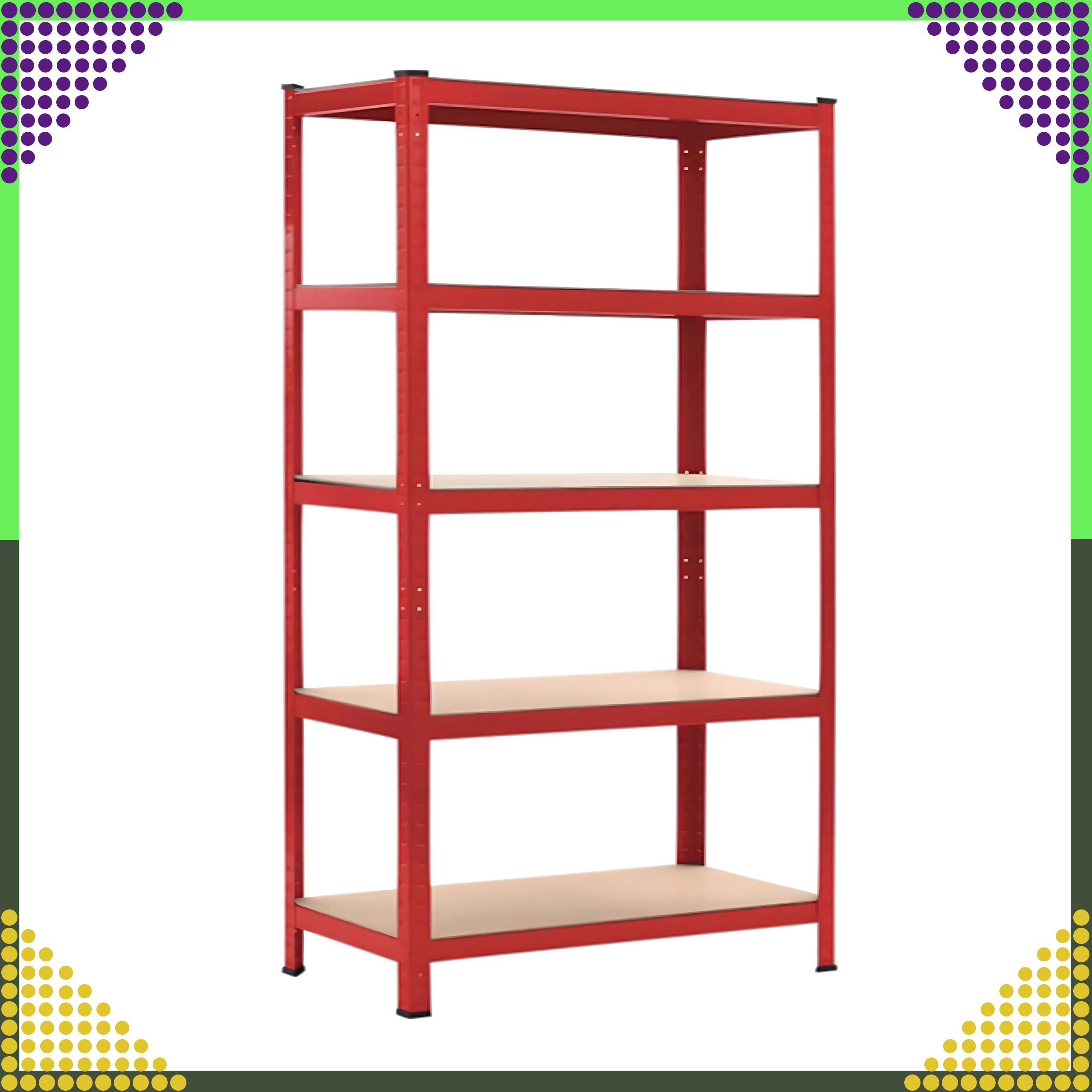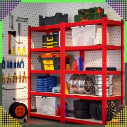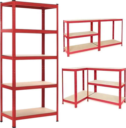 Stabiel stalen rek in een elegante rode kleur is ideaal voor garages, kelders, werkplaatsen, magazijnen en thuisarchieven. Dankzij de verstelbare legborden pas je de hoogte van de opbergniveaus eenvoudig aan je behoeften aan en benut je de verticale ruimte efficiënt.