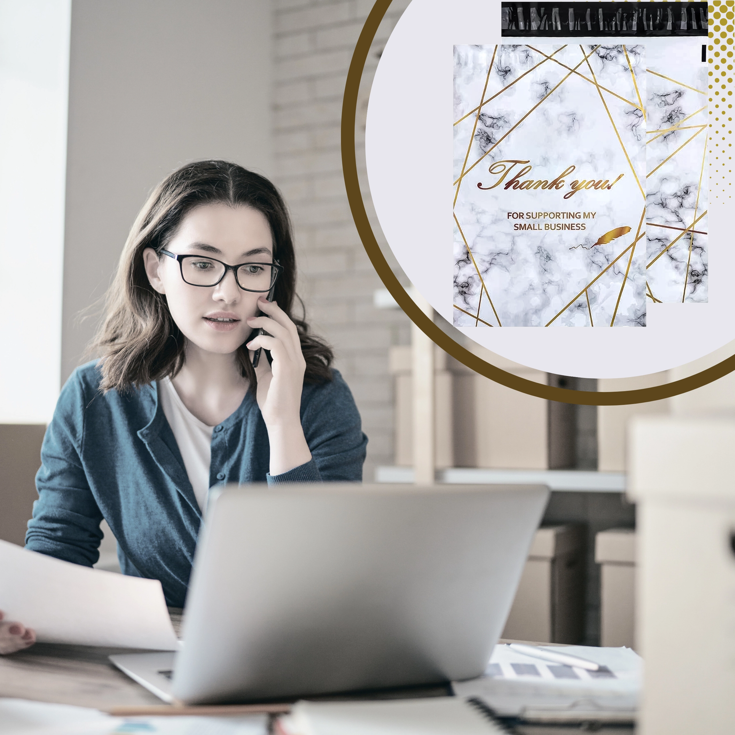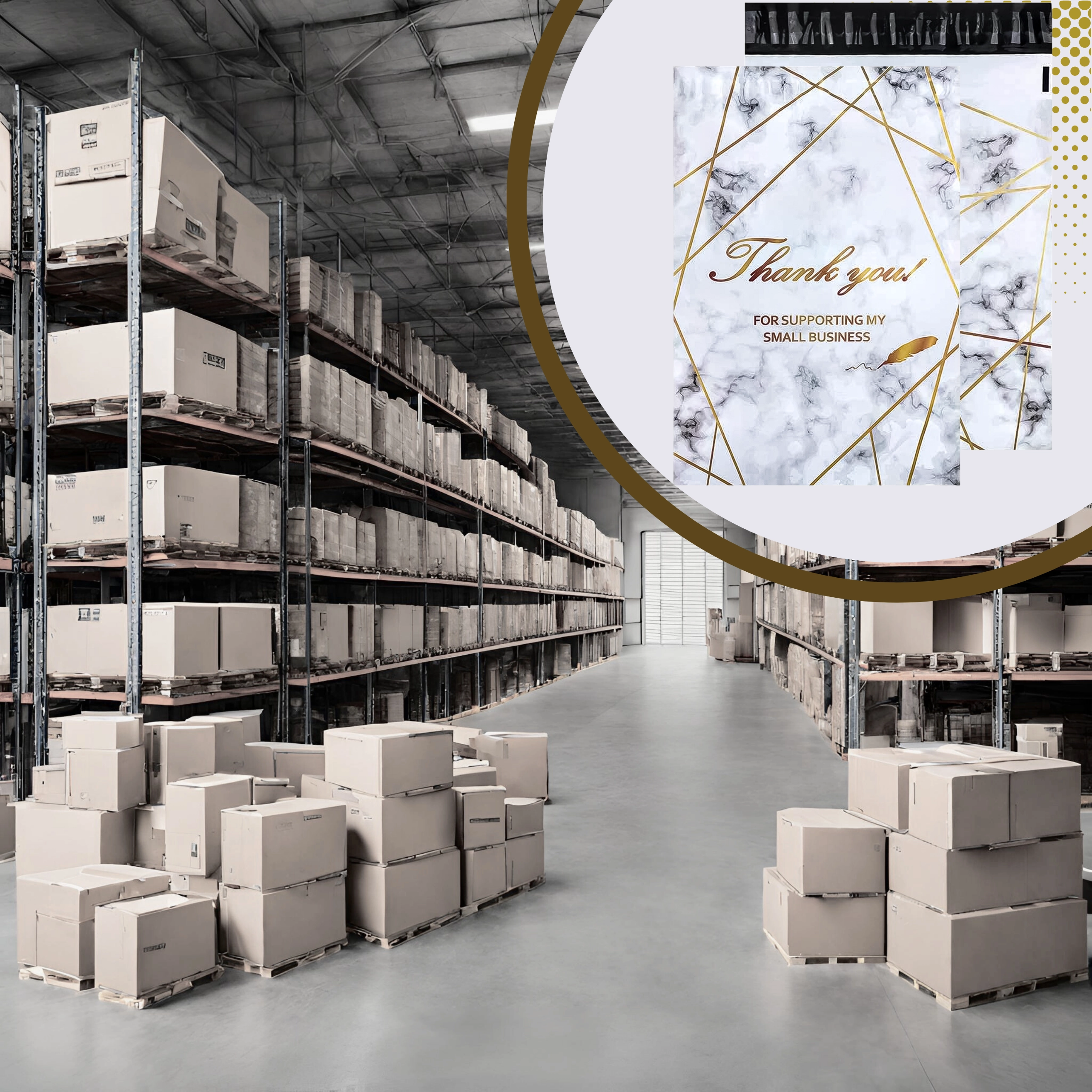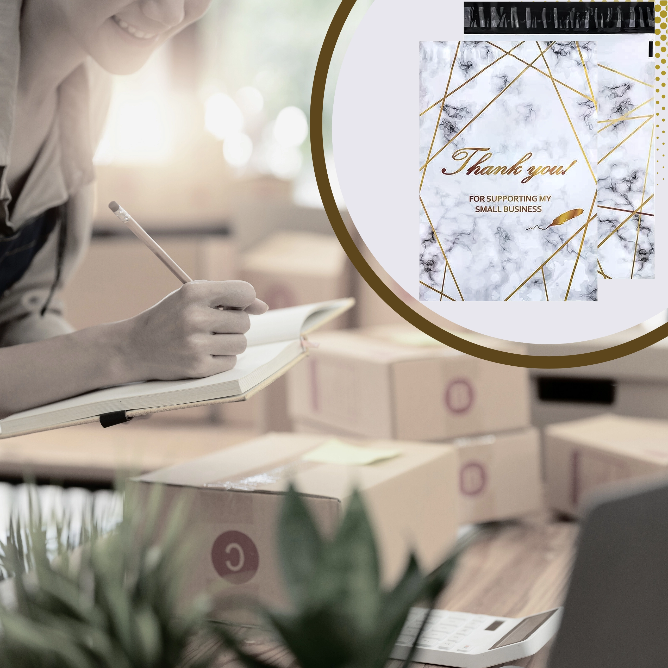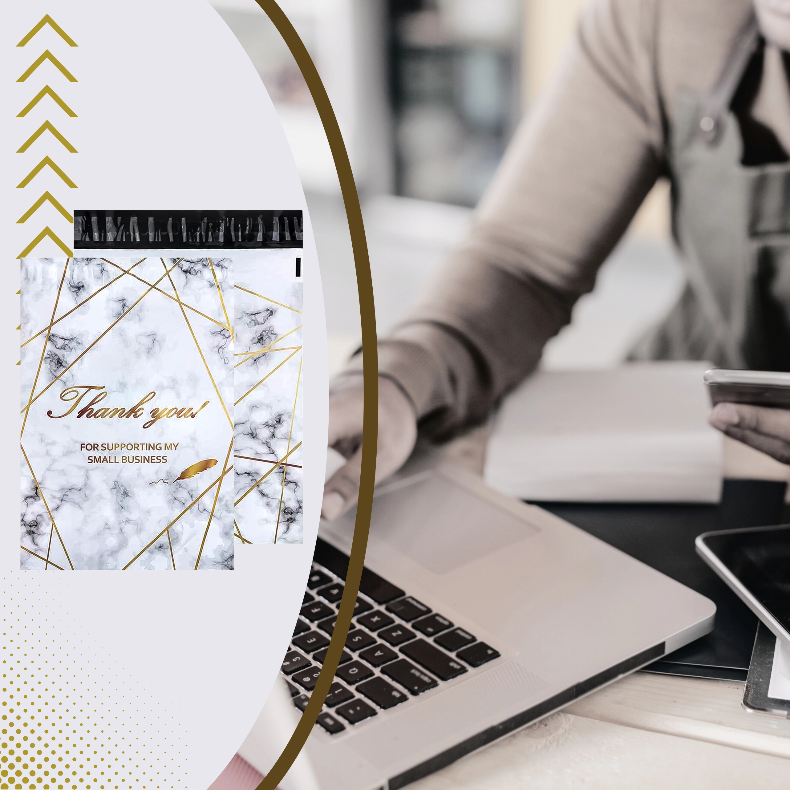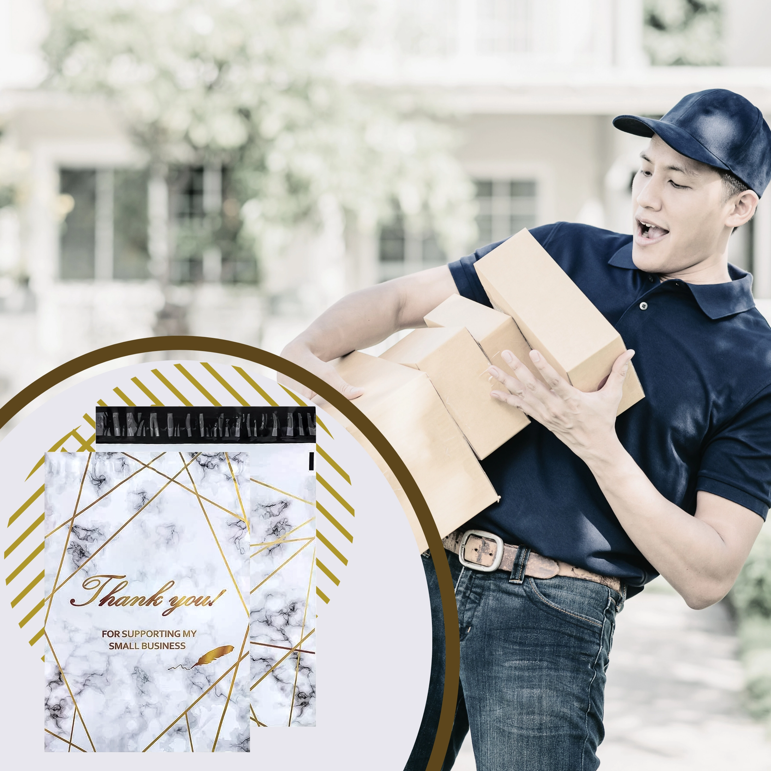 Zoek je betrouwbare verpakkingen voor je webshop of regelmatige zendingen? Deze koeriersfoliepakken combineren stevigheid, veiligheid en esthetiek. Het formaat 380 × 520 mm is ideaal voor kleine tot middelgrote producten, textiel of accessoires. Het goud marmer-design met Thank You-bedanking geeft je zendingen een professionele en vriendelijke uitstraling.