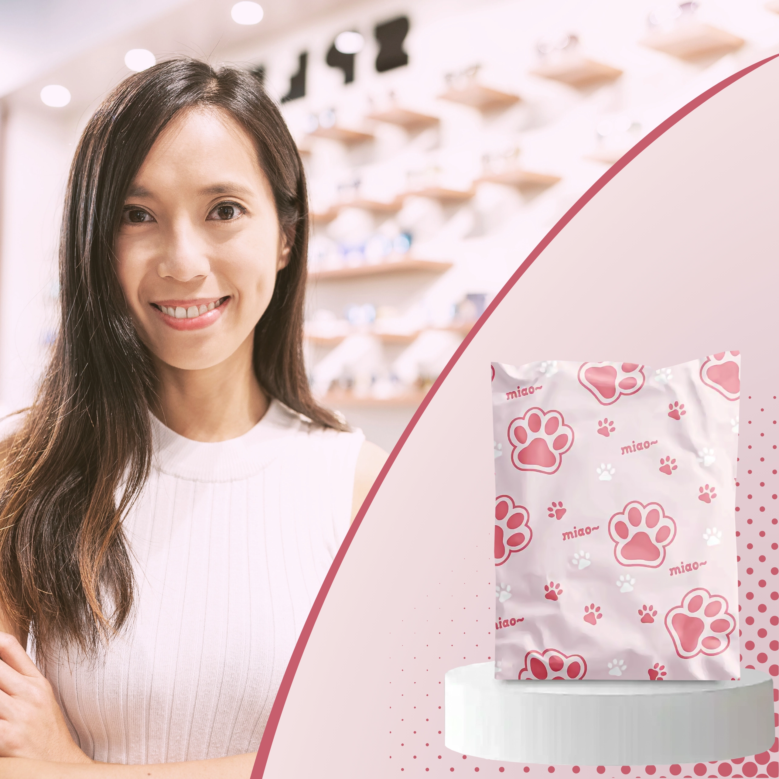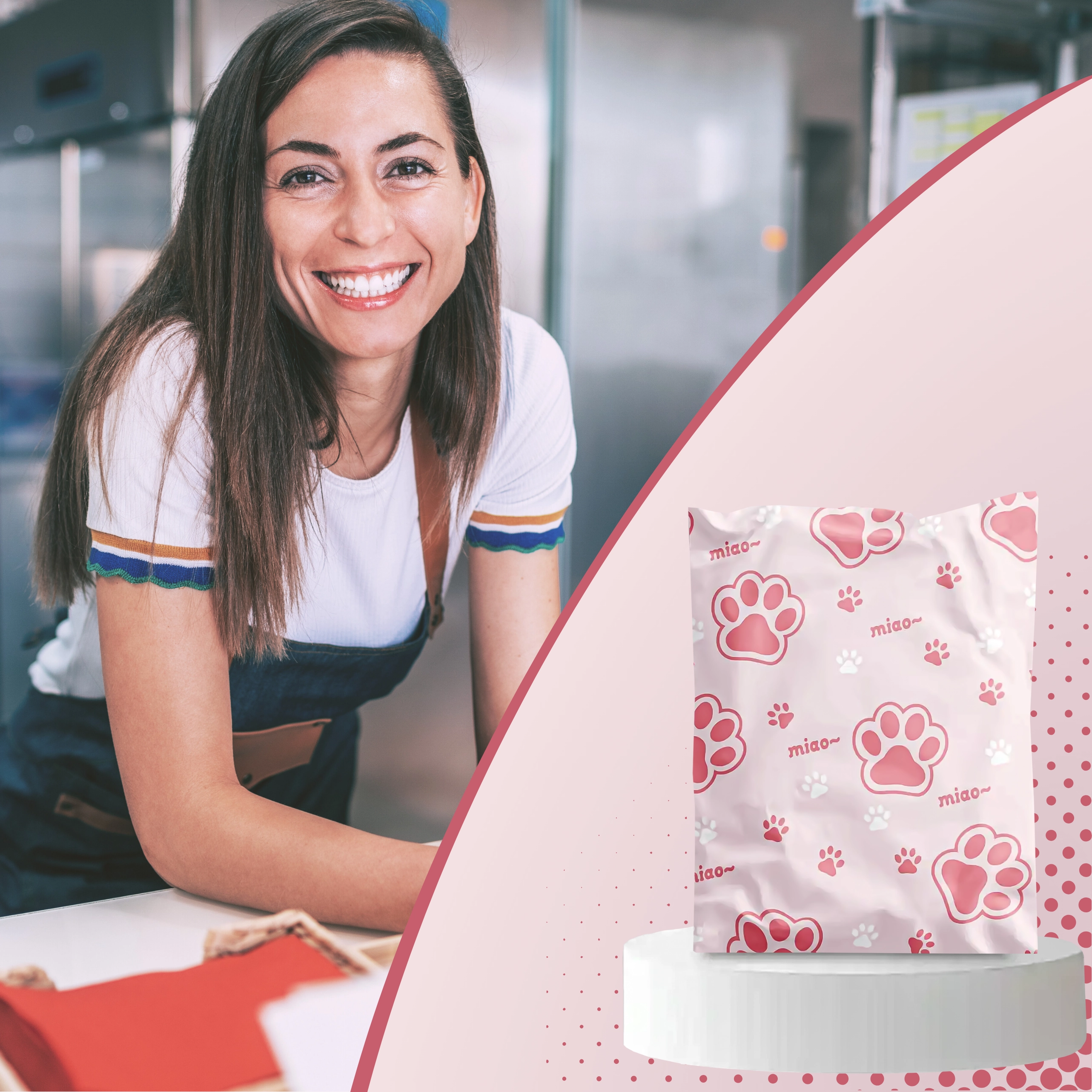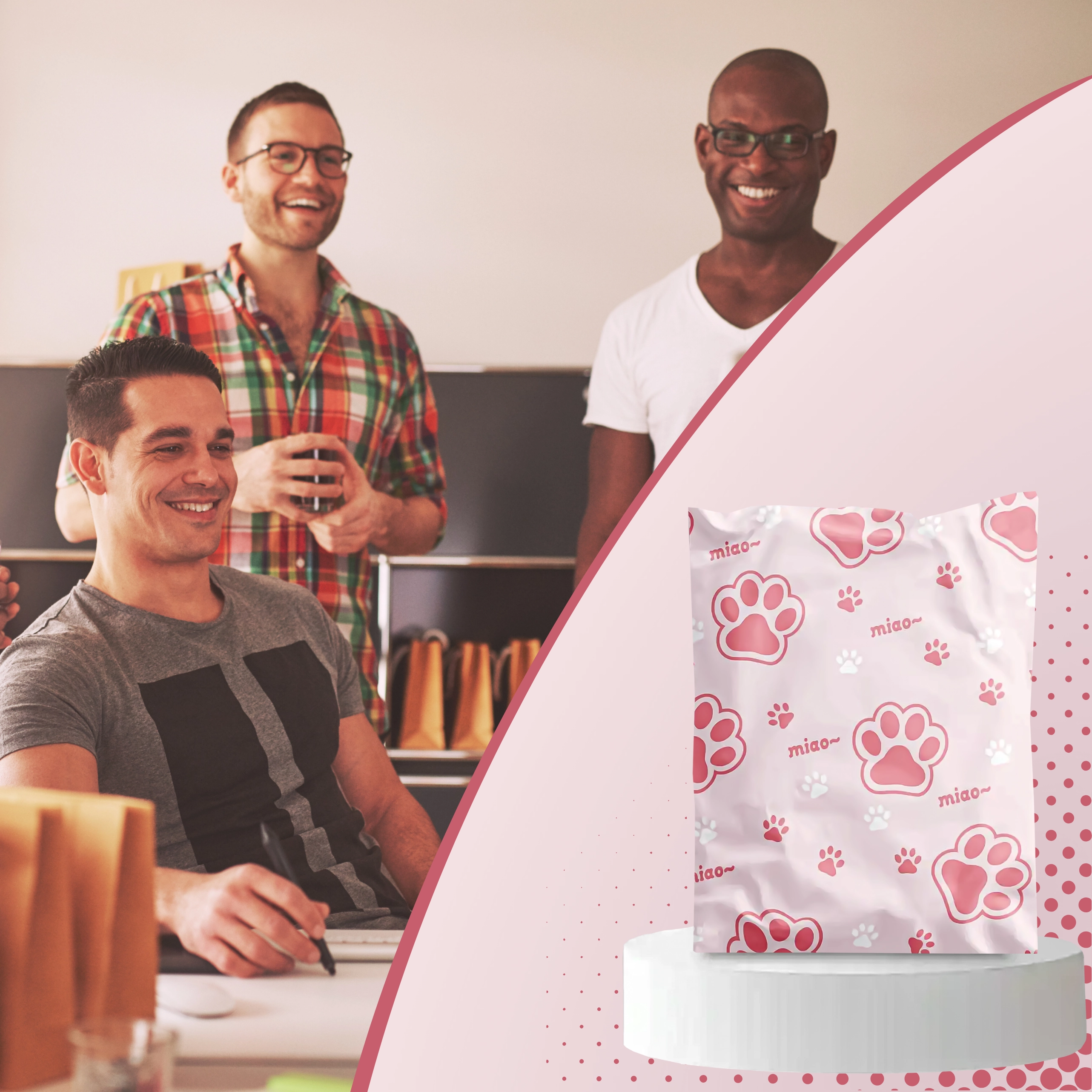 Roze‑witte print met de tekst “miao” geeft je zendingen een persoonlijk tintje en laat ze opvallen tussen gewone pakketten.