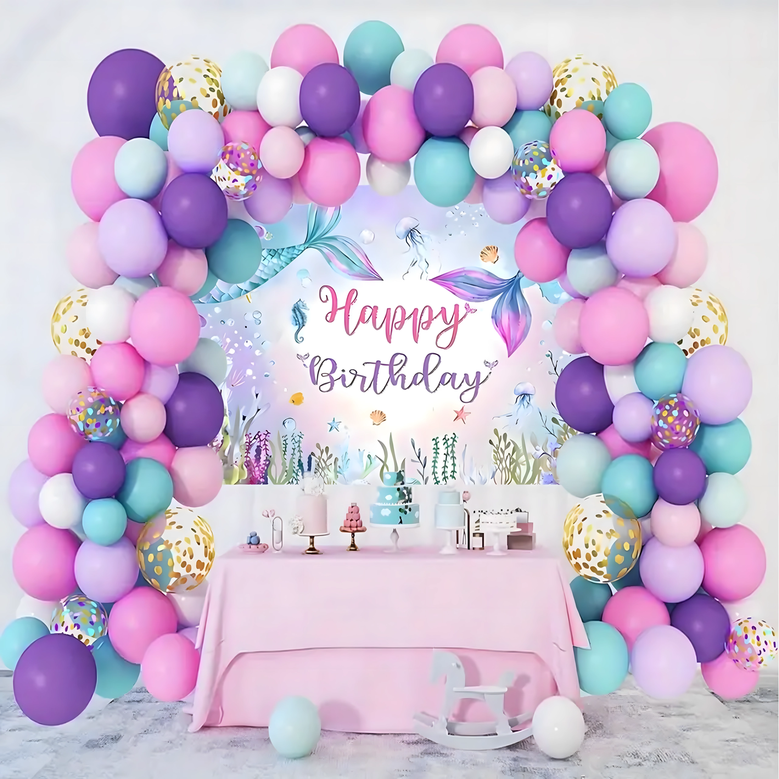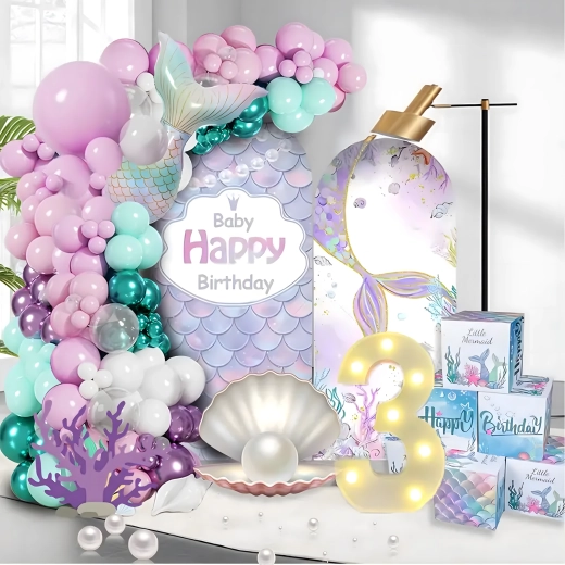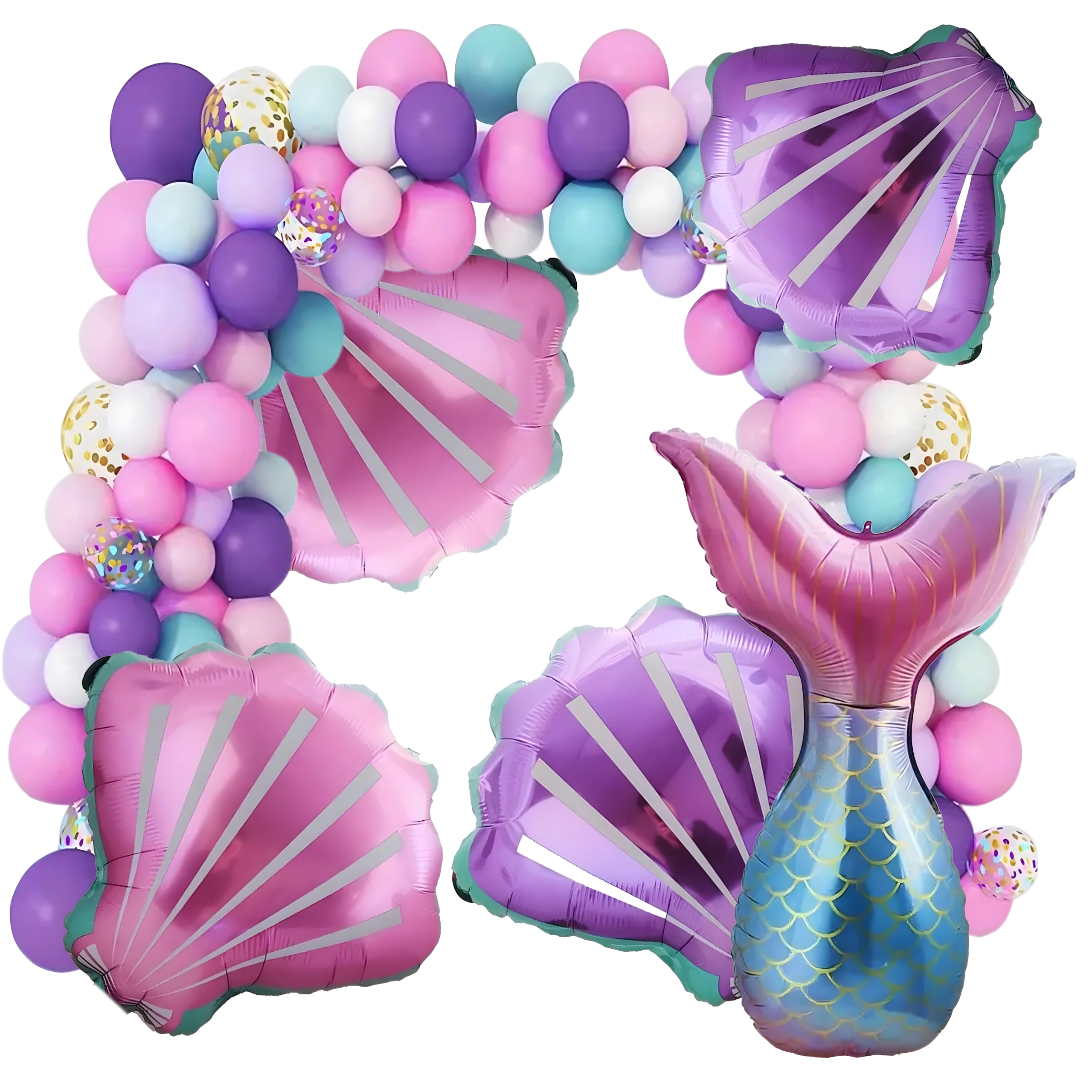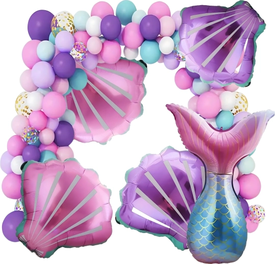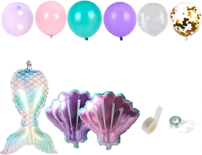 Deze decoratieve ballonnenslinger met zeemeermin-thema geeft je feest een zachte pasteltoets en een sprookjesachtige sfeer. In de verpakking vind je ballonnen in verschillende vormen en maten, waaronder confettieffecten en schelpmotieven, zodat je makkelijk een opvallende boog- of slingeropstelling kunt maken.