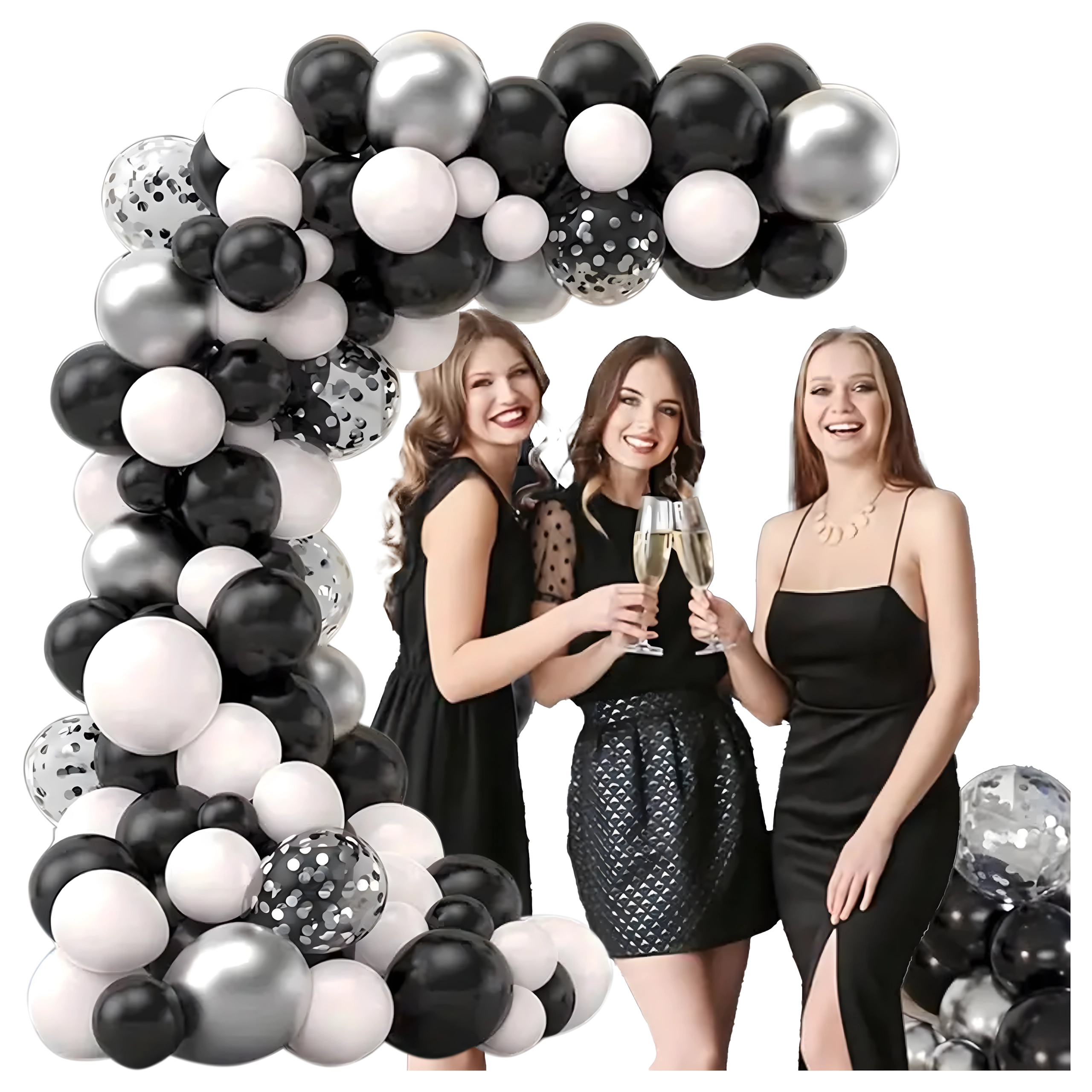 Deze elegante ballonnenslinger in een moderne zwart‑zilver‑witte kleurcombinatie geeft je feest een extra bijzondere uitstraling. Ook beginners kunnen hem eenvoudig samenstellen, met als resultaat een opvallende decoratie die perfect past als entreeboog, achtergrond achter een sweet table of voor een fotohokje.