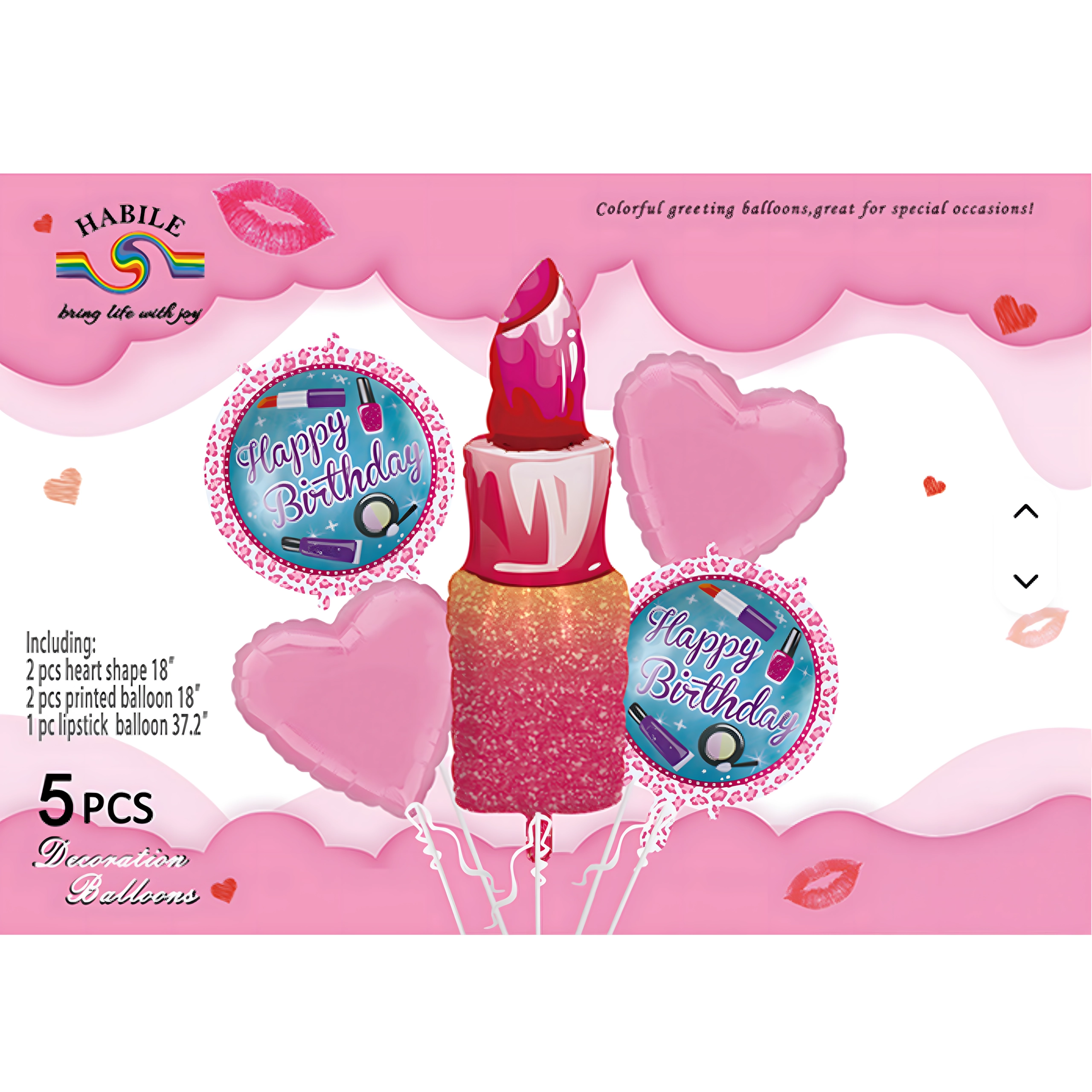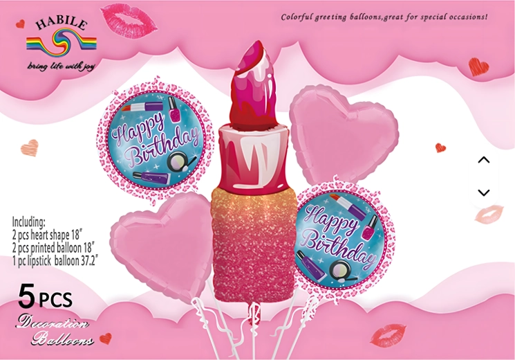 Stijlvolle set verjaardagsballonnen voor meisjes bevat 5 stuks: lippenstift, lippen, 2 ballonnen met de tekst Happy Birthday en een hart. Perfect voor verjaardagen, vrijgezellenfeestjes en andere damesfeesten.