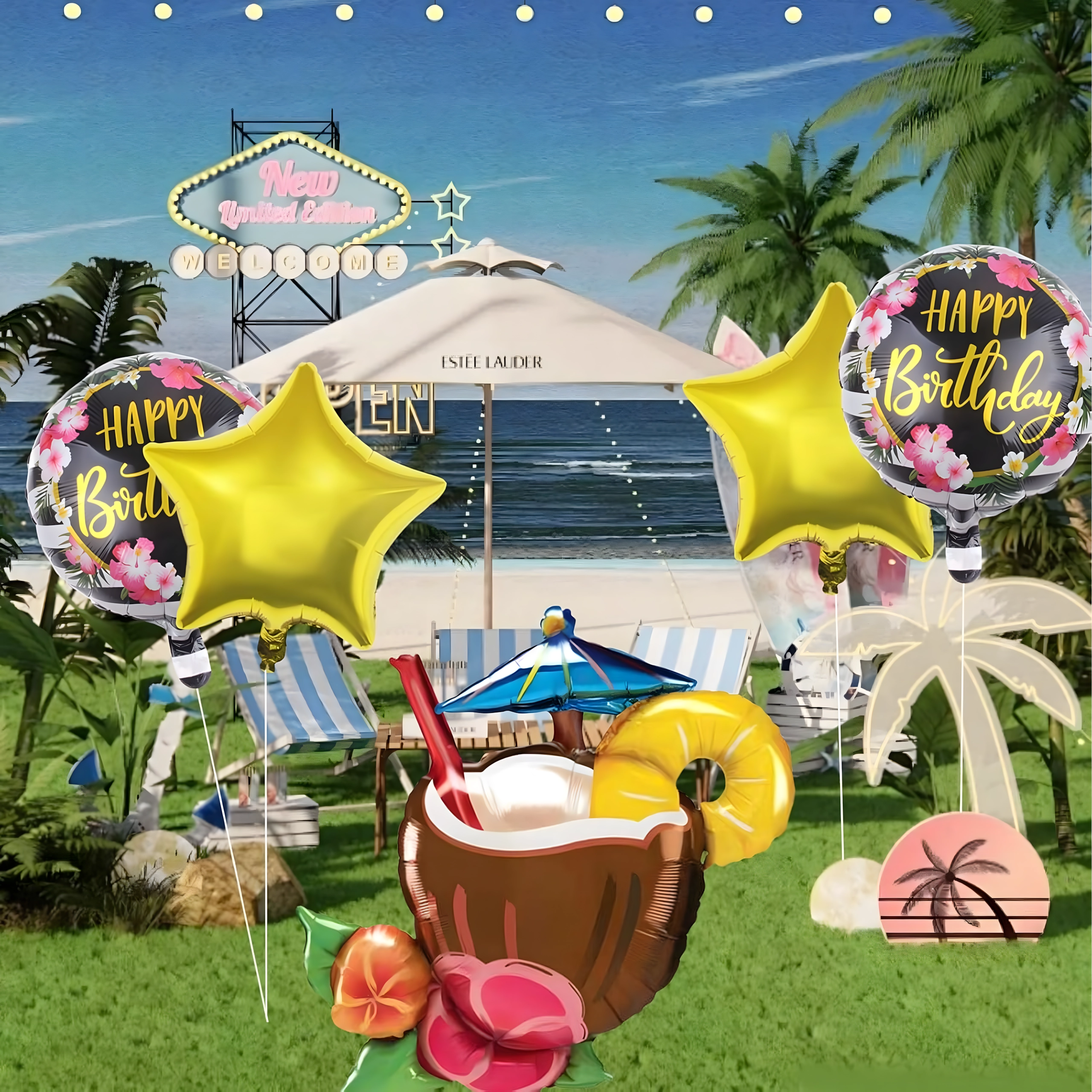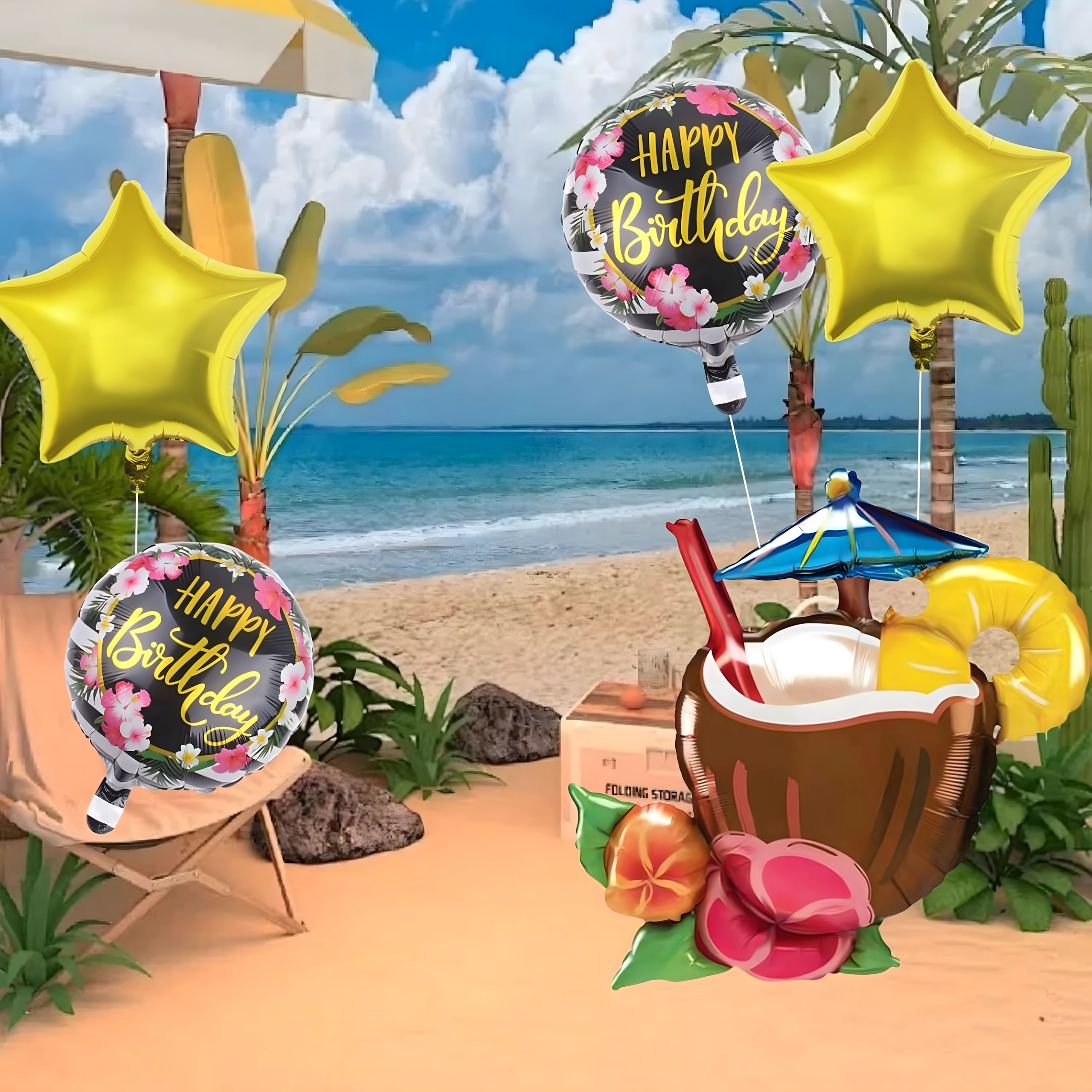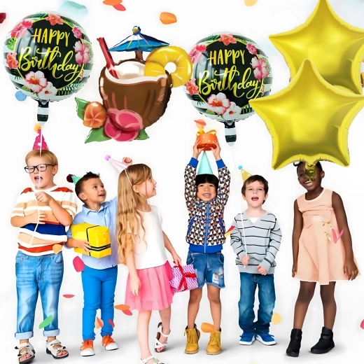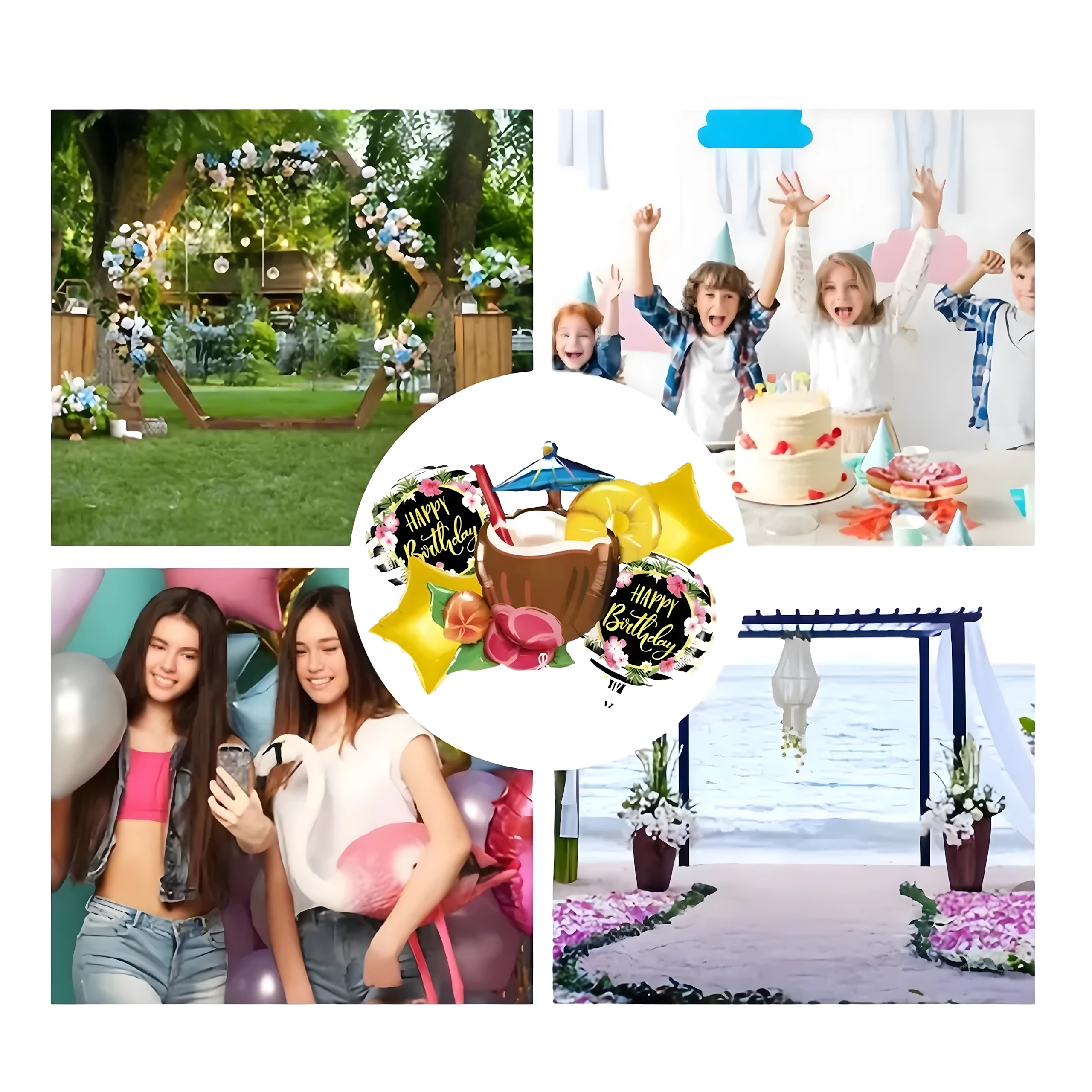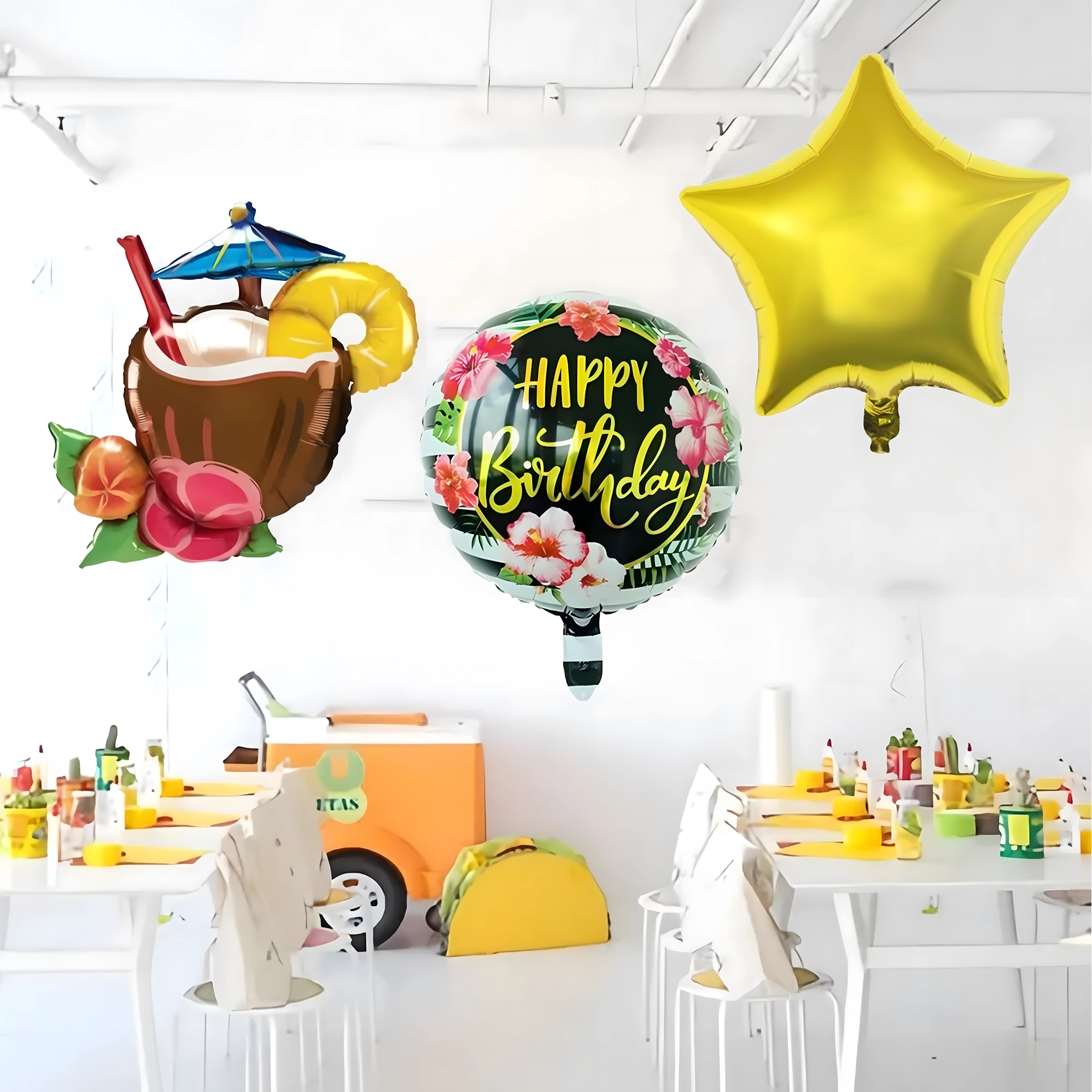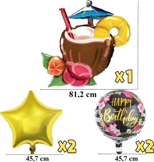 Vrolijk je feest op met levendige kleuren en een tropische vibe. Deze Aloha-ballonnenset brengt een speelse mix van motieven die perfect passen bij verjaardagen, tuinfeesten of zomerse barbecues. Blikvanger is de opvallende ballon in de vorm van een verfrissend drankje, aangevuld met klassieke ronde ballonnen met de tekst Happy Birthday en elegante gouden sterren.
