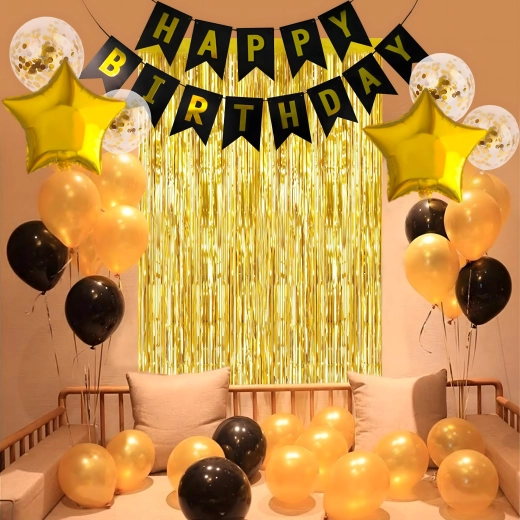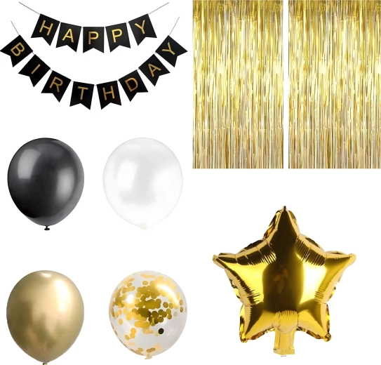 Deze complete decoratieset is ideaal om een opvallend verjaardagsdecor in zwart‑goud te creëren. De combinatie van verschillende soorten ballonnen en hangdecoratie zorgt voor een indrukwekkende achtergrond voor foto’s en de hoofdtafel van de jarige.