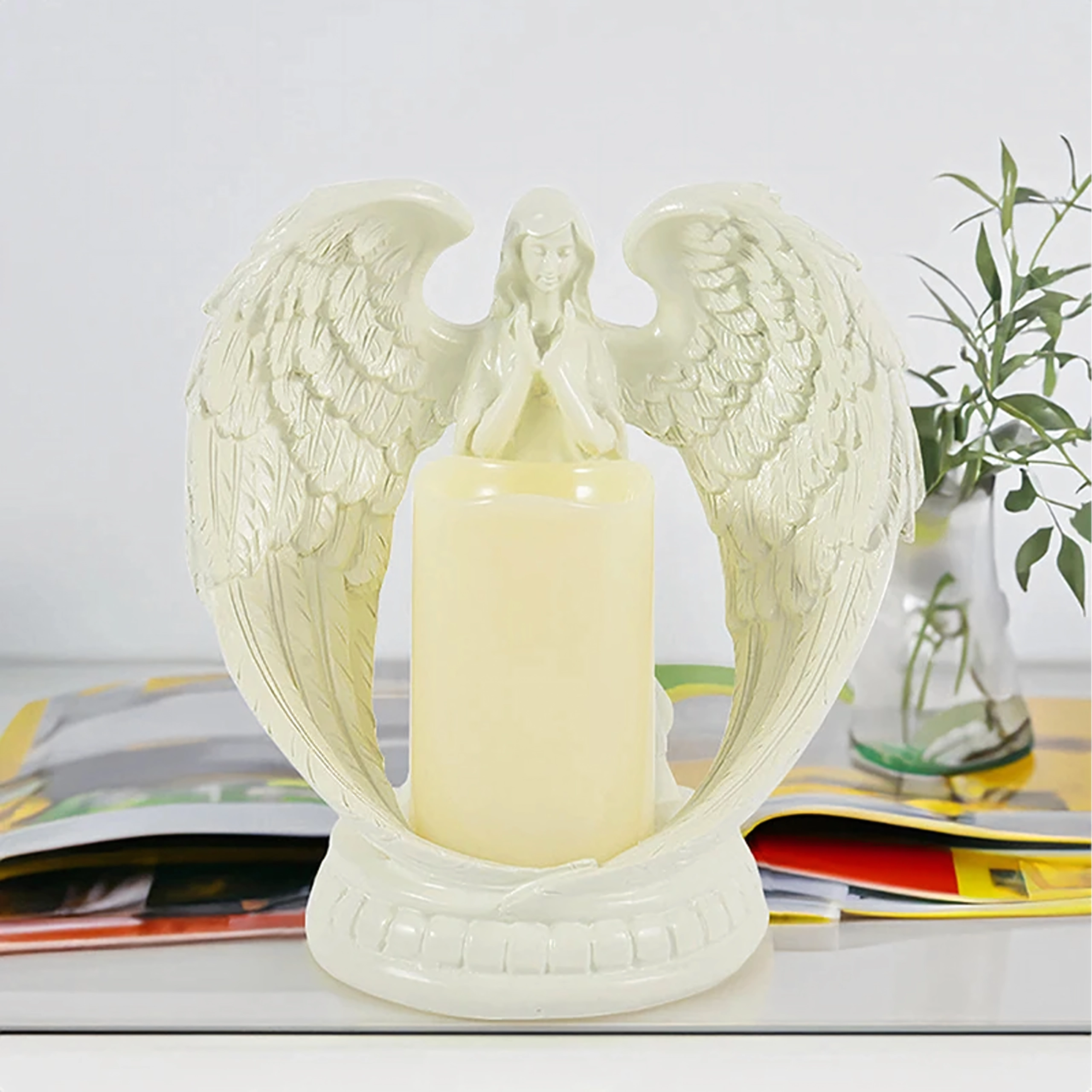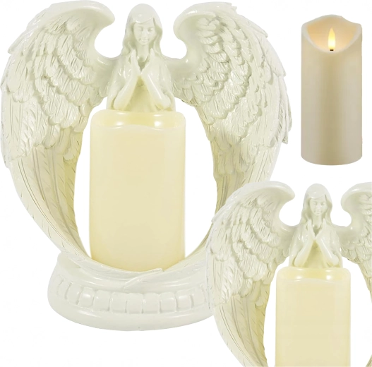 Elegante engel met een LED-licht in de hand brengt gezellige en realistische lichteffecten. Het beeldje van gips symboliseert rust, herinnering en zegen. Ideaal als interieurdecoratie, voor religieuze ceremonies, op een graf en als een bijzonder cadeau.