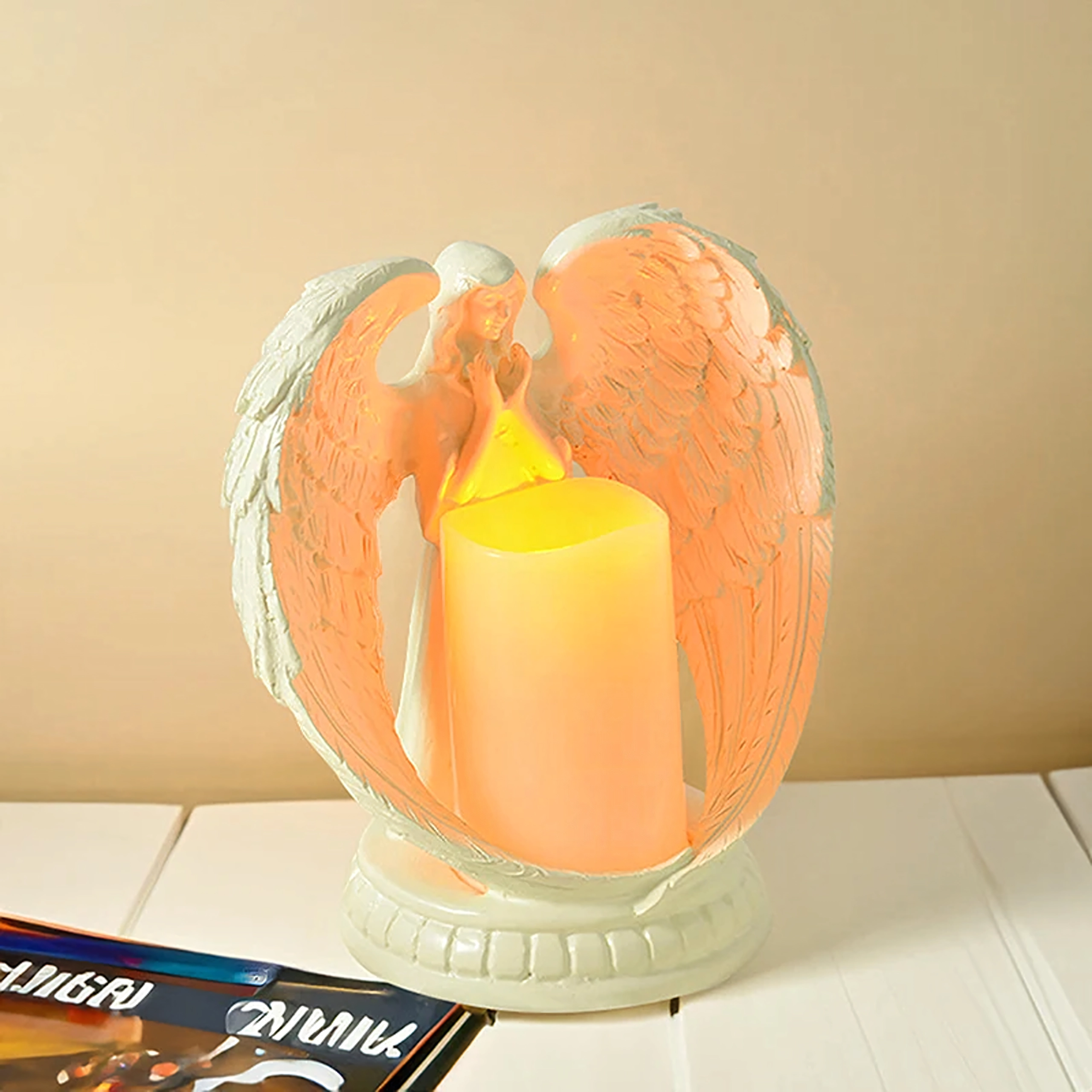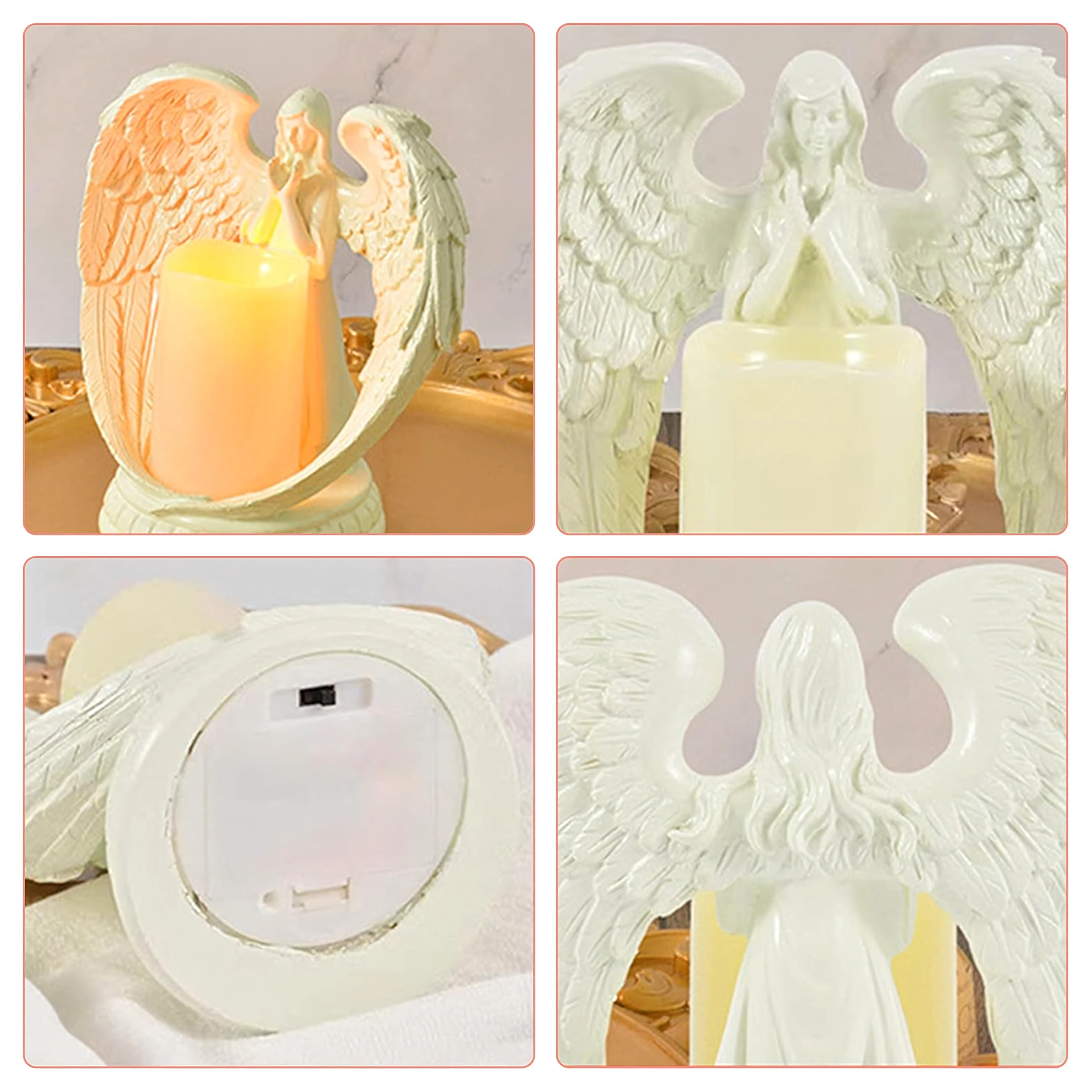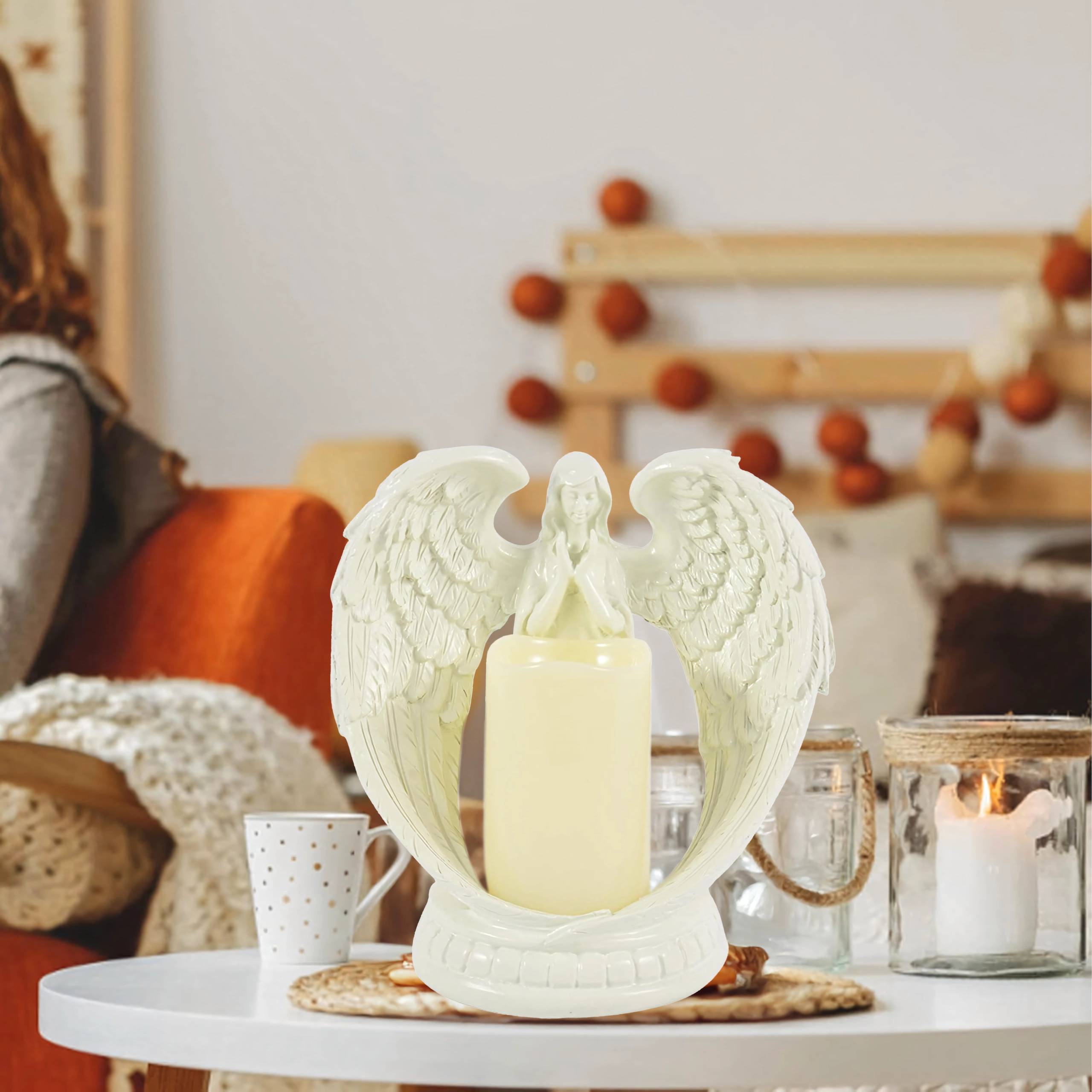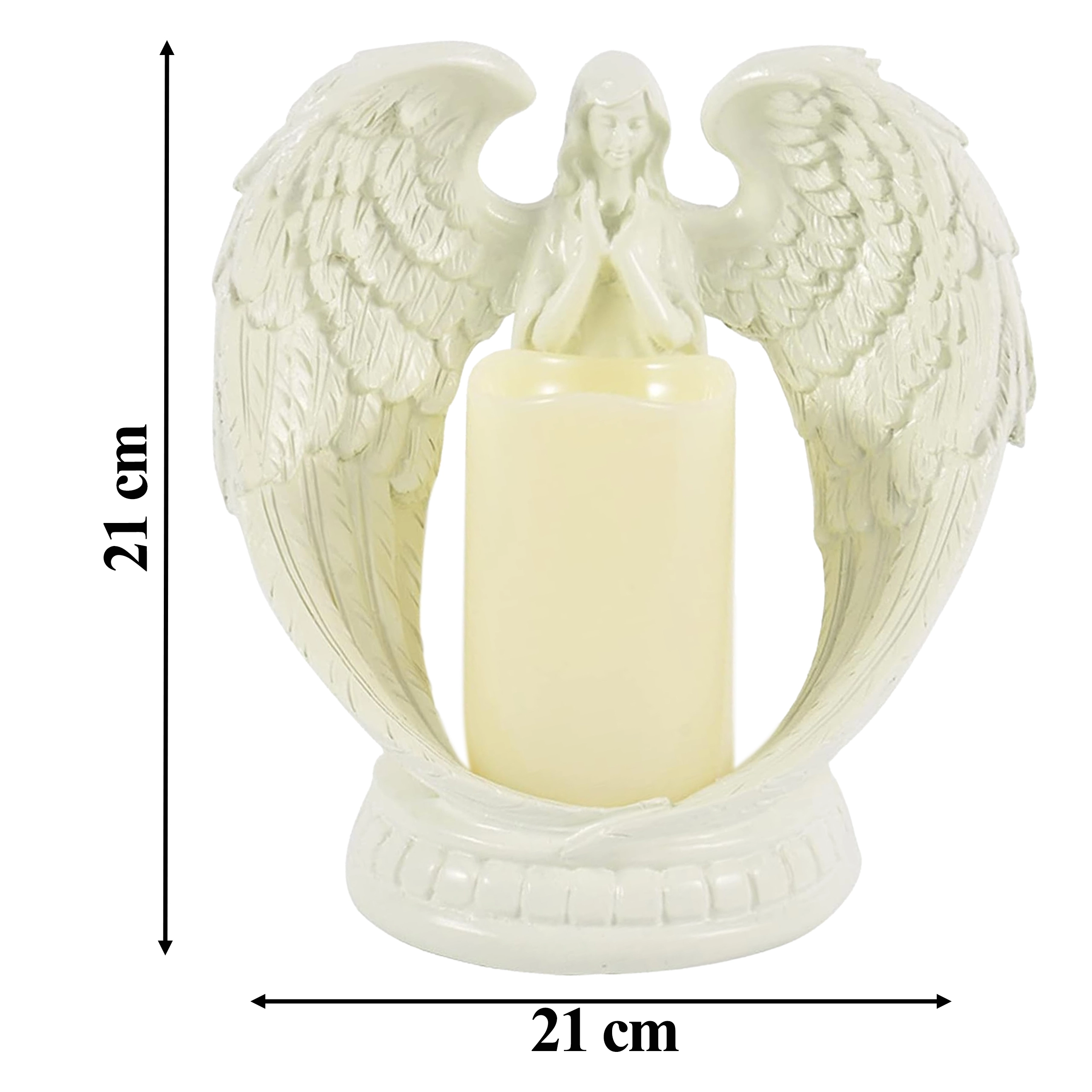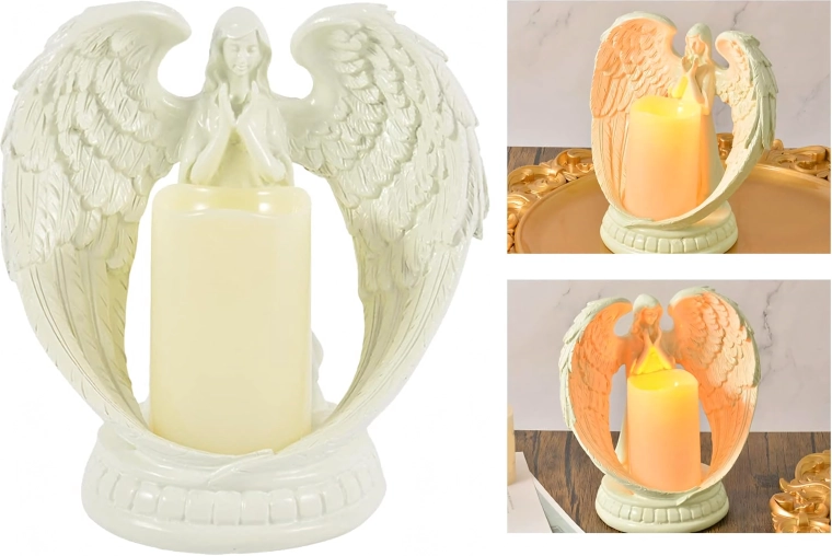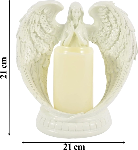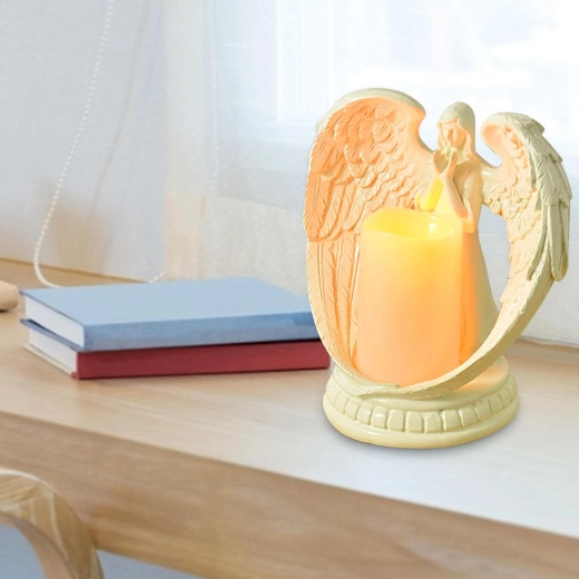 Elegante decoratieve engel met een kaars met realistisch LED-licht. Gemaakt van gepolijste hars, en symboliseert rust, herinnering en zegen. Ideaal voor interieur, religieuze ceremonies, op het graf en als bijzonder cadeau.