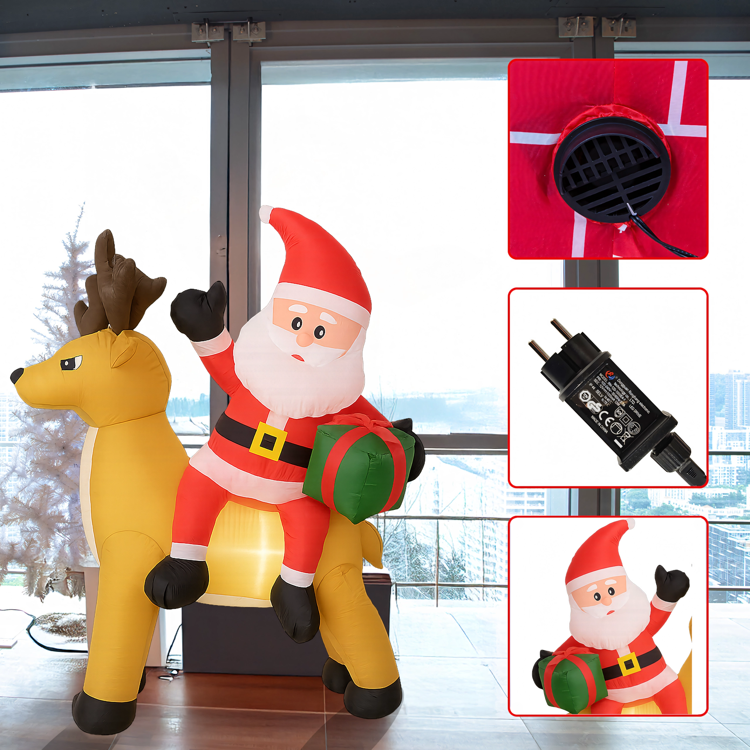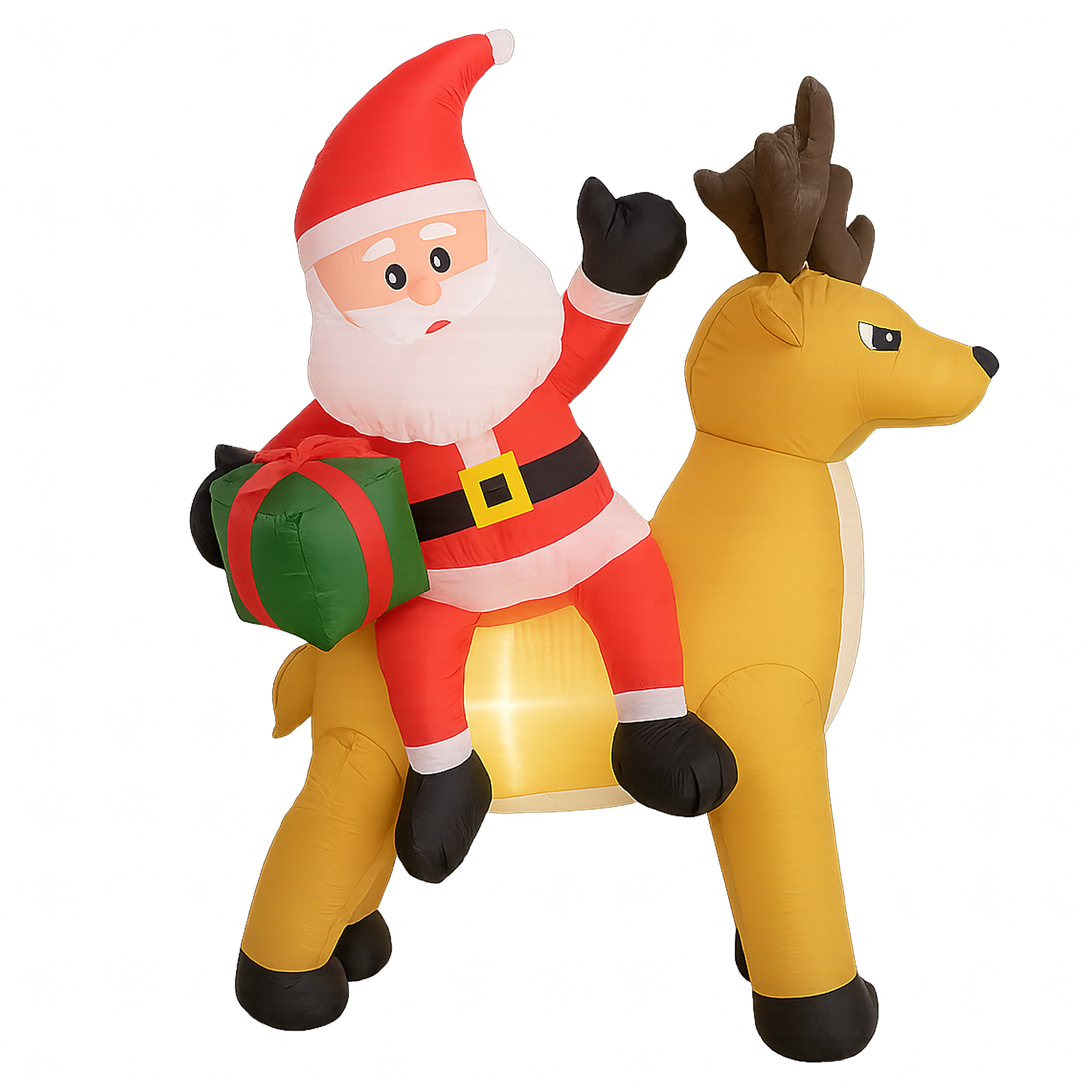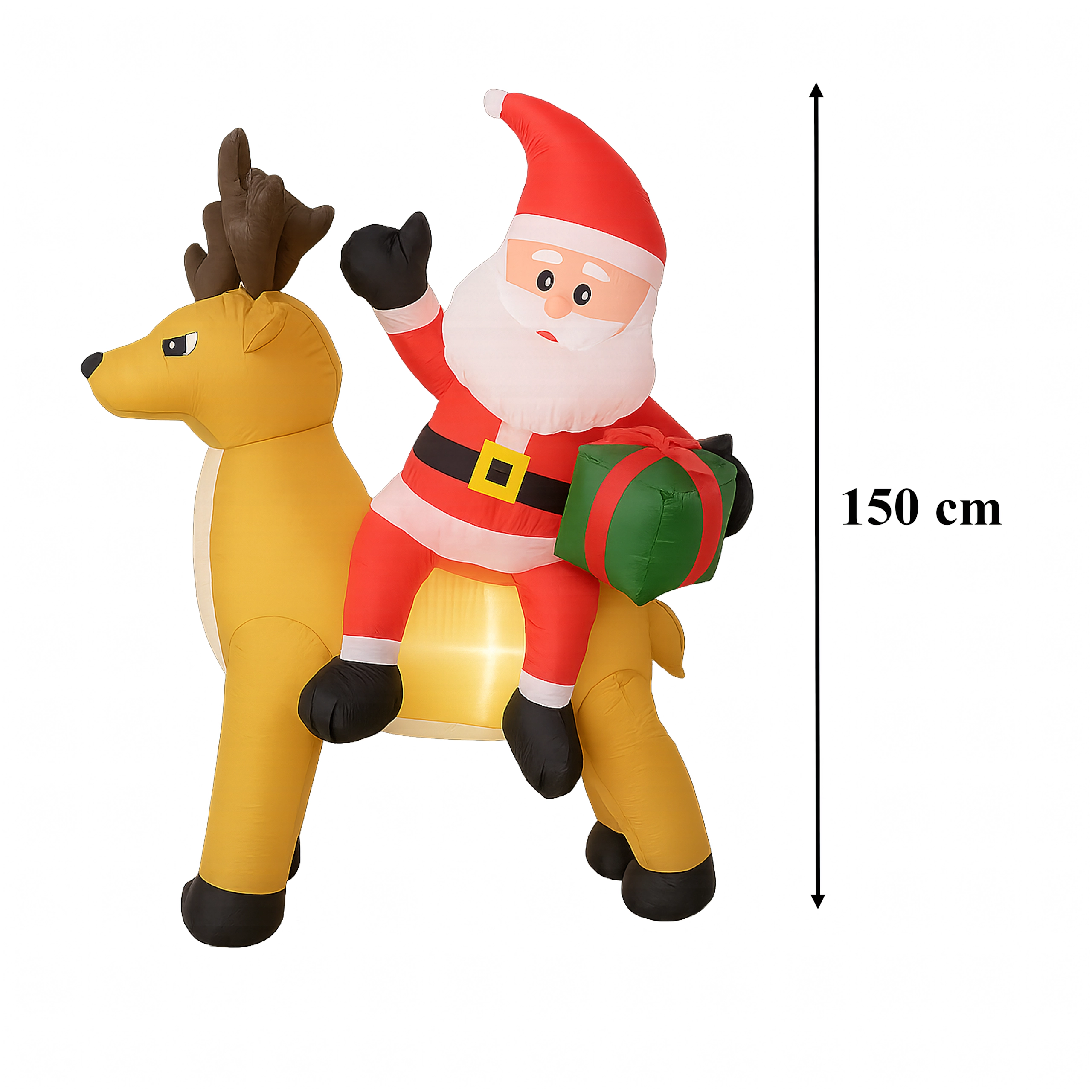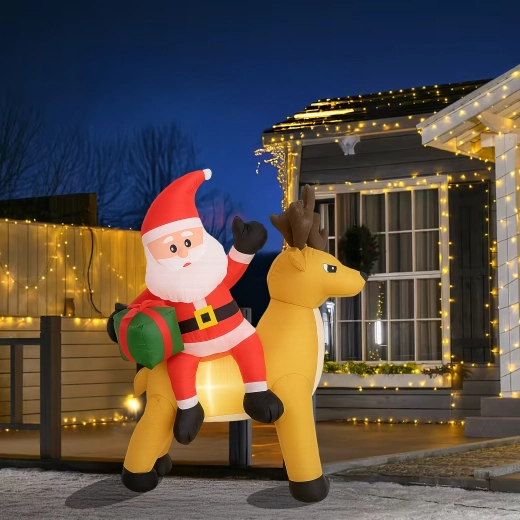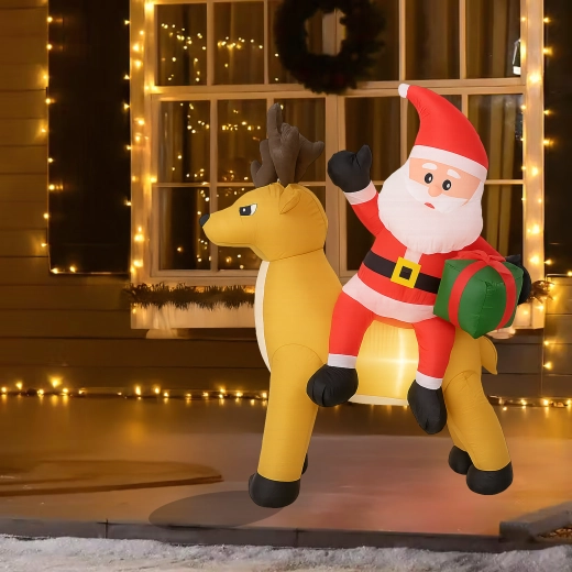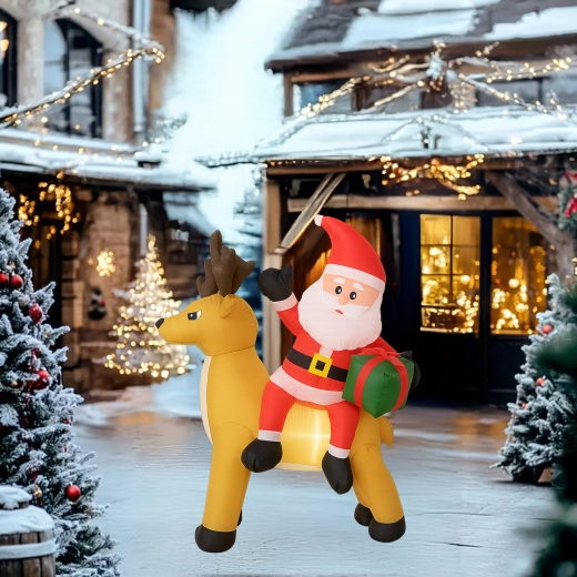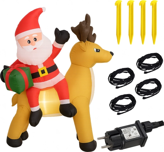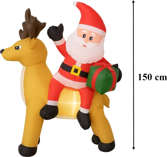 Een stijlvolle kerstdecoratie die de aandacht trekt van kinderen en volwassenen. De opblaasbare Kerstman met rendier creëert een betoverend tafereel bij de entree, in de tuin of in de woonkamer. De LED-verlichting zorgt voor een prachtig effect na zonsondergang, terwijl de stille automatische ventilator het opblazen in enkele minuten regelt.