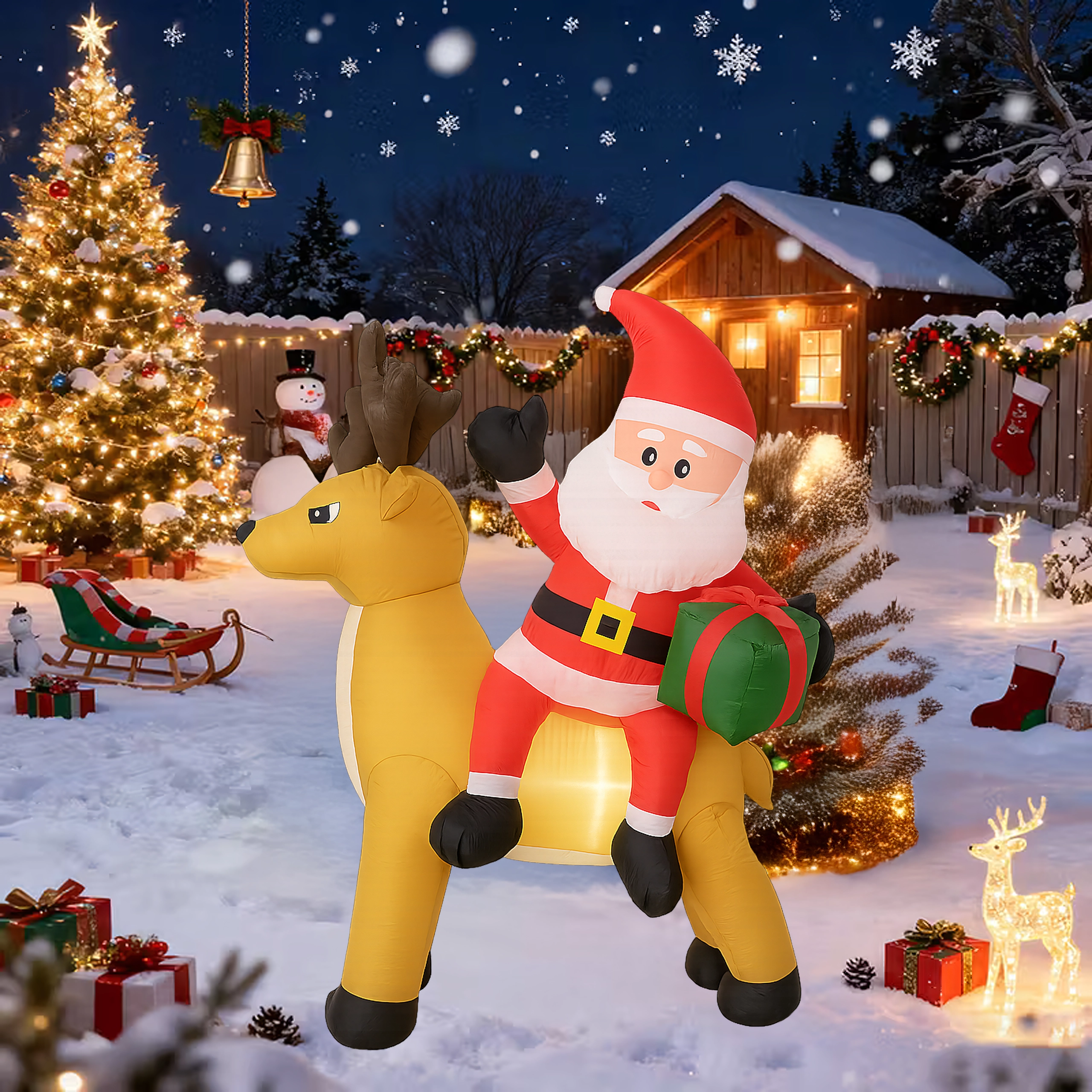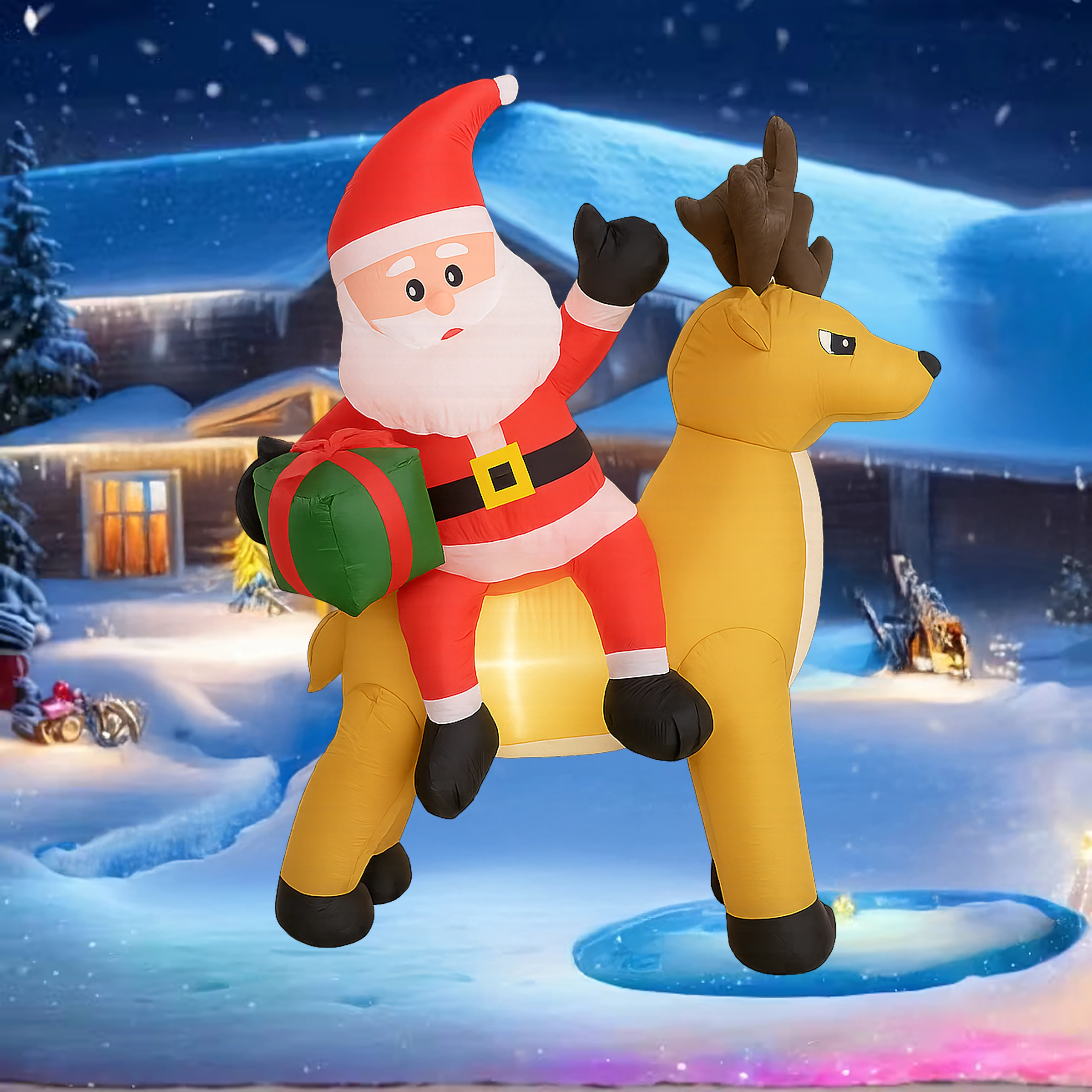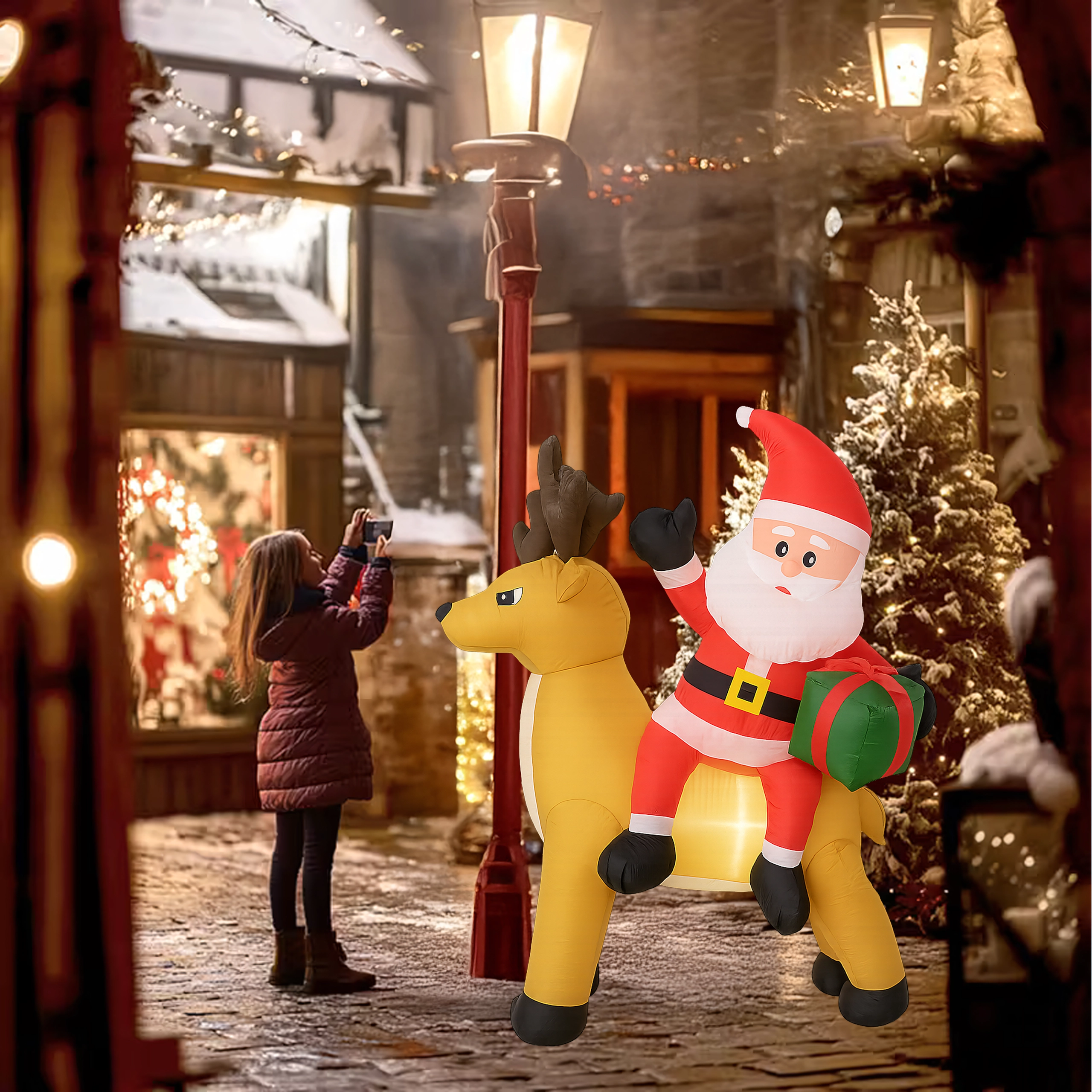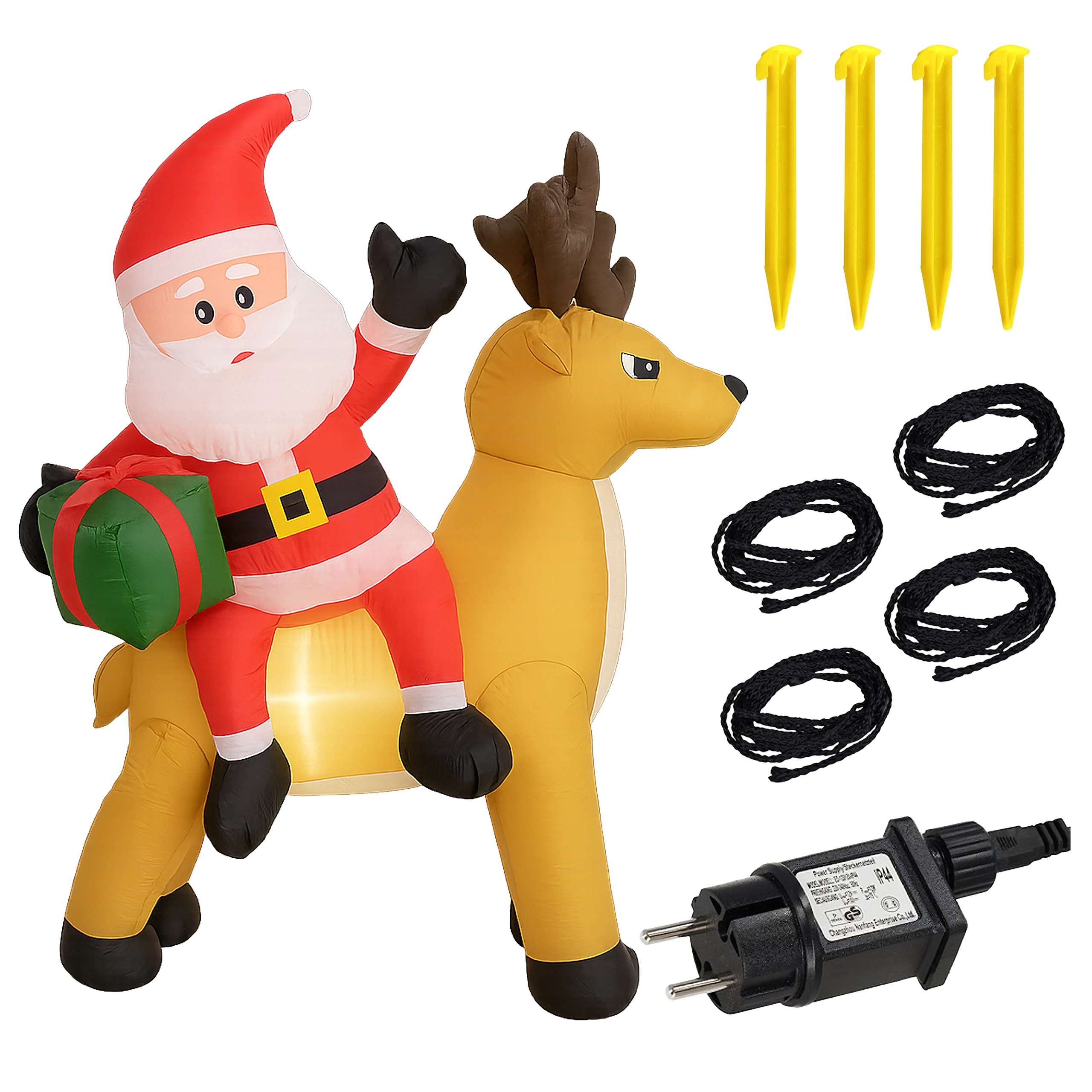 Een stijlvolle kerstdecoratie die de aandacht trekt van kinderen en volwassenen. De opblaasbare Kerstman met rendier creëert een betoverend tafereel bij de entree, in de tuin of in de woonkamer. De LED-verlichting zorgt voor een prachtig effect na zonsondergang, terwijl de stille automatische ventilator het opblazen in enkele minuten regelt.