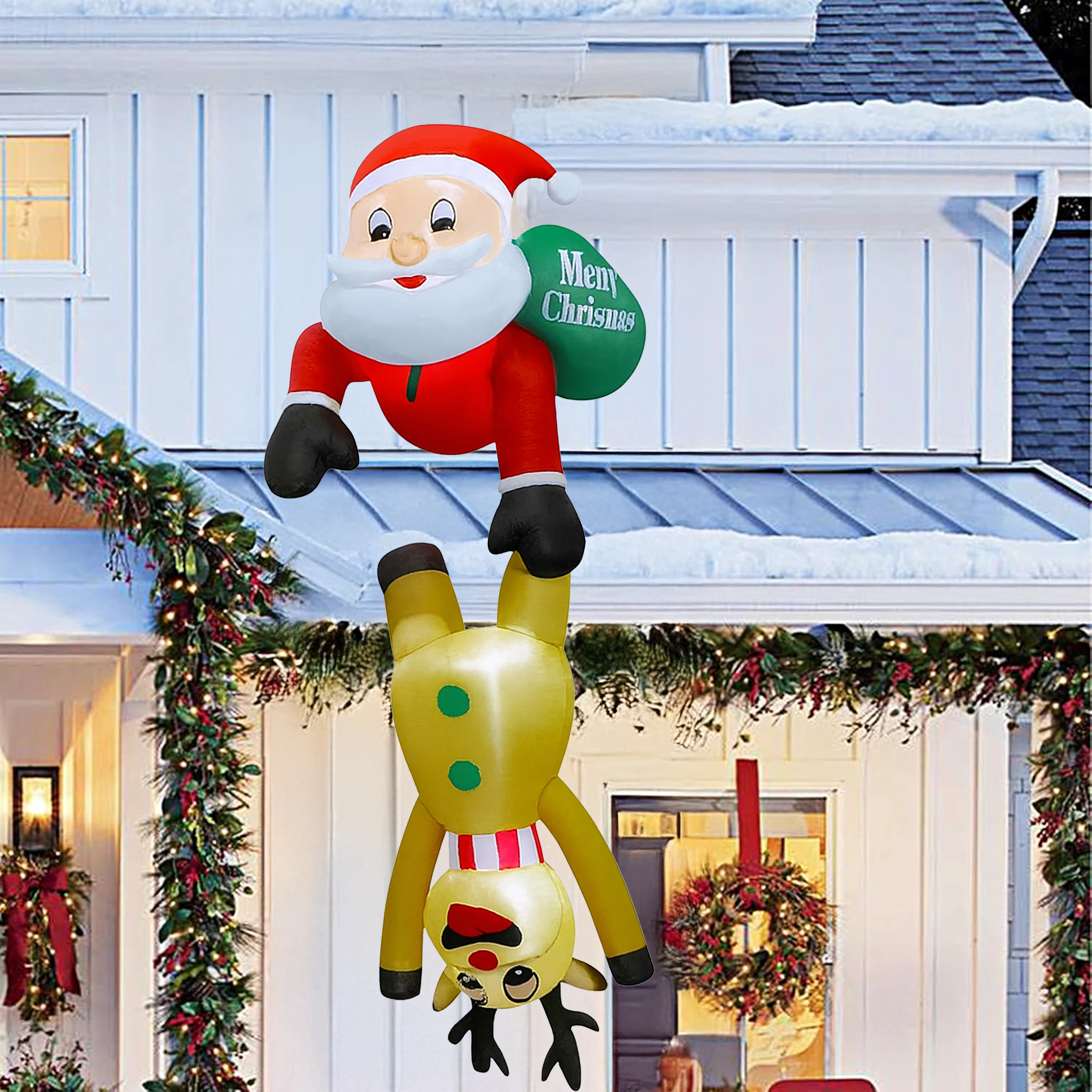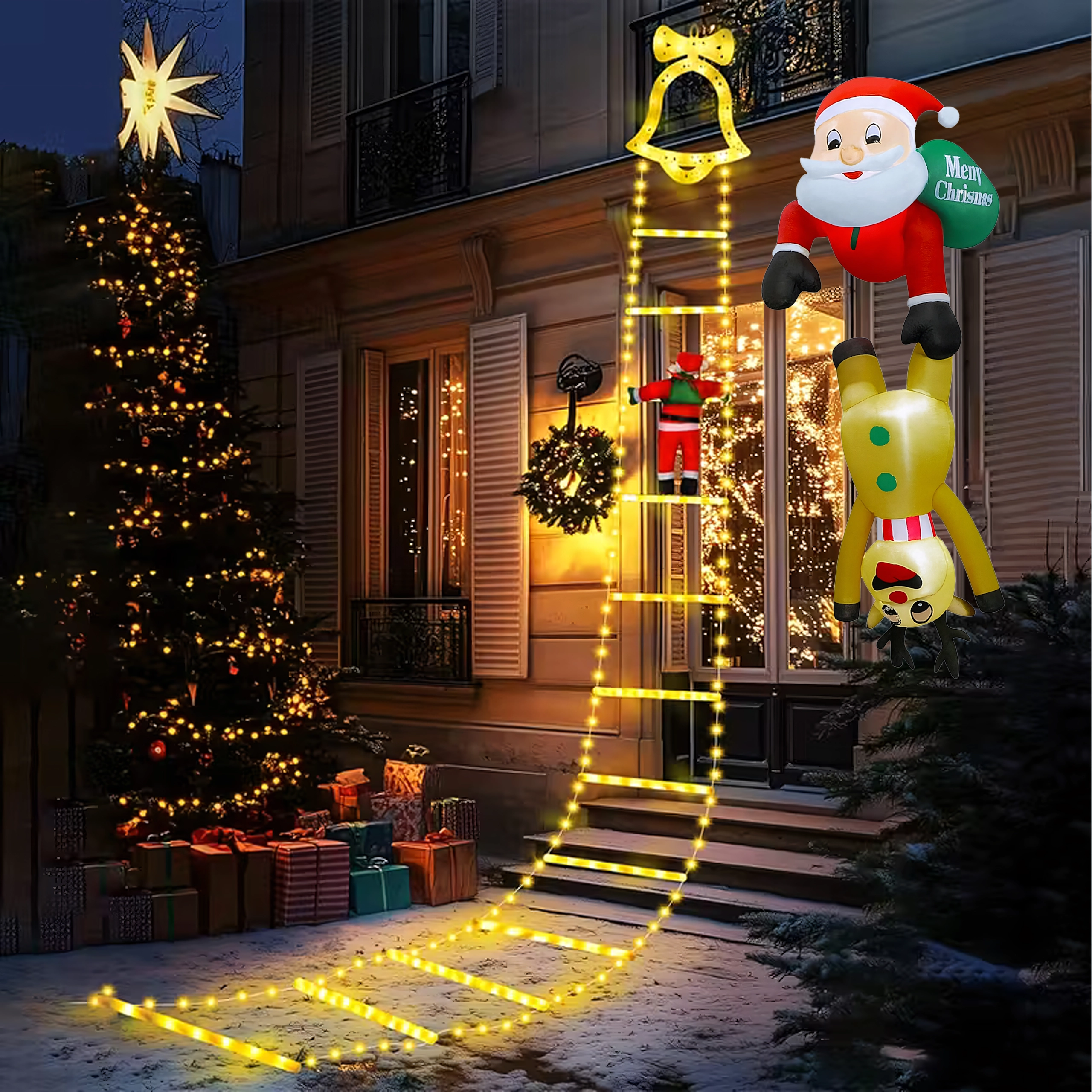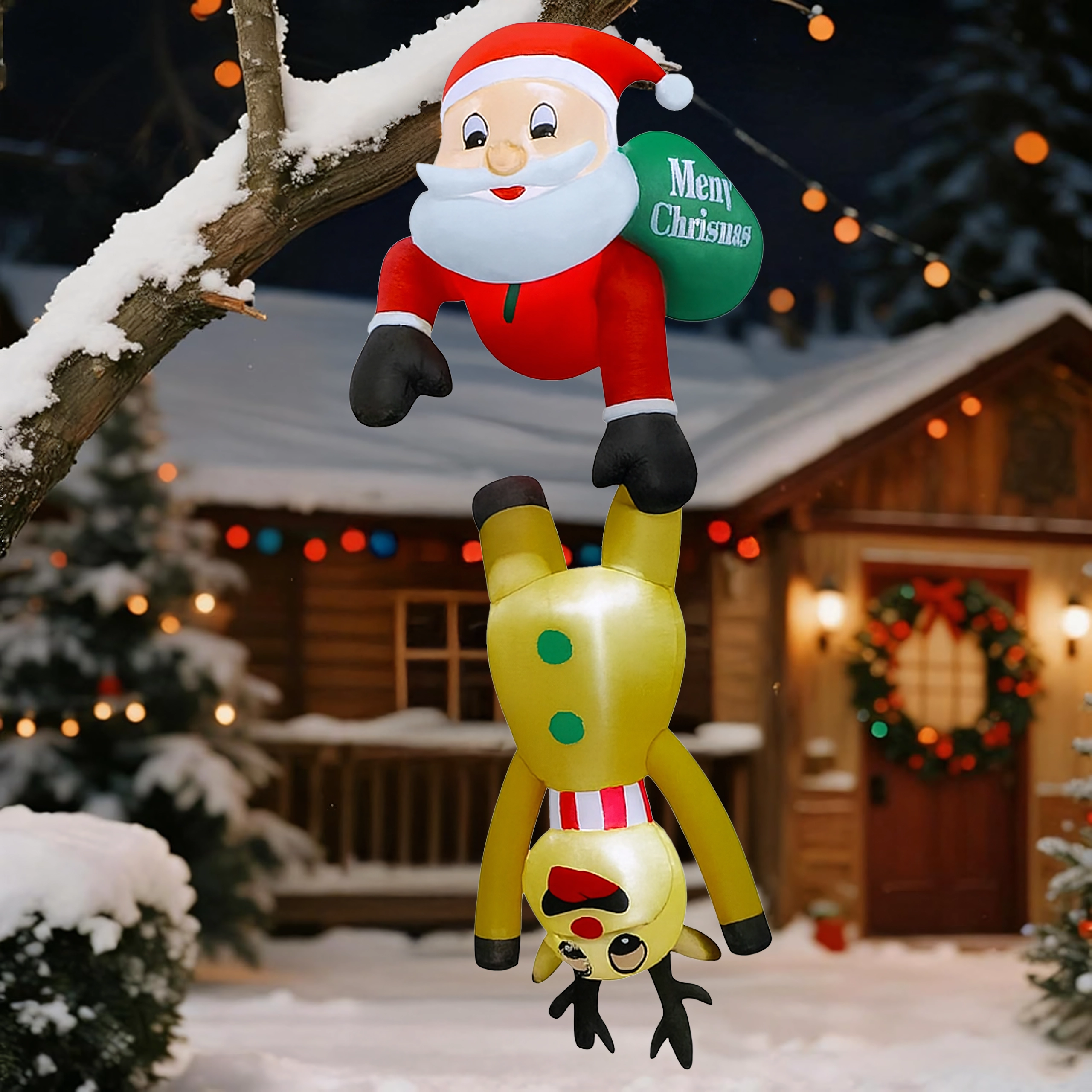 Deze originele kerstdecoratie trekt de aandacht met het speelse motief van Sint-Maarten die als het ware “hangt” aan het rendier en creëert een warme, feestelijke sfeer. De LED-verlichting zorgt voor een opvallend effect tijdens donkere winteravonden, terwijl de sterke polyester bestand is tegen wisselende weersomstandigheden.