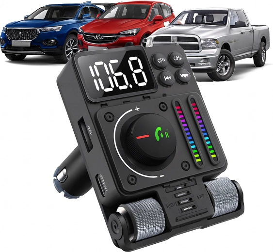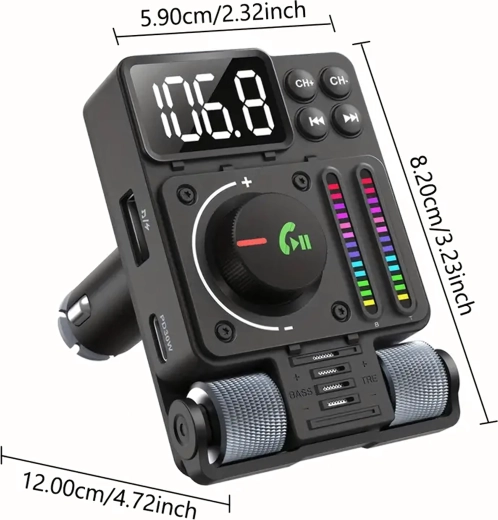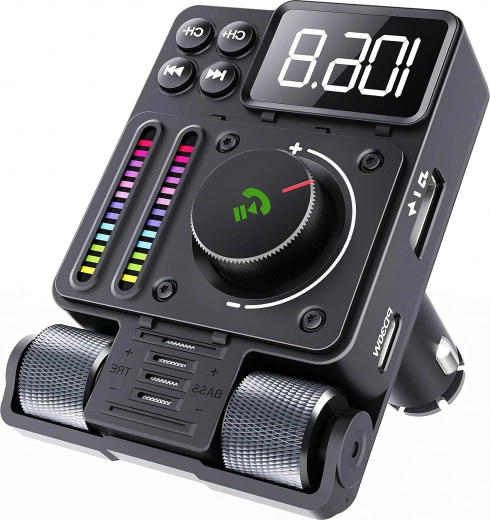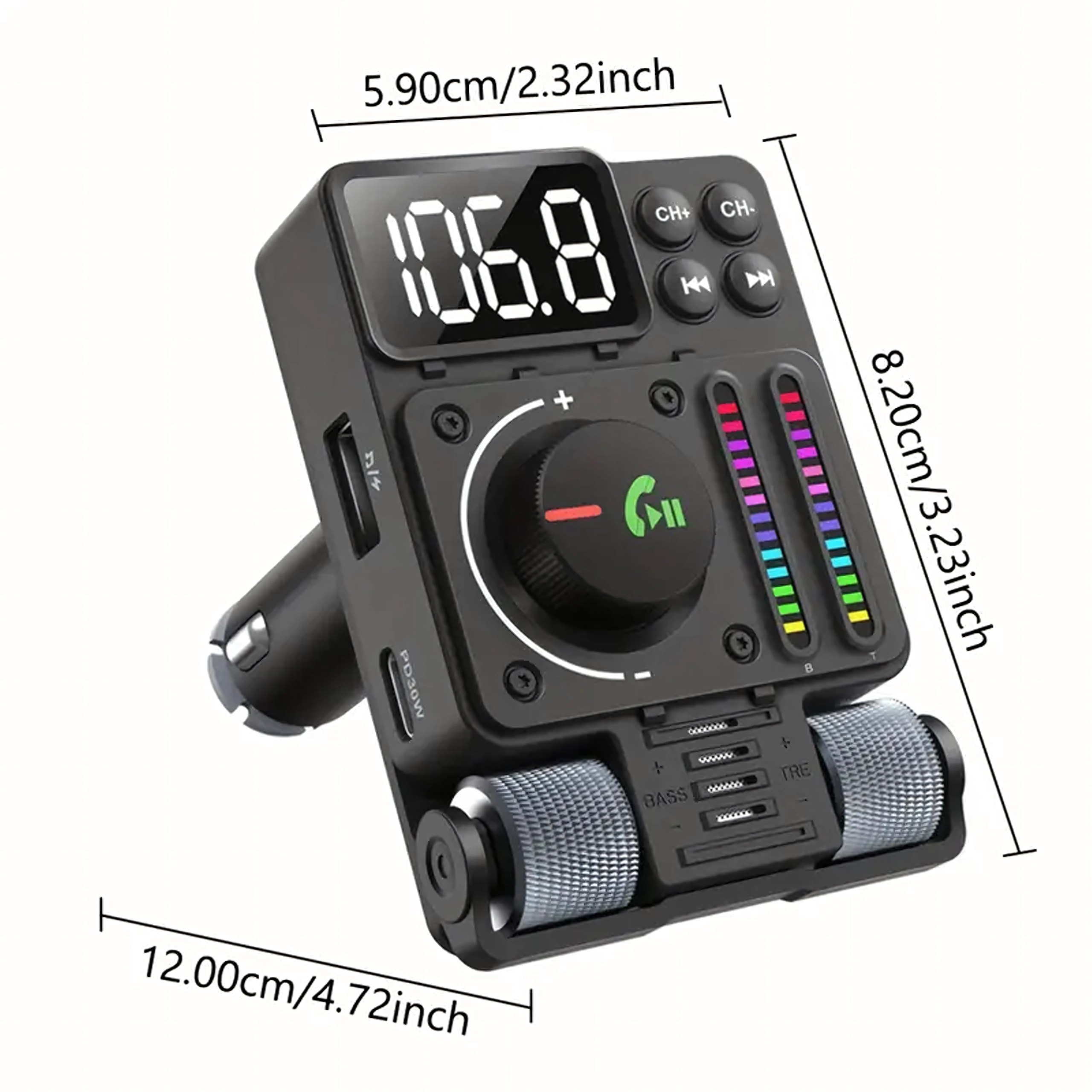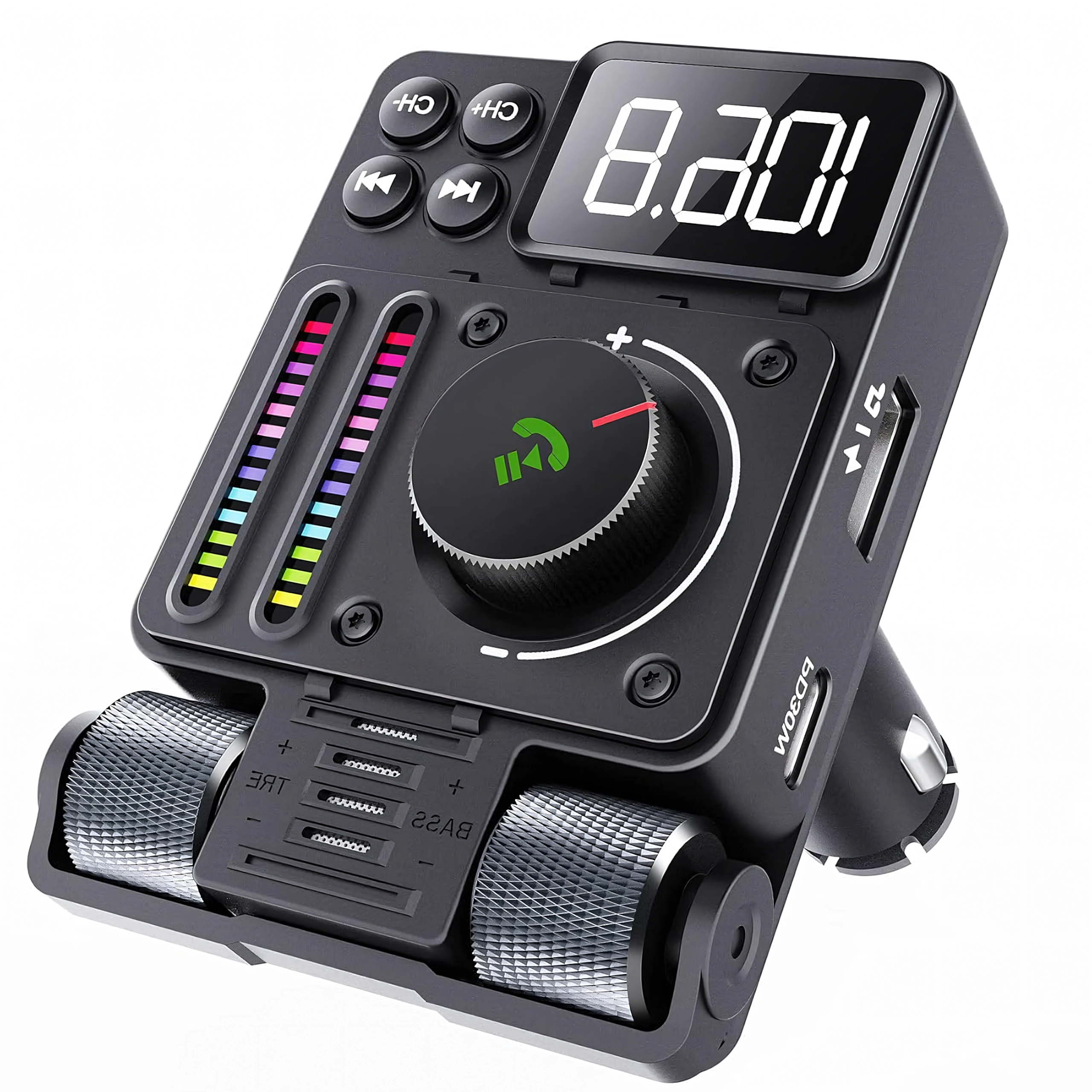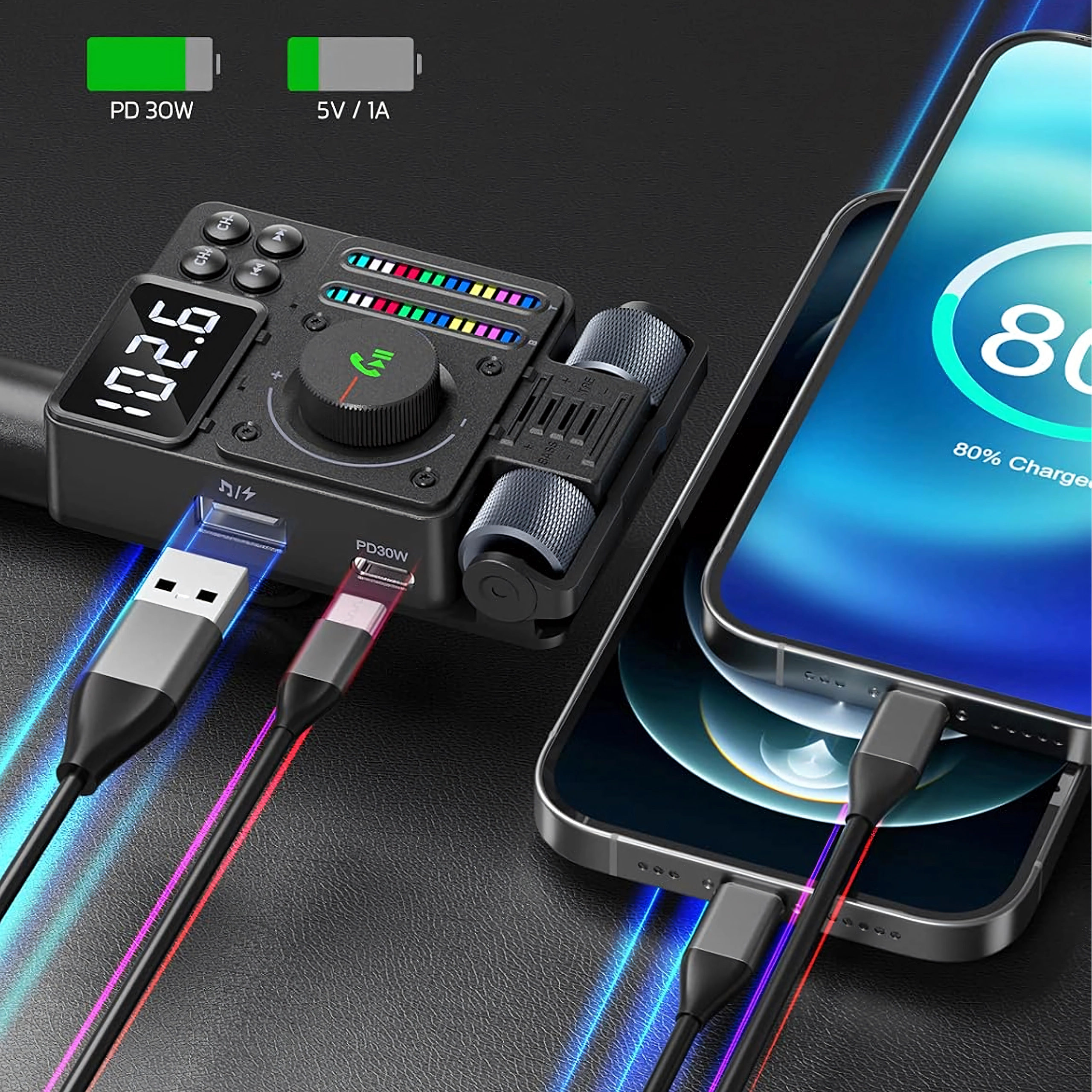 Multifunctionele Bluetooth 5.3 FM-transmitter voor in de auto met snel laden PD 30 W biedt muziekstreaming, heldere handsfree-gesprekken en kleurige LED-achtergrondverlichting. Ideaal voor comfortabel en modern gebruik van accessoires in uw auto.