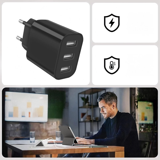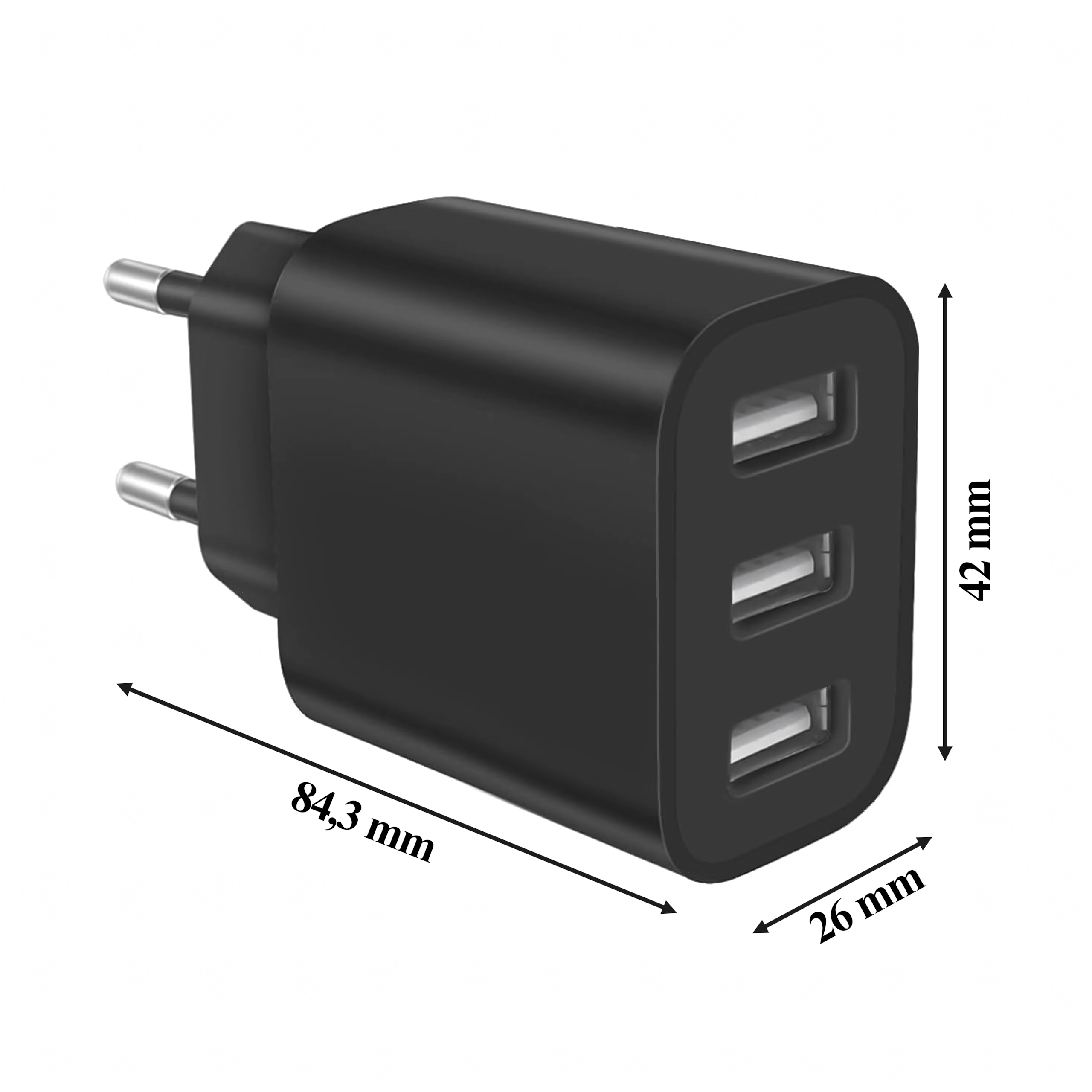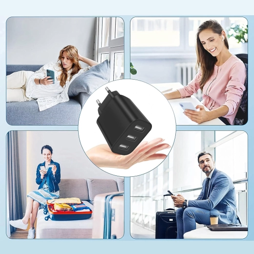 Compacte en krachtige netlader met 3 USB‑poorten biedt snel en veilig opladen voor maximaal drie apparaten tegelijk. Dankzij de totale output van 5V/3,4A en overspanningsbeveiliging is hij ideaal voor thuis en op reis.