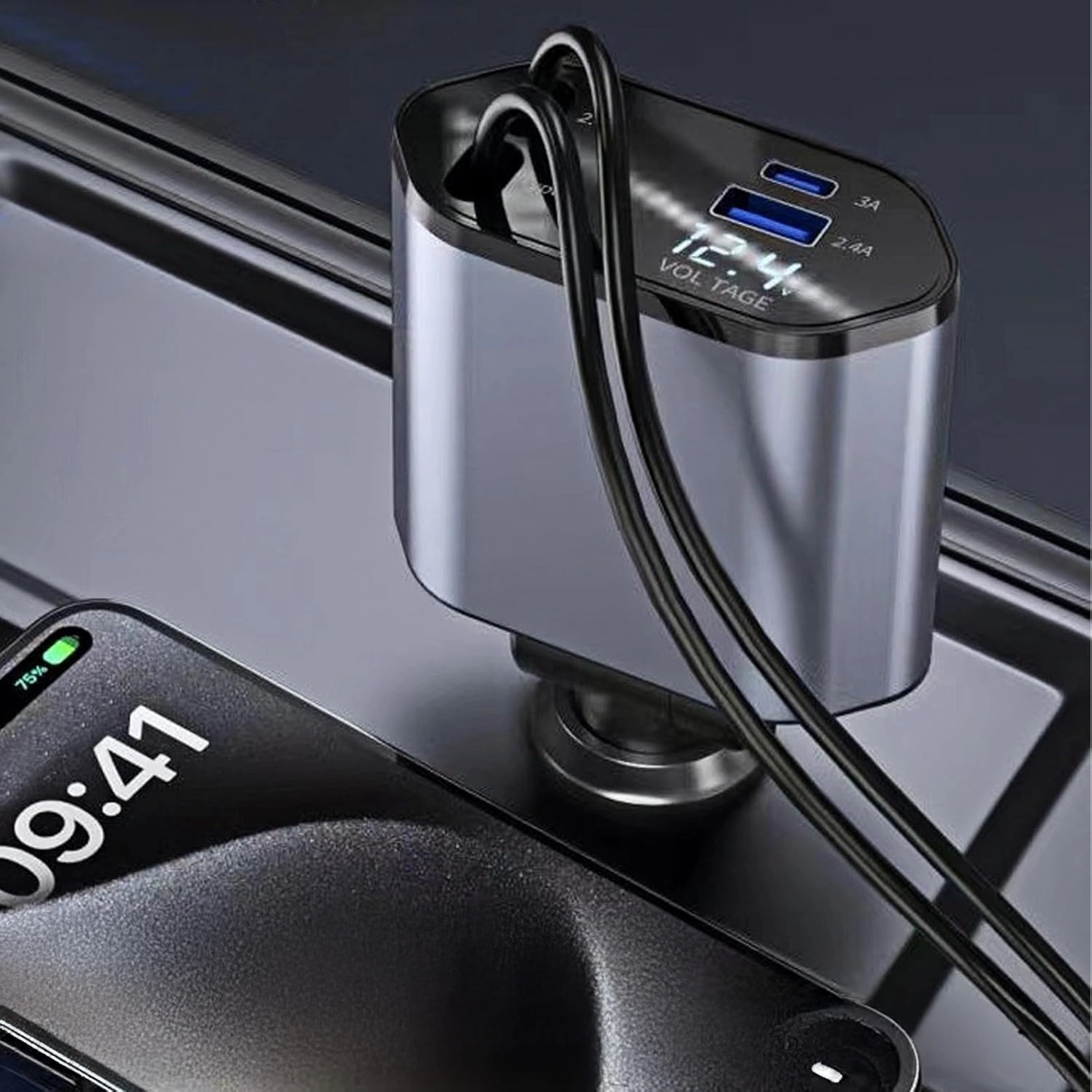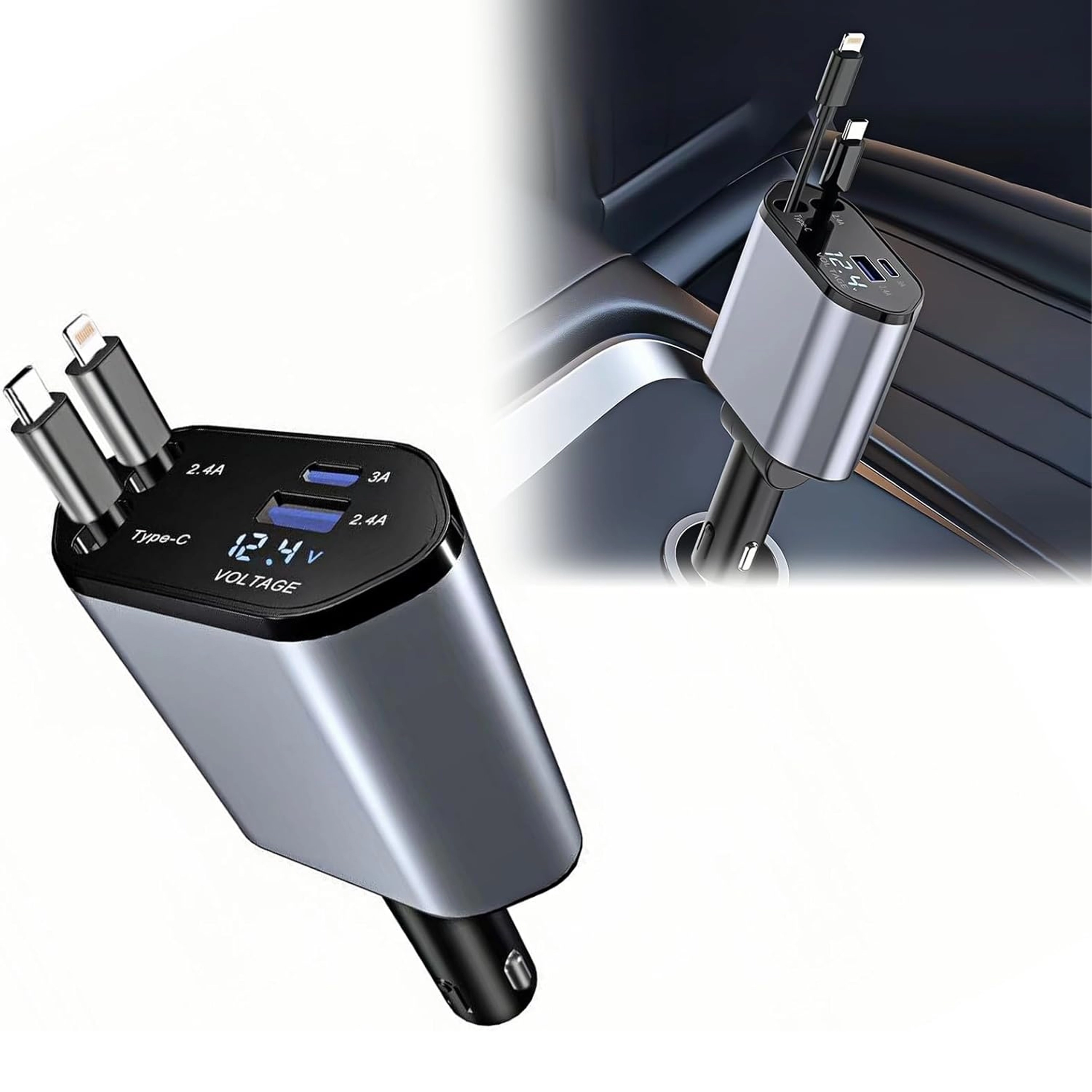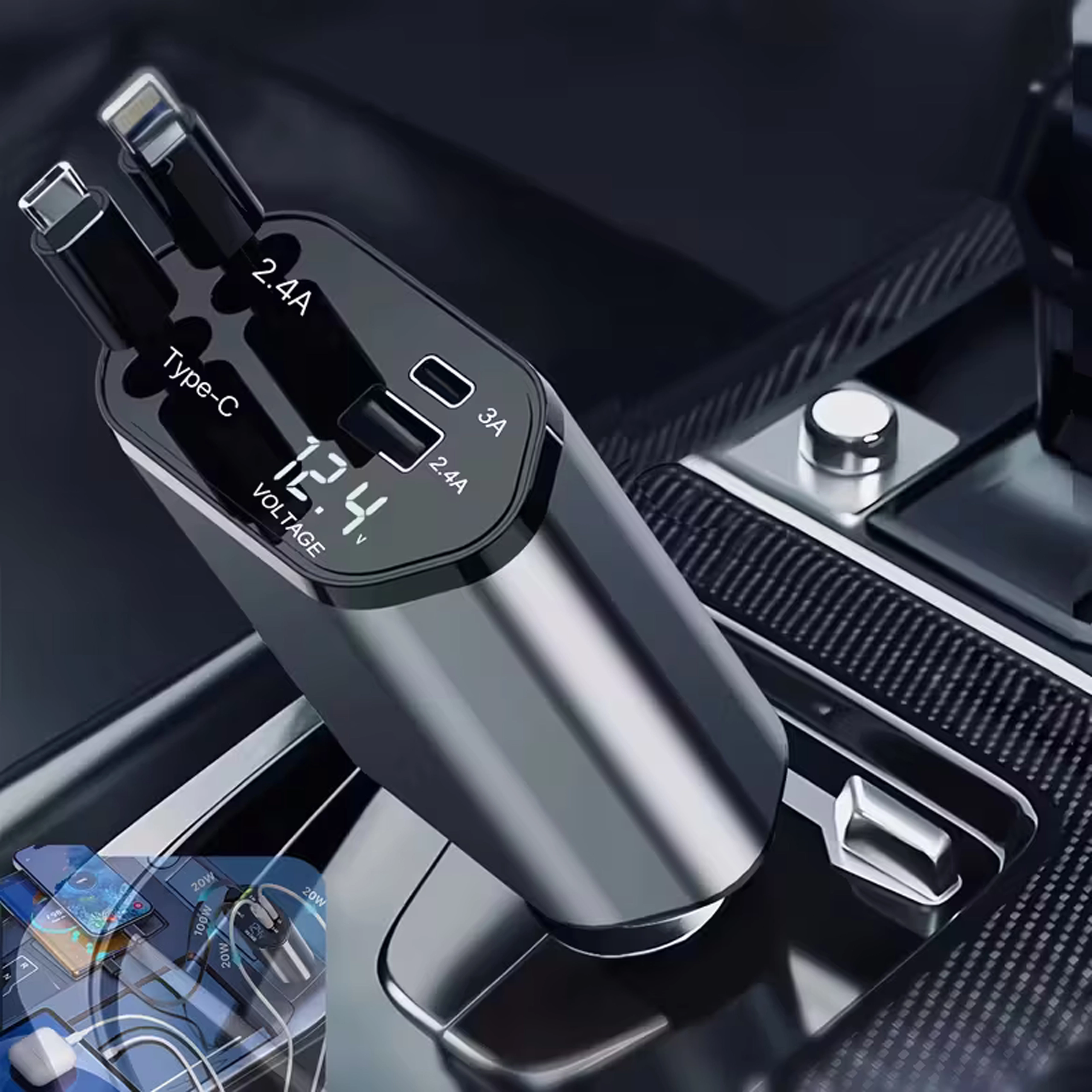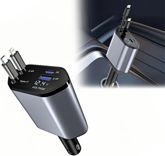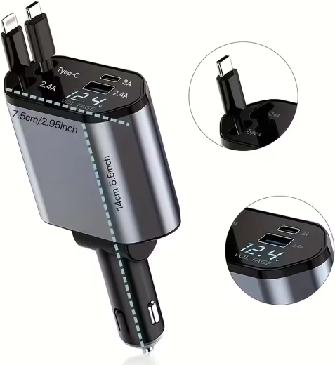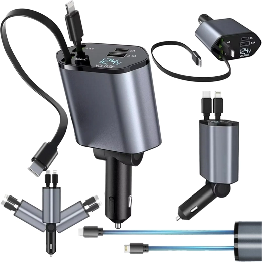Deze moderne 4-in-1 autolader combineert hoge prestaties met praktisch gebruik. 100 W snelladen levert energie voor zelfs de meest veeleisende apparaten, terwijl de intelligente chip beschermt tegen overspanning, oververhitting en kortsluiting. Dankzij de oprolbare kabels blijft het interieur van de auto netjes en zijn de kabels altijd op de ideale lengte.