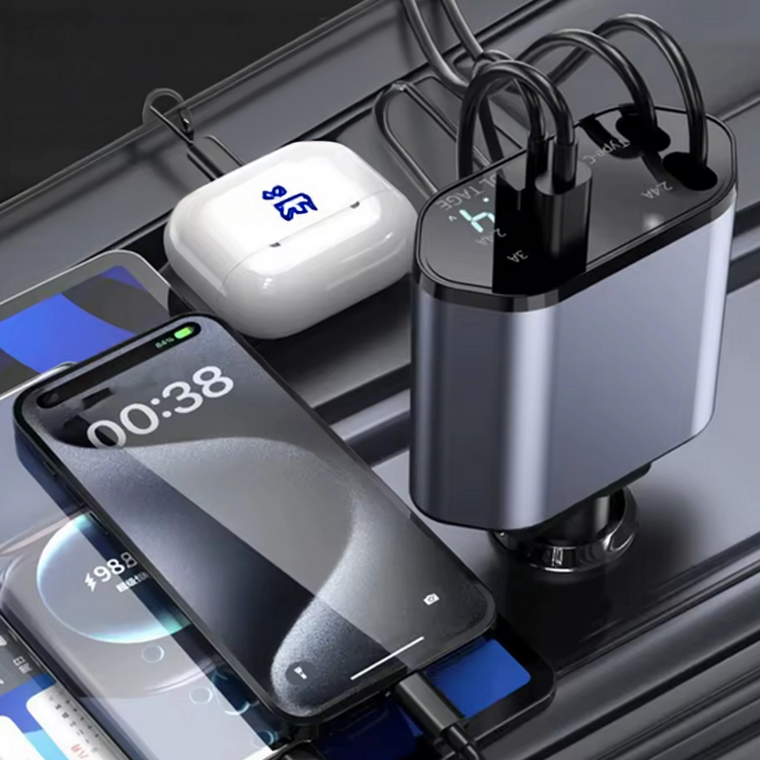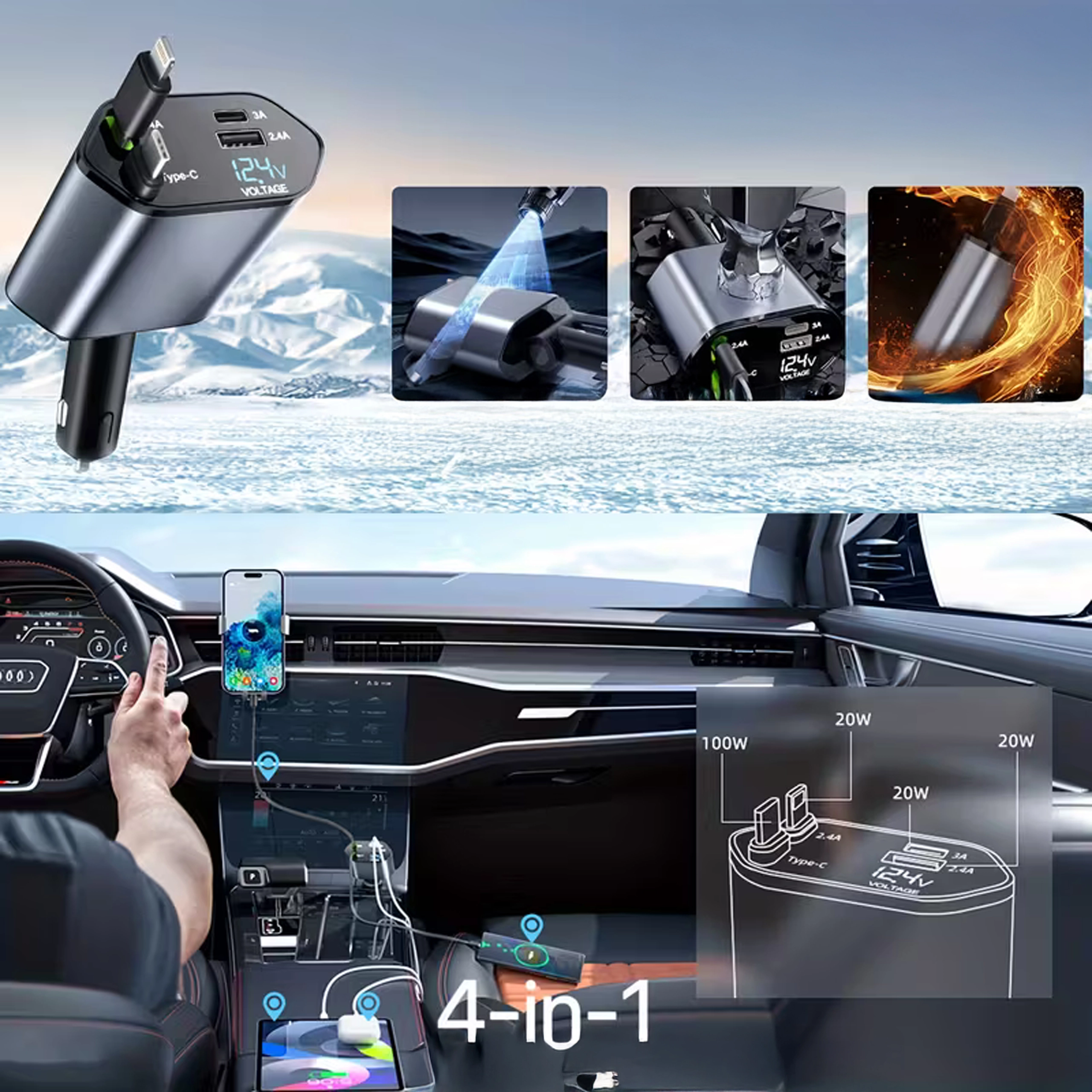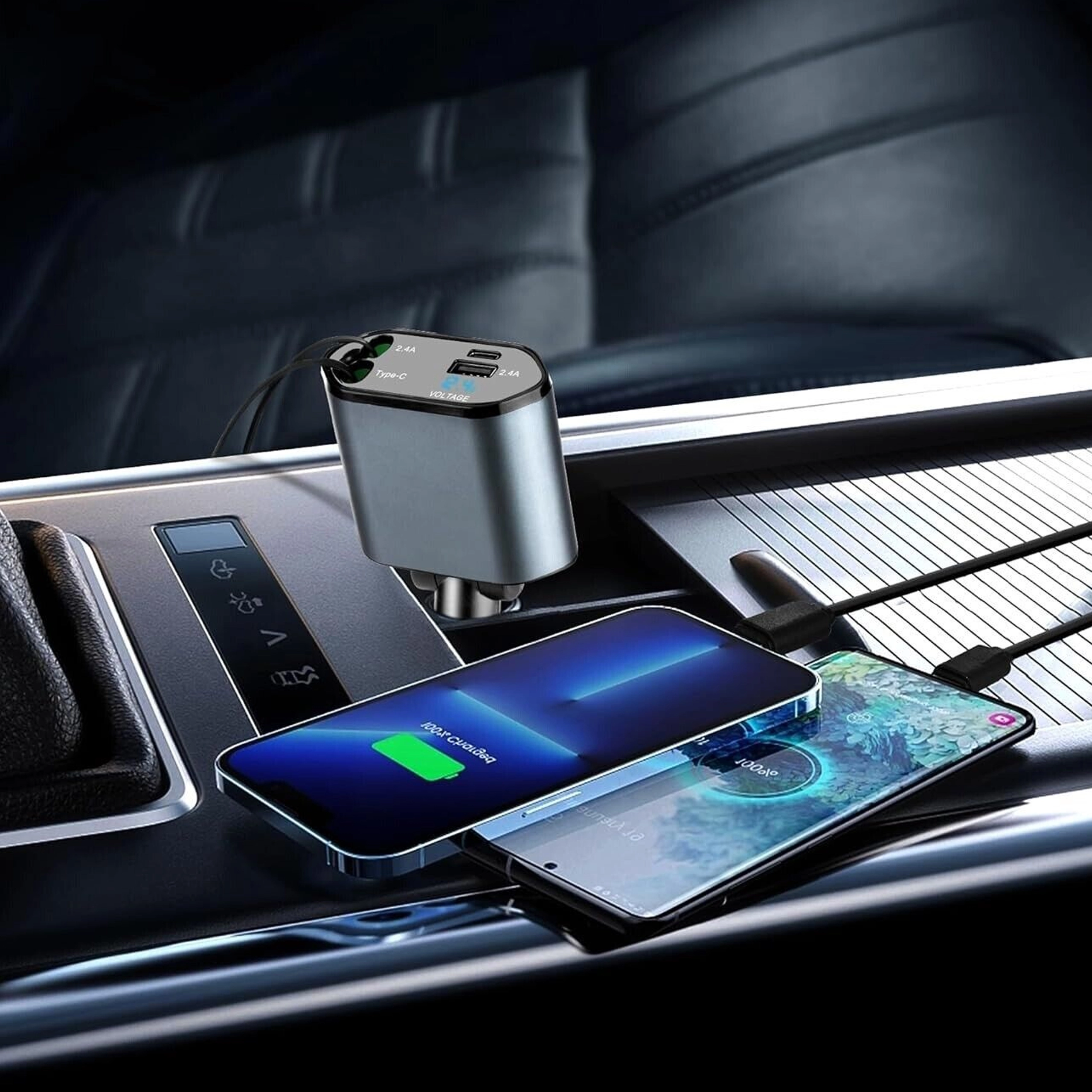 Deze moderne 4-in-1 autolader combineert hoge prestaties met praktisch gebruik. 100 W snelladen levert energie voor zelfs de meest veeleisende apparaten, terwijl de intelligente chip beschermt tegen overspanning, oververhitting en kortsluiting. Dankzij de oprolbare kabels blijft het interieur van de auto netjes en zijn de kabels altijd op de ideale lengte.