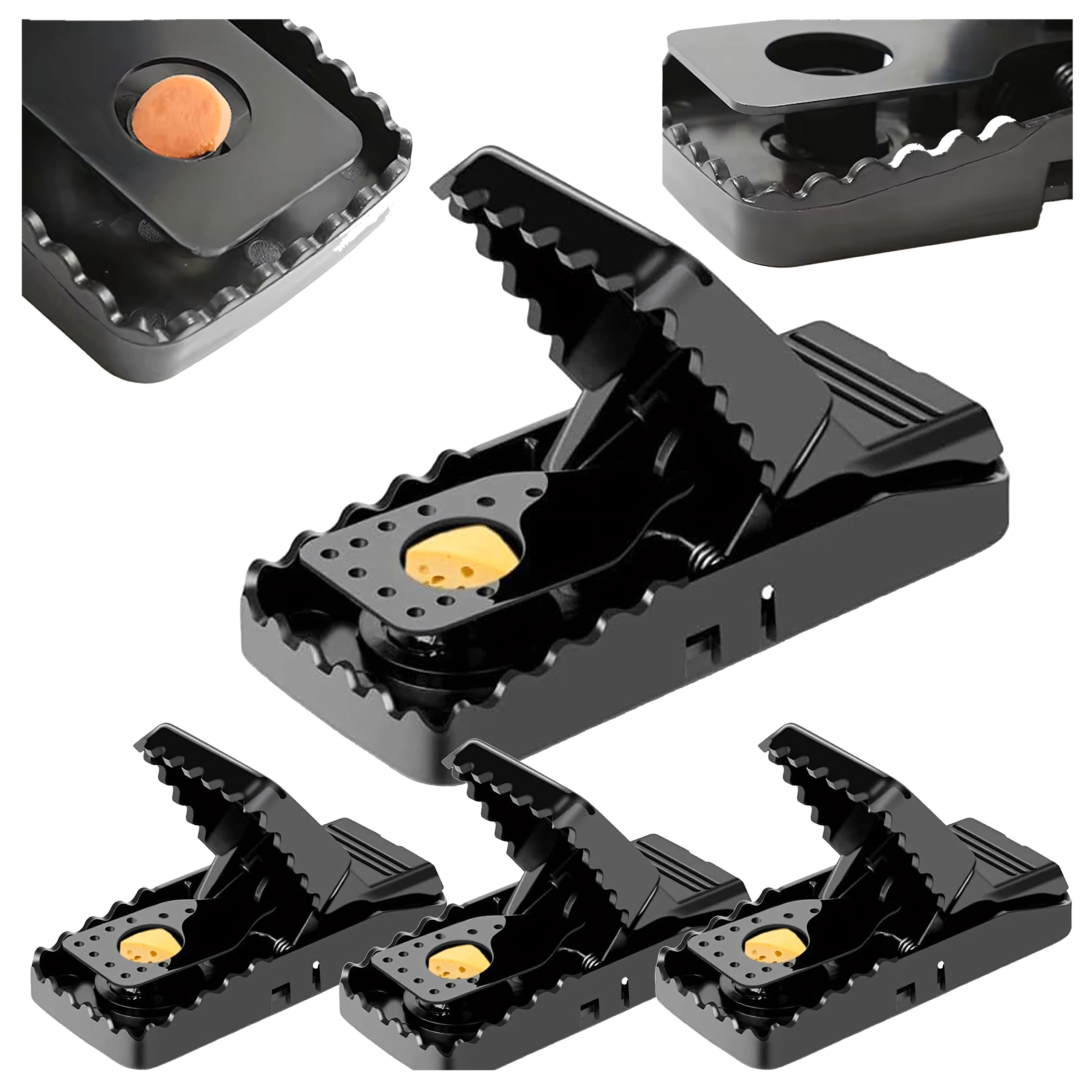 Praktische set van 4 muizen- en rattenvallen van duurzaam kunststof voor snelle en hygiënische bestrijding van knaagdieren in huis. De val heeft een sterke veer, eenvoudige afstelling met een hendel en een geïntegreerd lokaasreservoir voor veilig en effectief gebruik in de keuken, voorraadkast, garage of kelder.