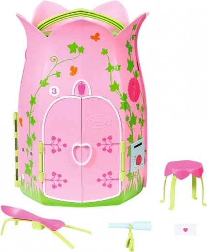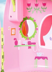 Ontdek een wereld vol fantasie met het Huisje Schrijfverhalen BABY born, waar elke hoek inspireert tot nieuwe verhalen. Bij het openen van het bloemvormige huis verschijnt een prachtige binnenkant met een tafeltje, open haard en een schommel die aan het plafond van de speelkamer hangt. In de wand zit een vakje om de toverstaf op te bergen, zodat het spel nooit stopt.