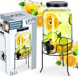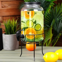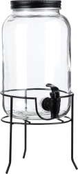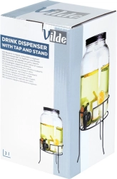 Stijlvolle glazen dispenser met een inhoud van 3,2 l, voorzien van een schroefdeksel, kraantje en een stevige metalen standaard voor comfortabel uitschenken. Ideaal voor limonades, punches, ijsthee en water met fruit. Het heldere glas accentueert de inhoud prachtig, terwijl de stabiele standaard met pootjes zorgt voor comfortabel gebruik thuis, in de tuin en tijdens feestjes.