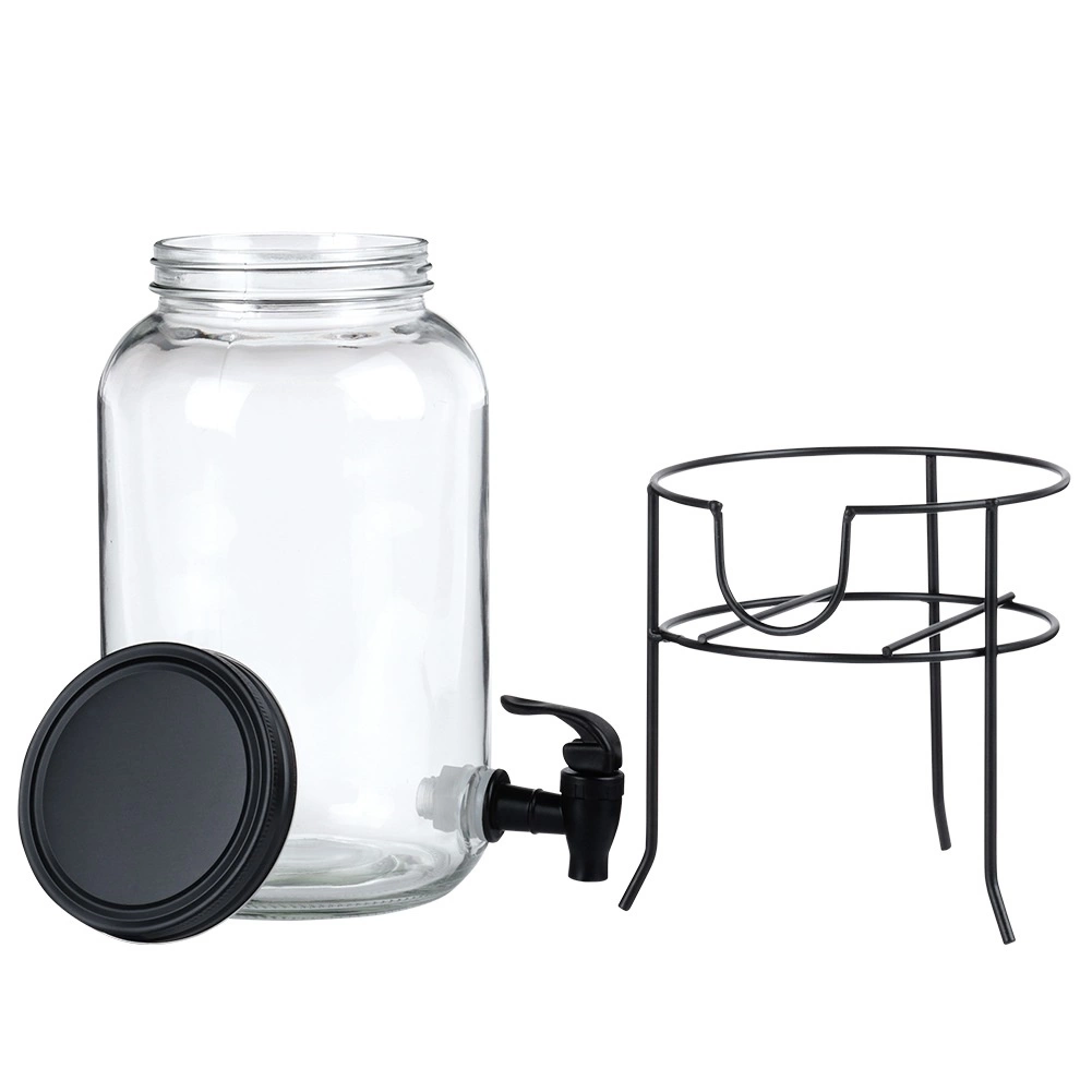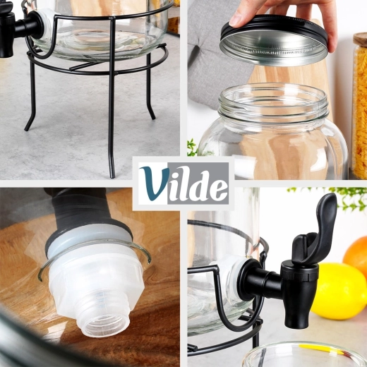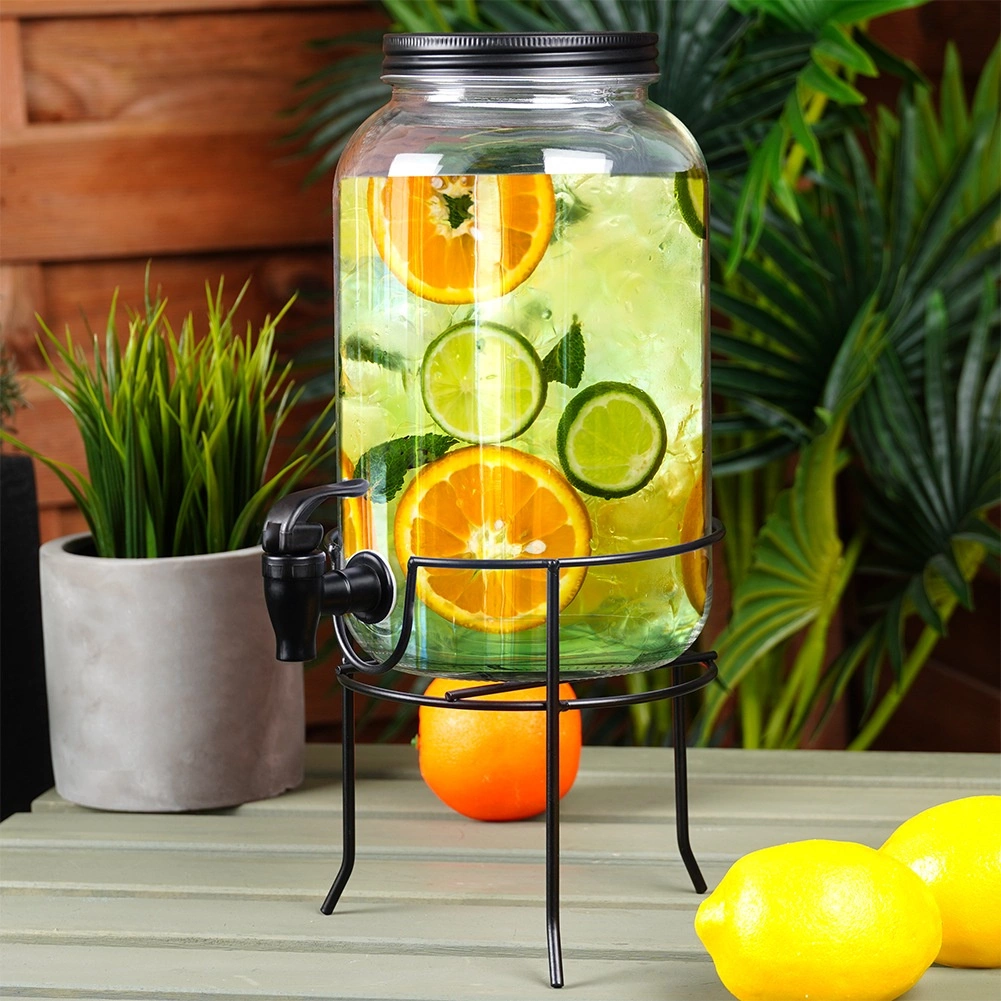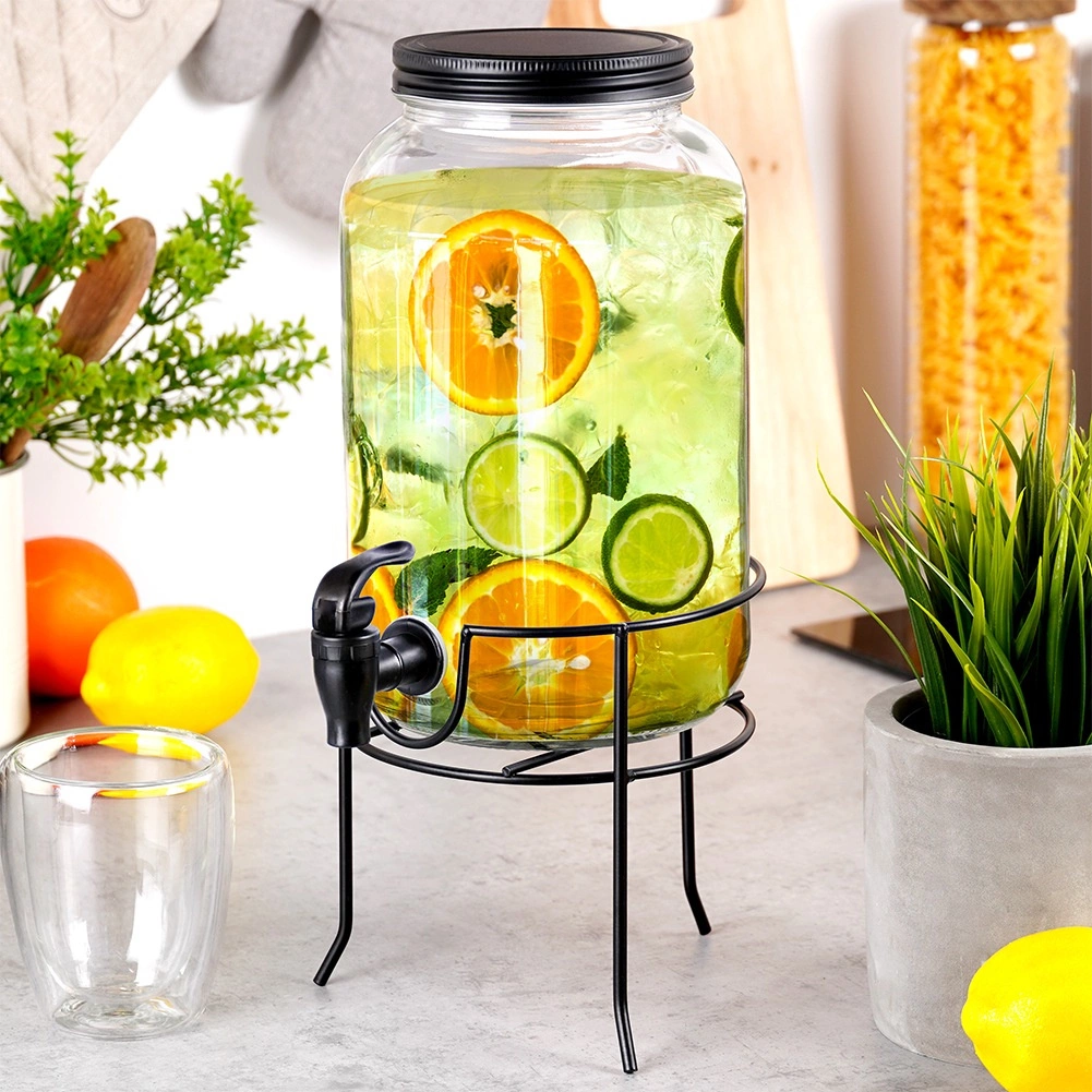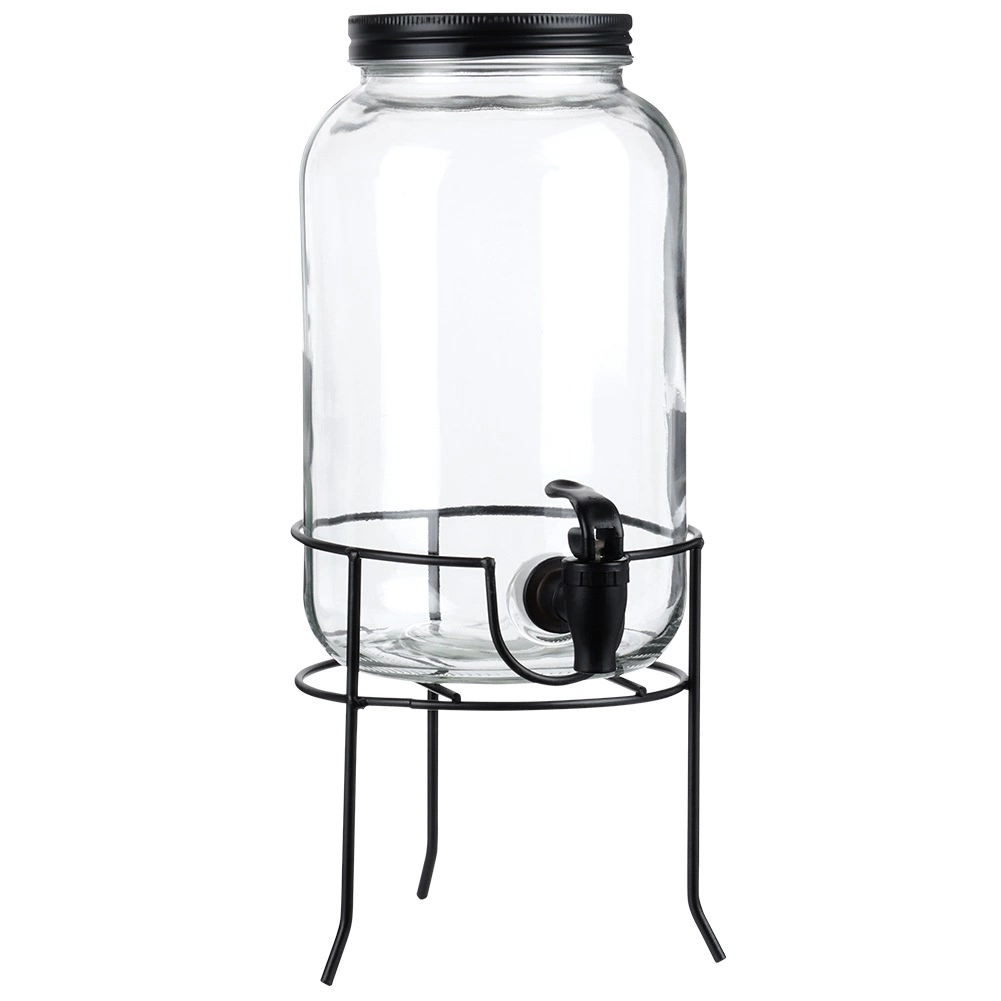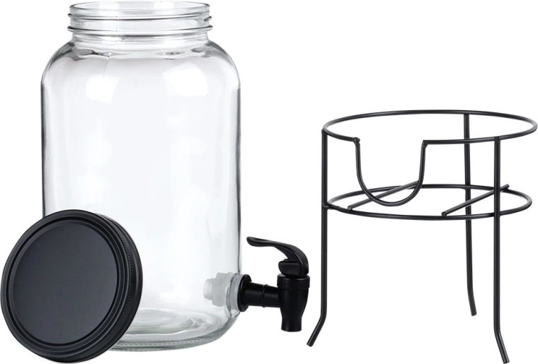 Praktische drankdispenser van hoogwaardig dik glas met een zwart kraantje en een mat zwart deksel, zodat je verfrissende dranken beschermd blijven tegen insecten en verontreinigingen. De stabiele metalen standaard brengt de kan op de ideale hoogte voor glazen, waardoor schenken schoon en comfortabel is.