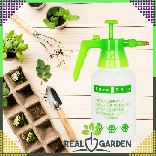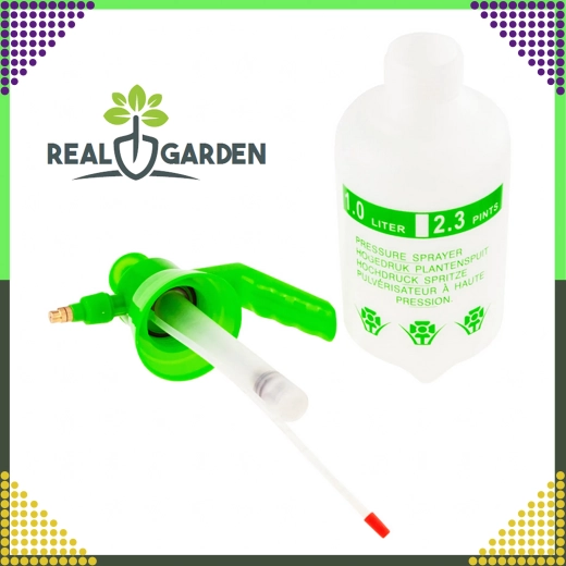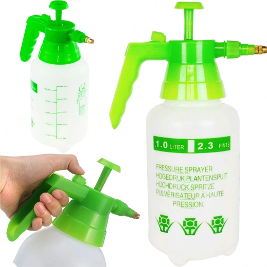 Praktische handmatige drukspuit met een inhoud van 1 l in het groen, ideaal voor de dagelijkse verzorging van planten in huis, in de tuin en op het vakantieverblijf. Biedt een lichtgewicht constructie, eenvoudige bediening en betrouwbare, gelijkmatige verneveling voor begieten, benevelen en het aanbrengen van meststoffen of beschermingsmiddelen.