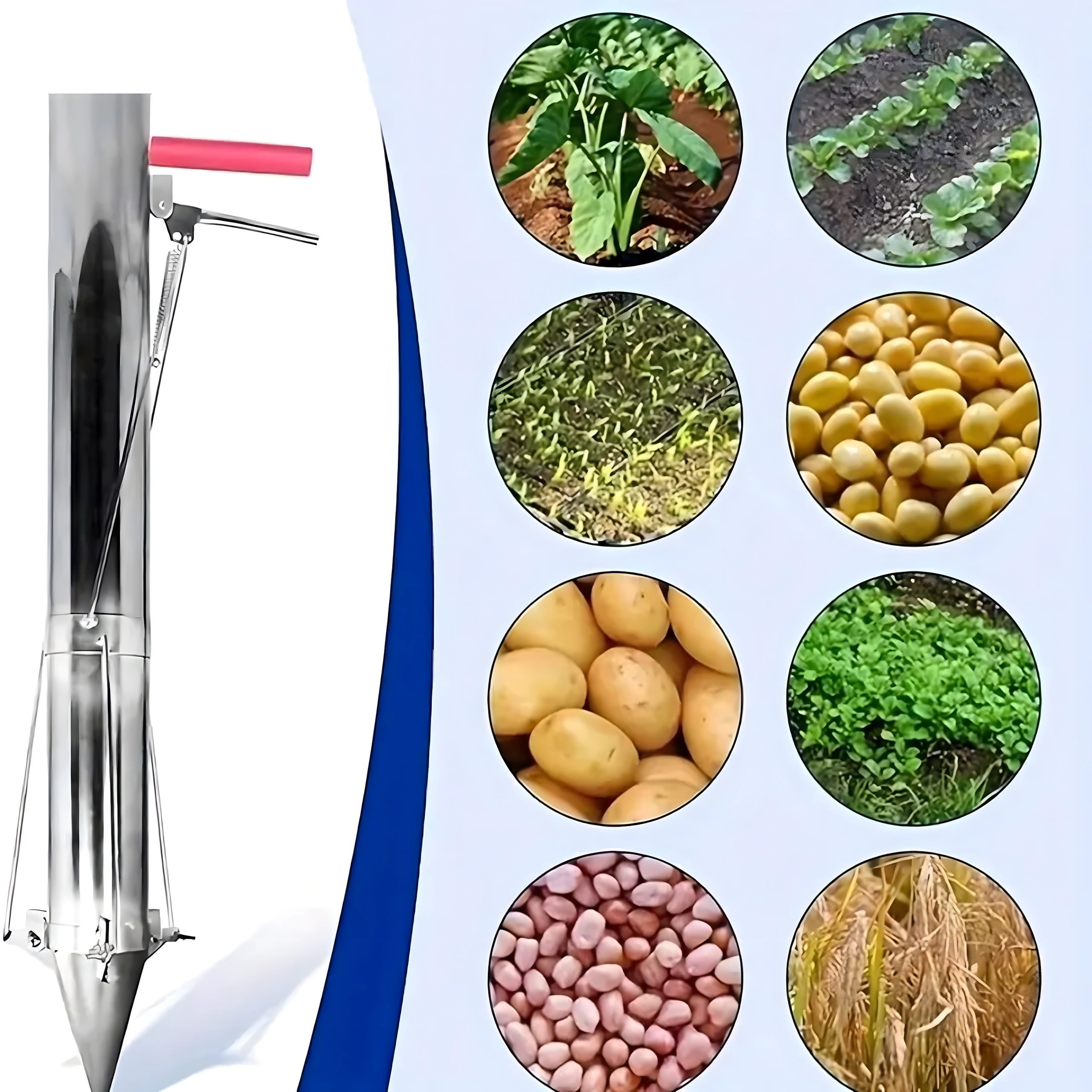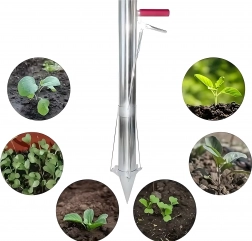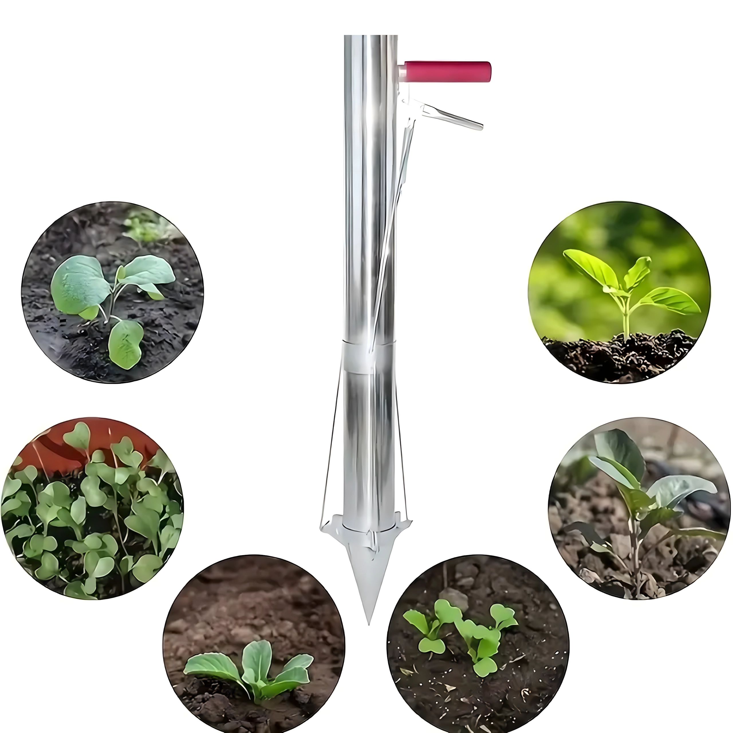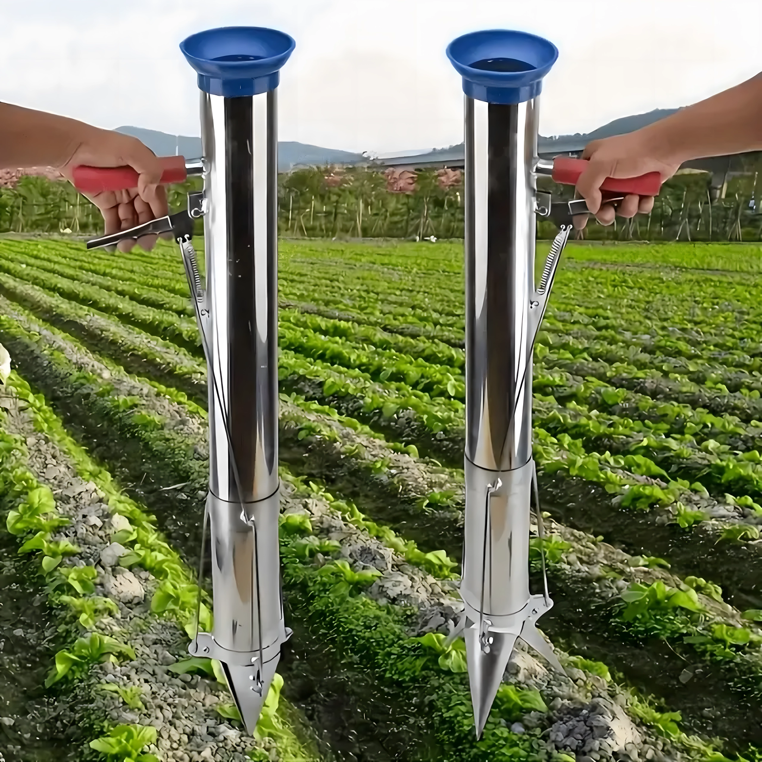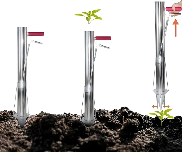 De conische punt en cilindrische behuizing maken met één druk een nette opening; plaats de zaailing en laat de grond eenvoudig terugvallen met de hendel.