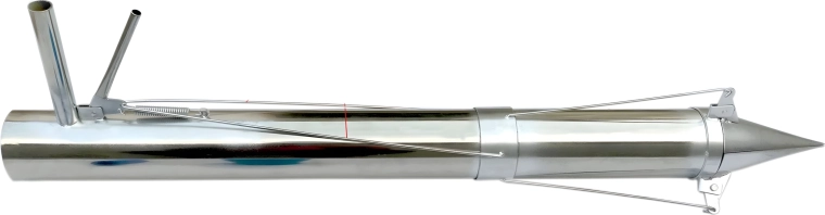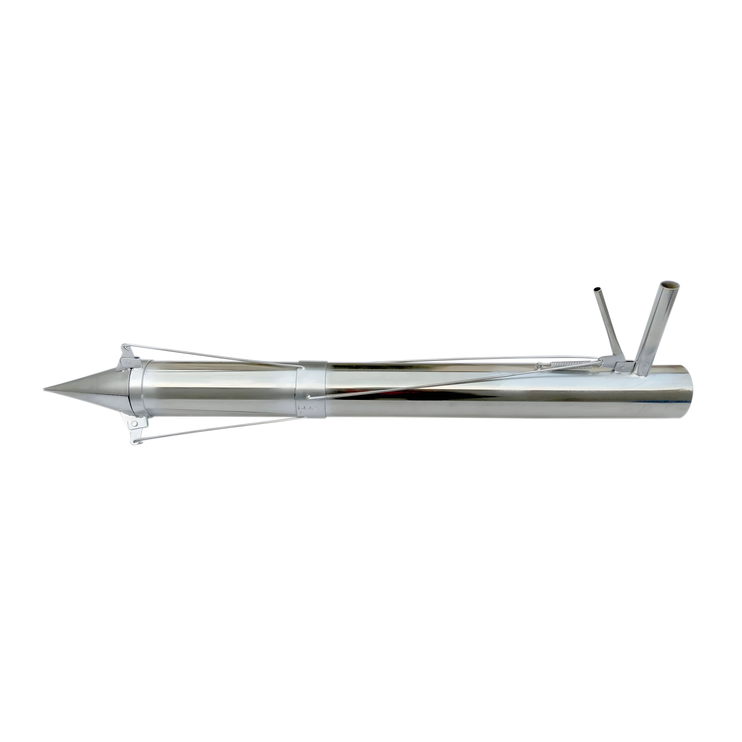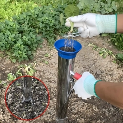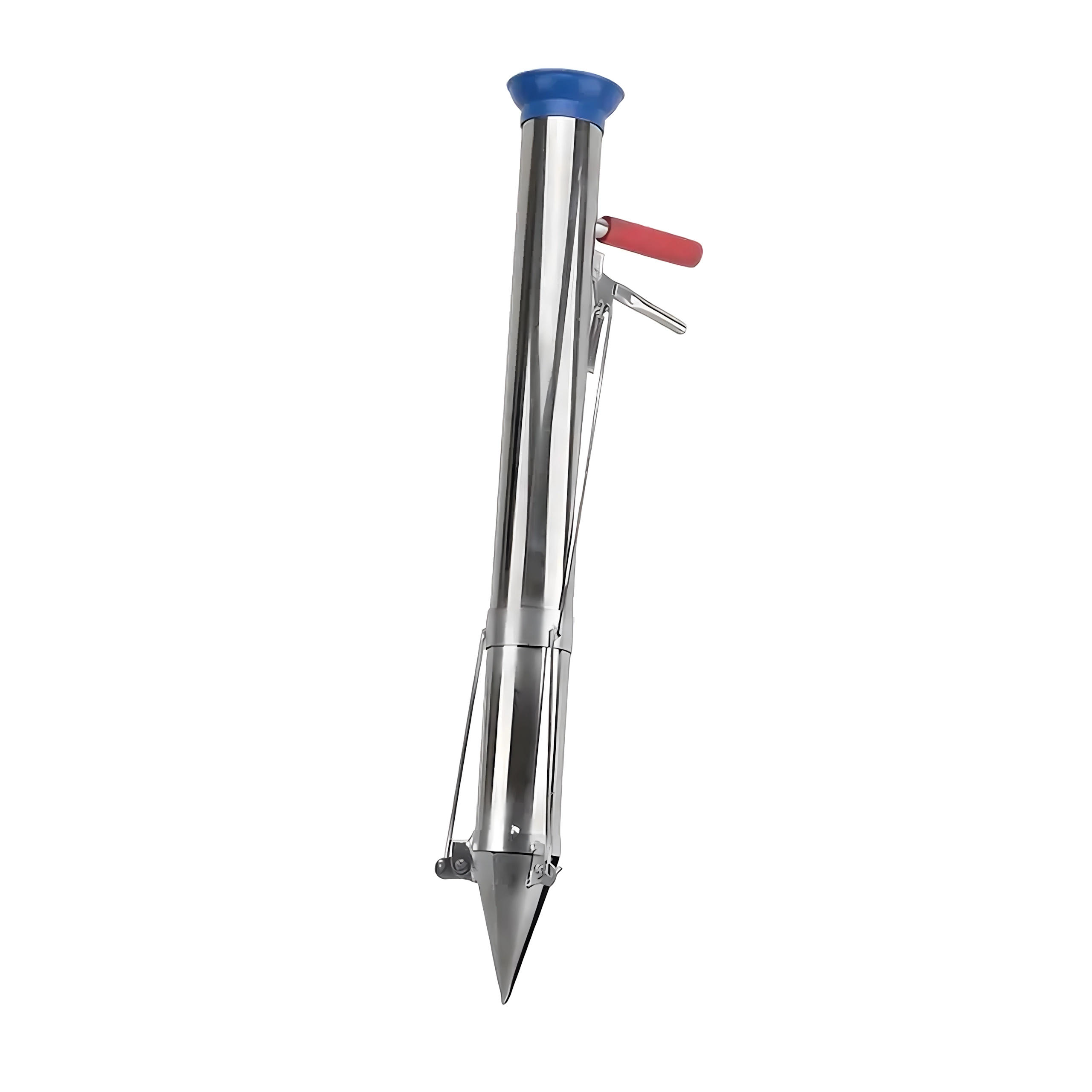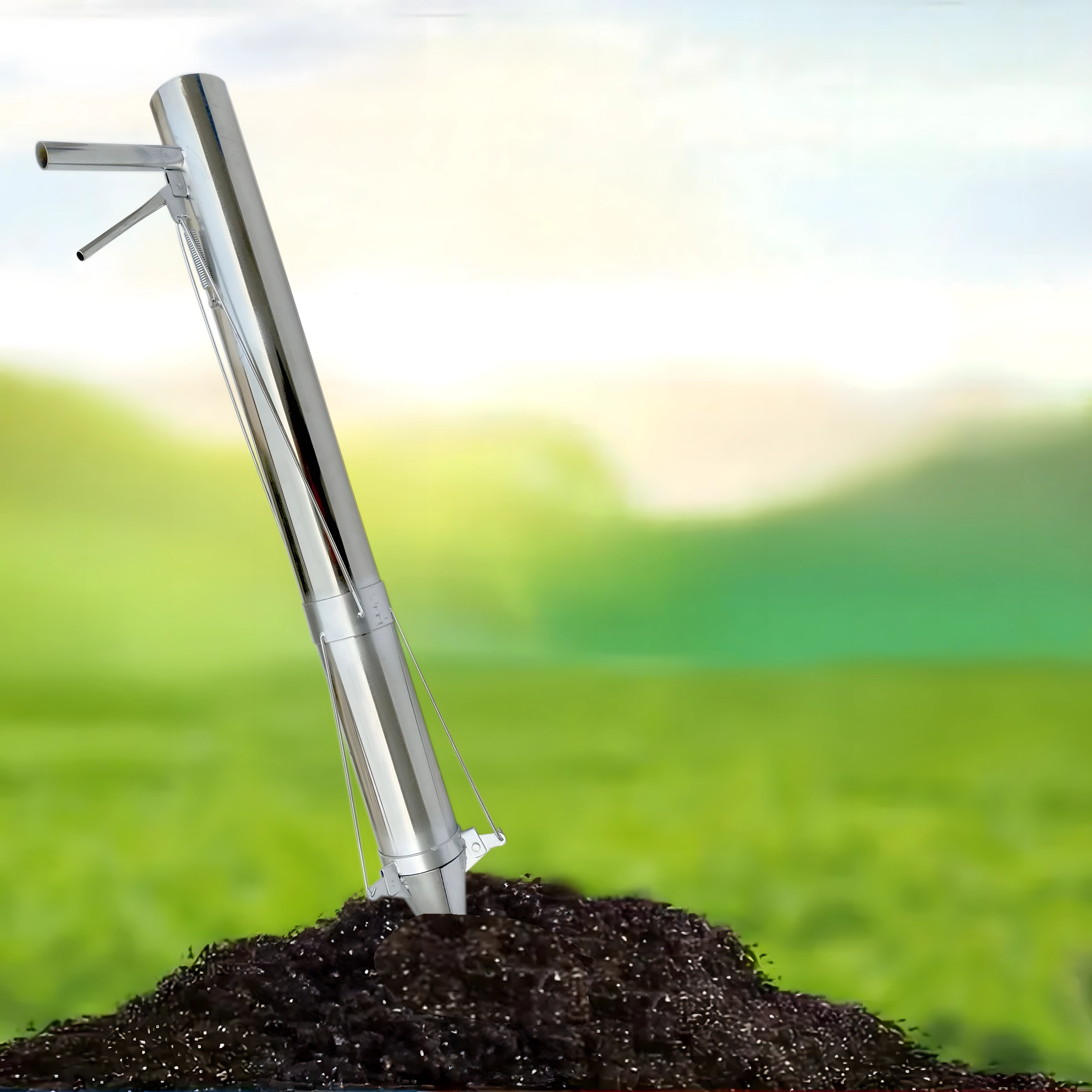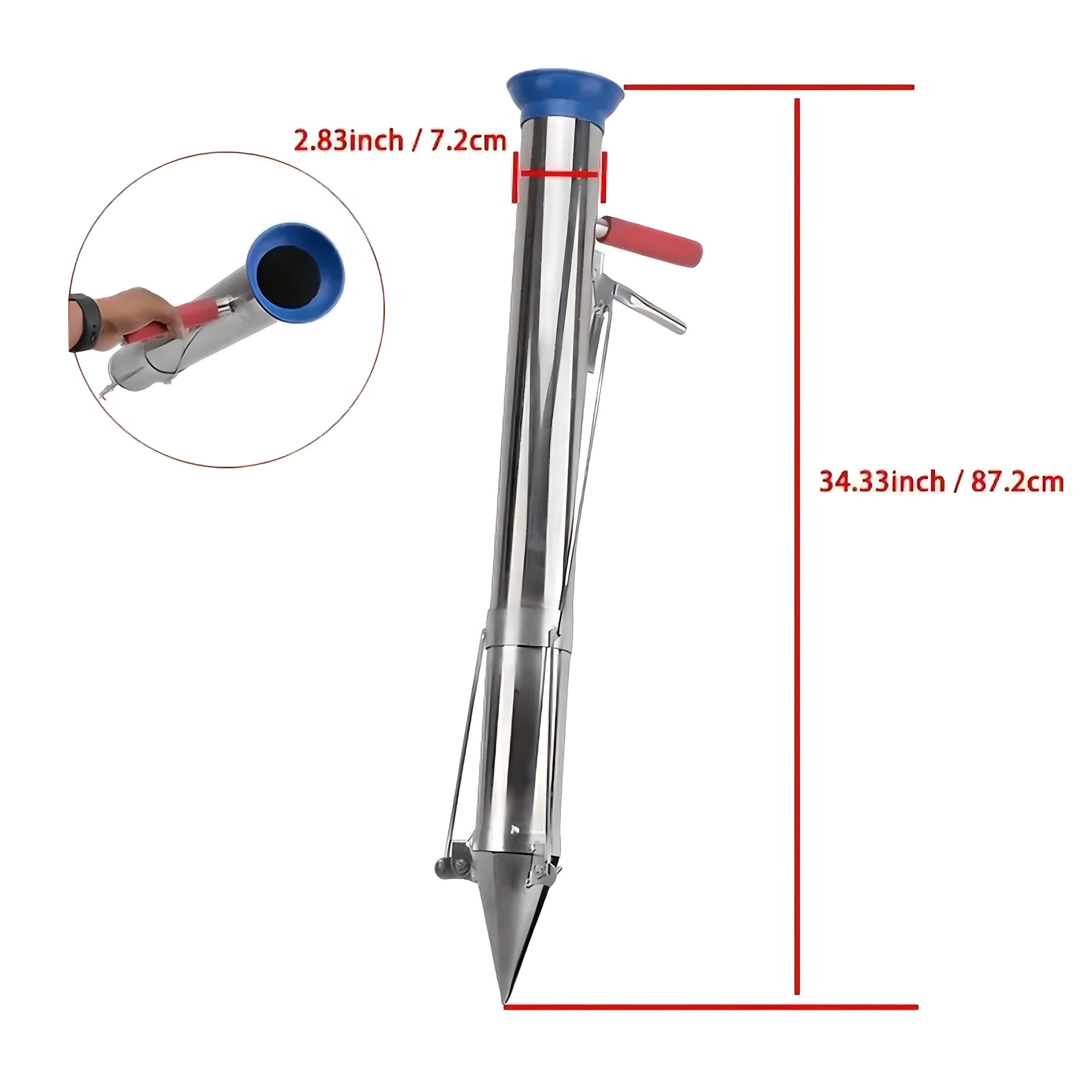 De conische punt en cilindrische behuizing maken met één druk een nette opening; plaats de zaailing en laat de grond eenvoudig terugvallen met de hendel.