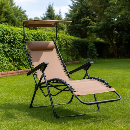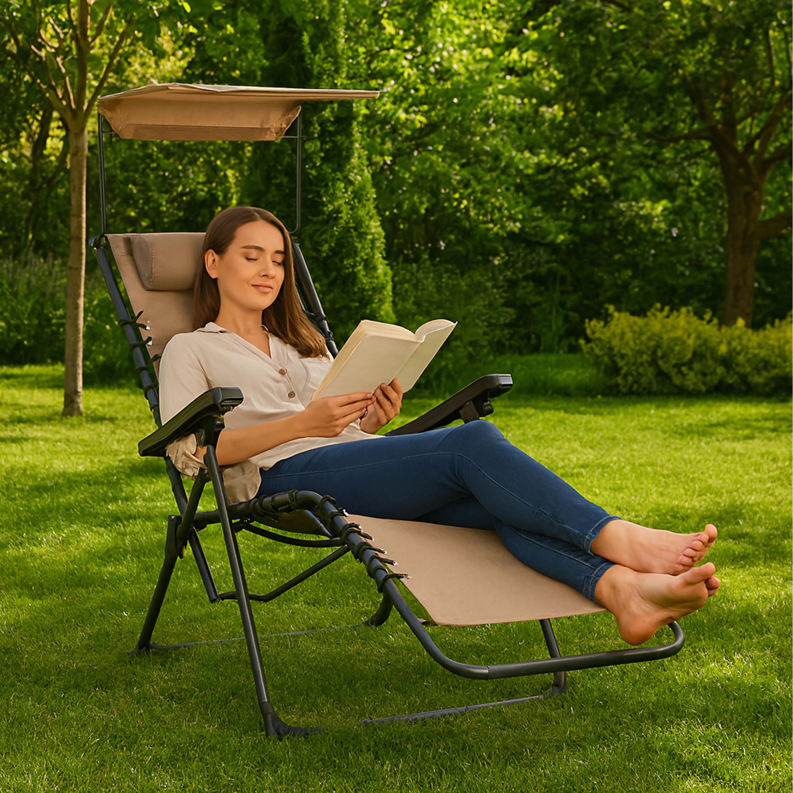 De praktische luifel biedt schaduw op zonnige dagen en de verstelbare rugleuning laat je soepel wisselen van zitten naar liggen. Het zachte, afneembare hoofdkussen ondersteunt de nek voor maximaal comfort.