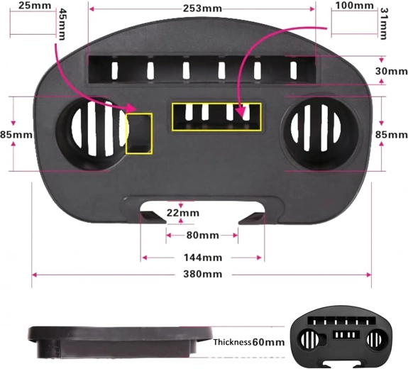 - Praktische indeling: 2 bekerhouders, sleuf voor telefoon/tablet, vakken voor kleine items.