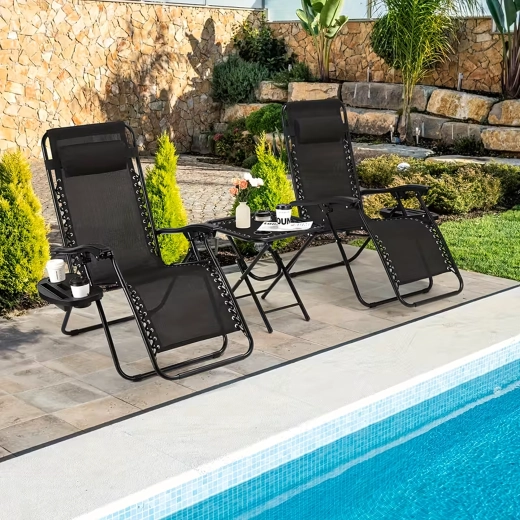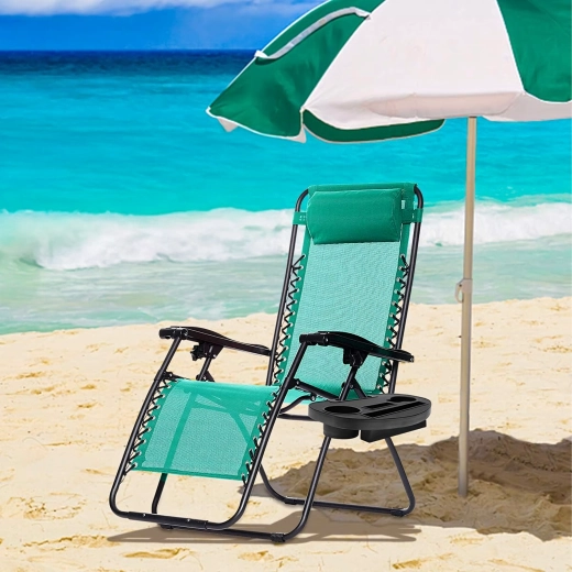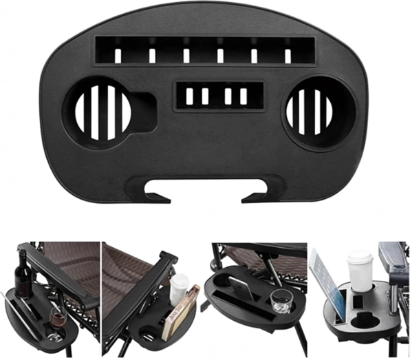 Praktische accessoire voor Zero Gravity ligstoelen: universeel klemtafeltje van duurzaam plastic met vakken voor alles wat belangrijk is. Biedt twee bekerhouders, een sleuf voor telefoon of tablet en ruimte voor kleine items. Snel monteren zonder gereedschap – ideaal voor op terras, balkon, tuin, strand en camping.