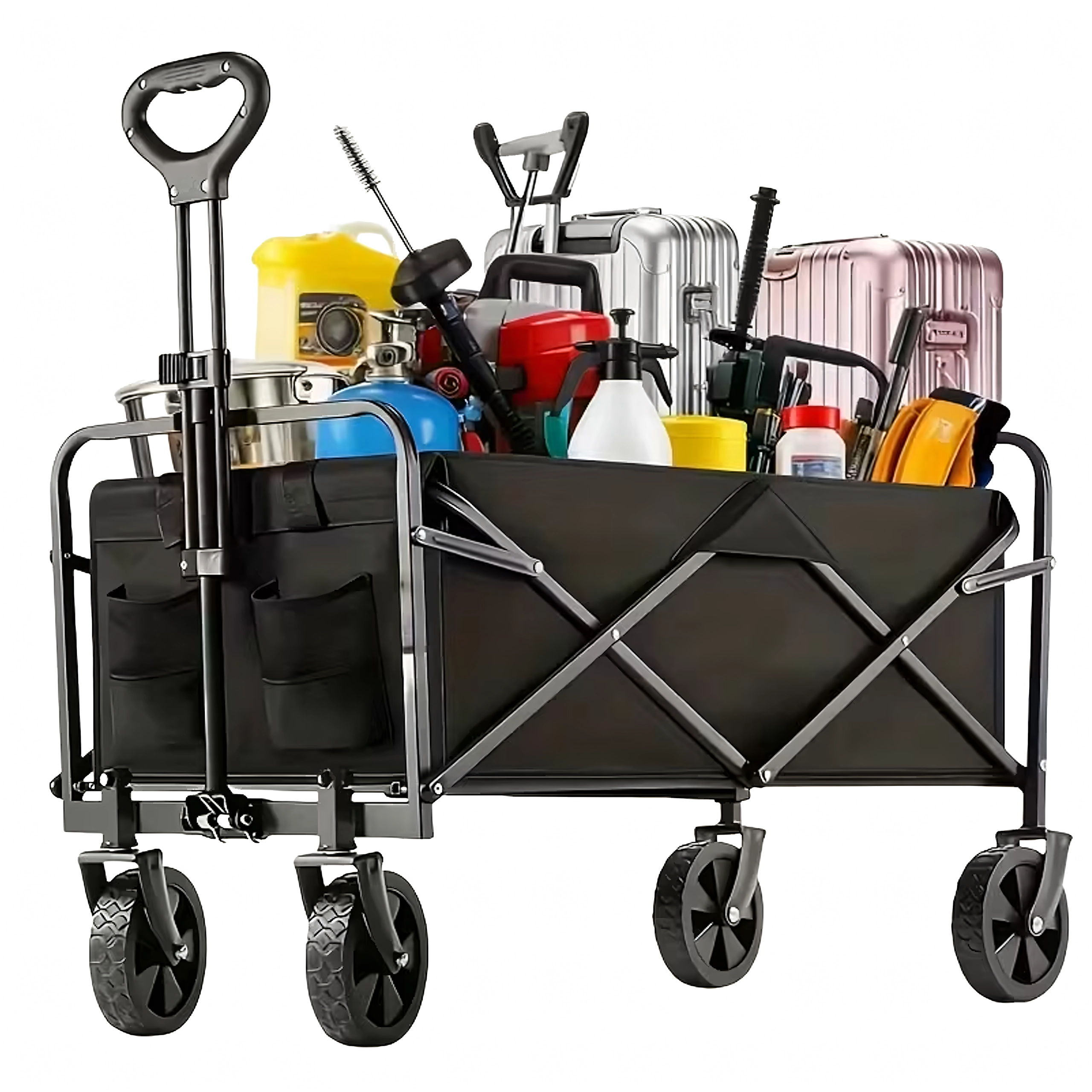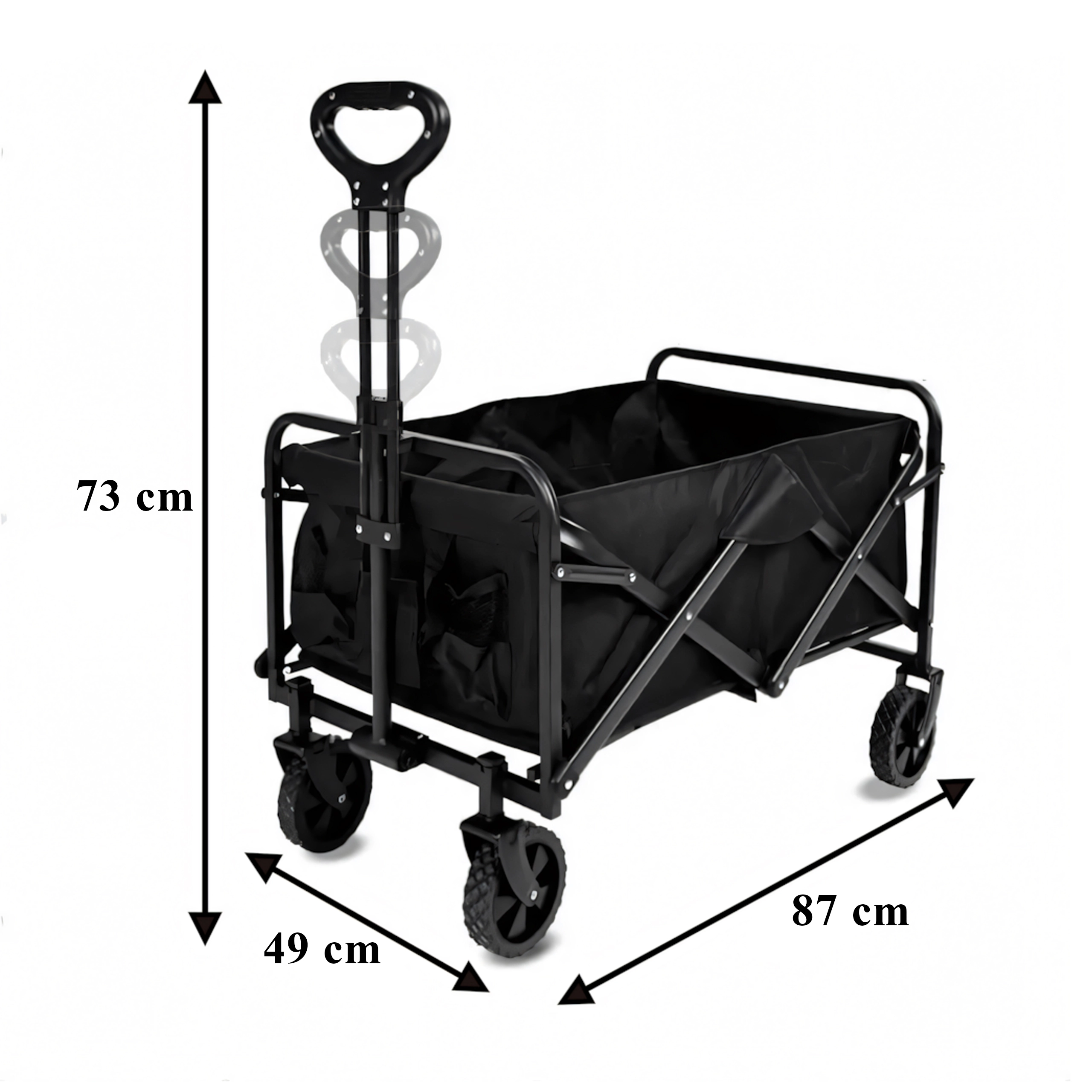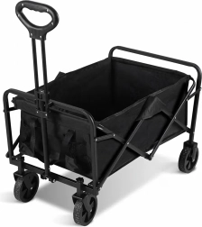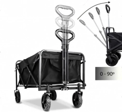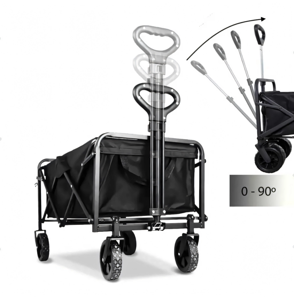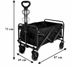 Na gebruik vouw je de wagen compact op in enkele seconden en berg je hem op in de kofferbak of in een kast. Praktische zijvakken houden kleine spullen bij de hand, de telescopische handgreep vergemakkelijkt het trekken en de stabiele constructie behoudt zijn vorm, zelfs bij volle belasting.