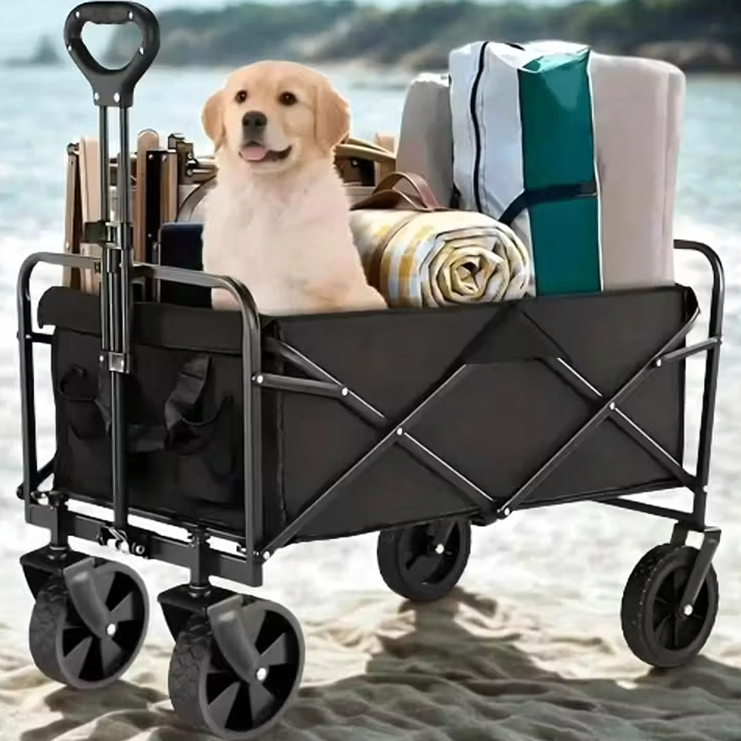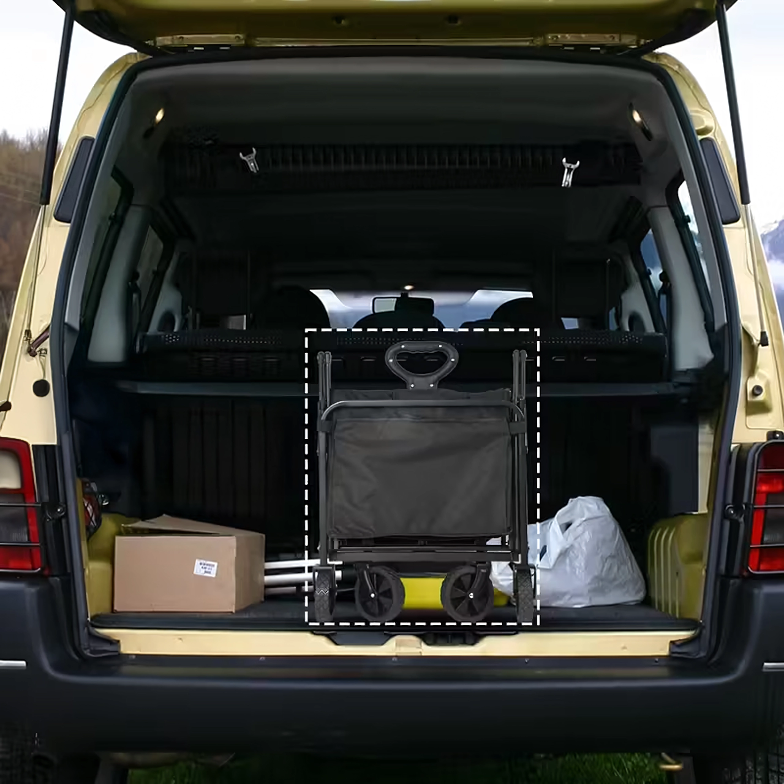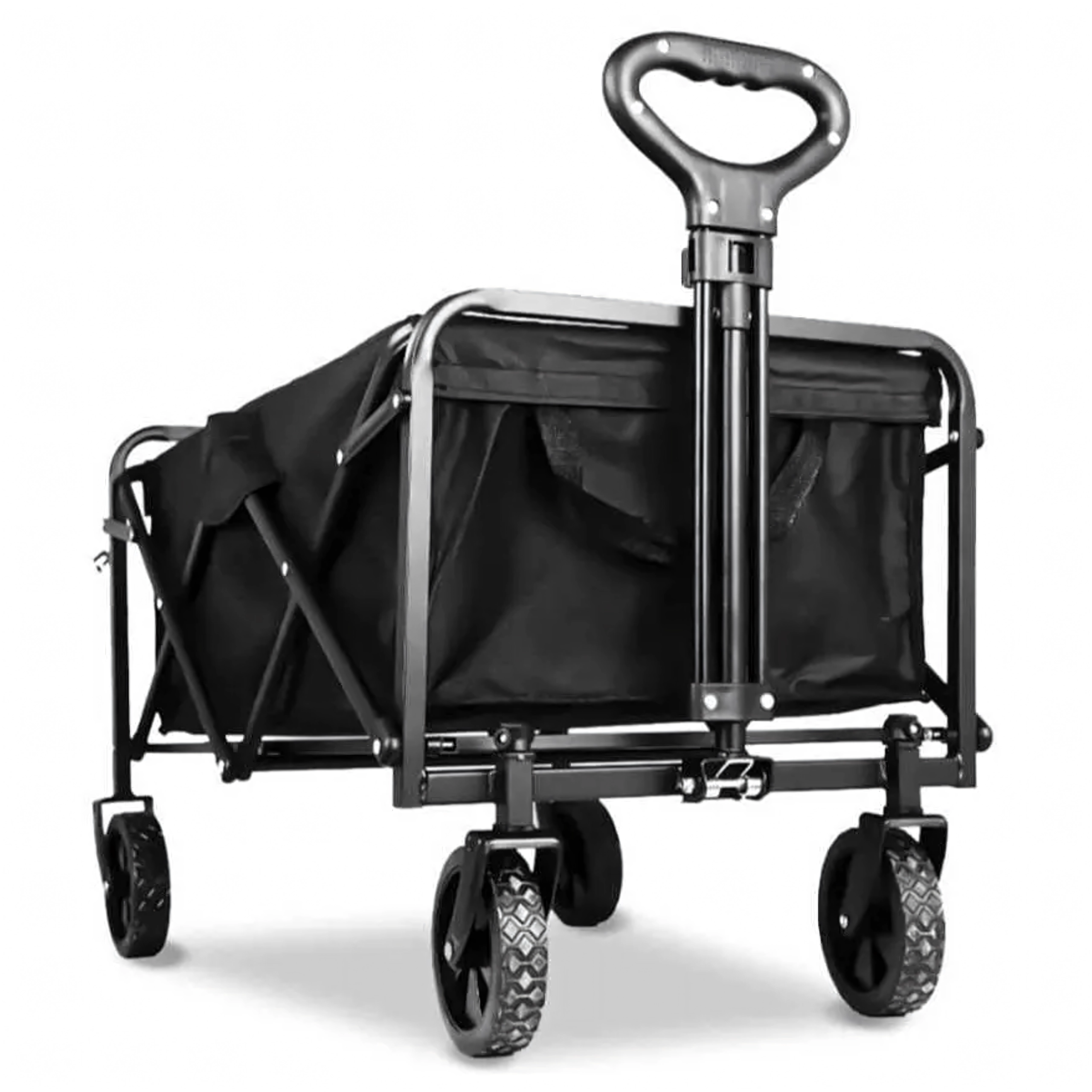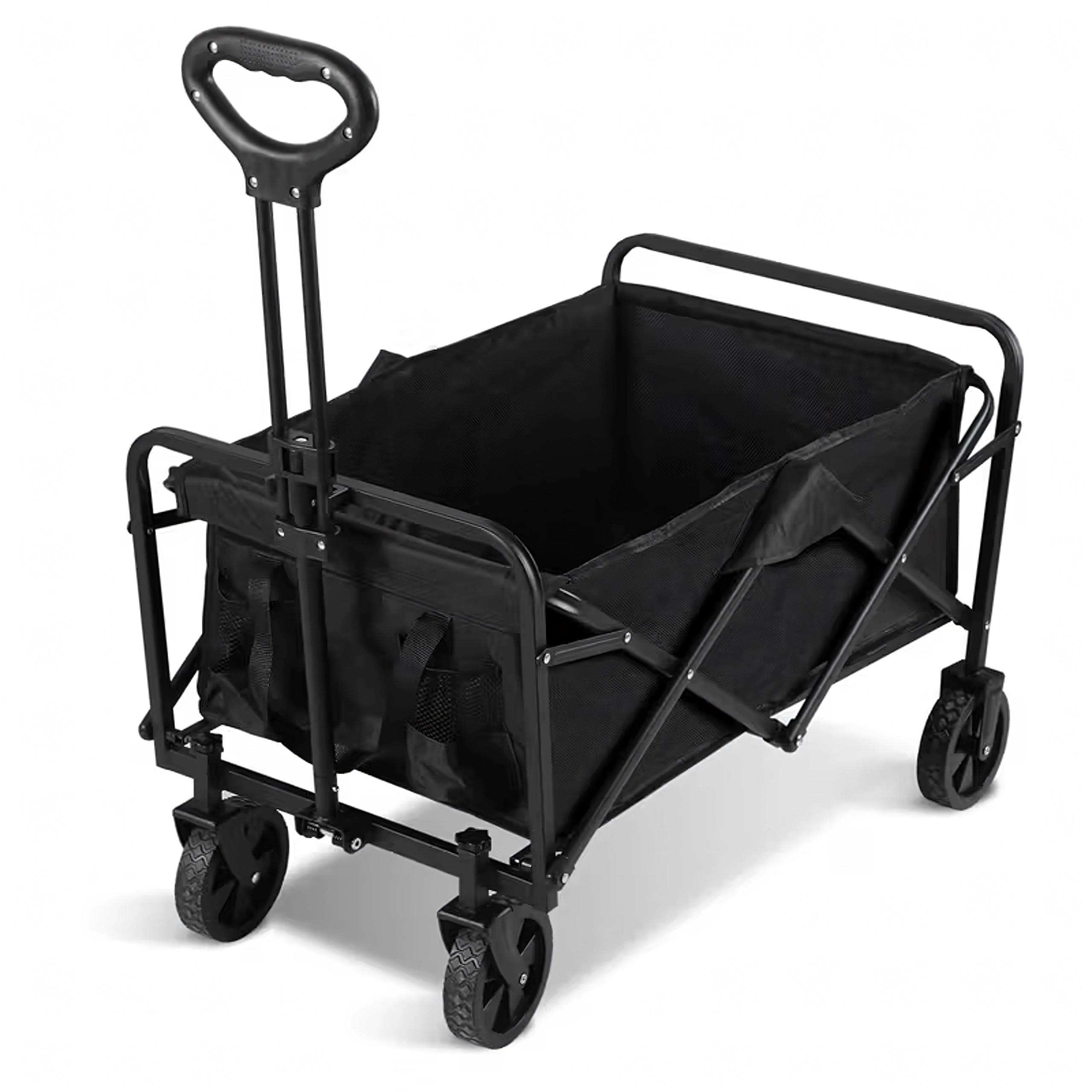 Na gebruik vouw je de wagen compact op in enkele seconden en berg je hem op in de kofferbak of in een kast. Praktische zijvakken houden kleine spullen bij de hand, de telescopische handgreep vergemakkelijkt het trekken en de stabiele constructie behoudt zijn vorm, zelfs bij volle belasting.