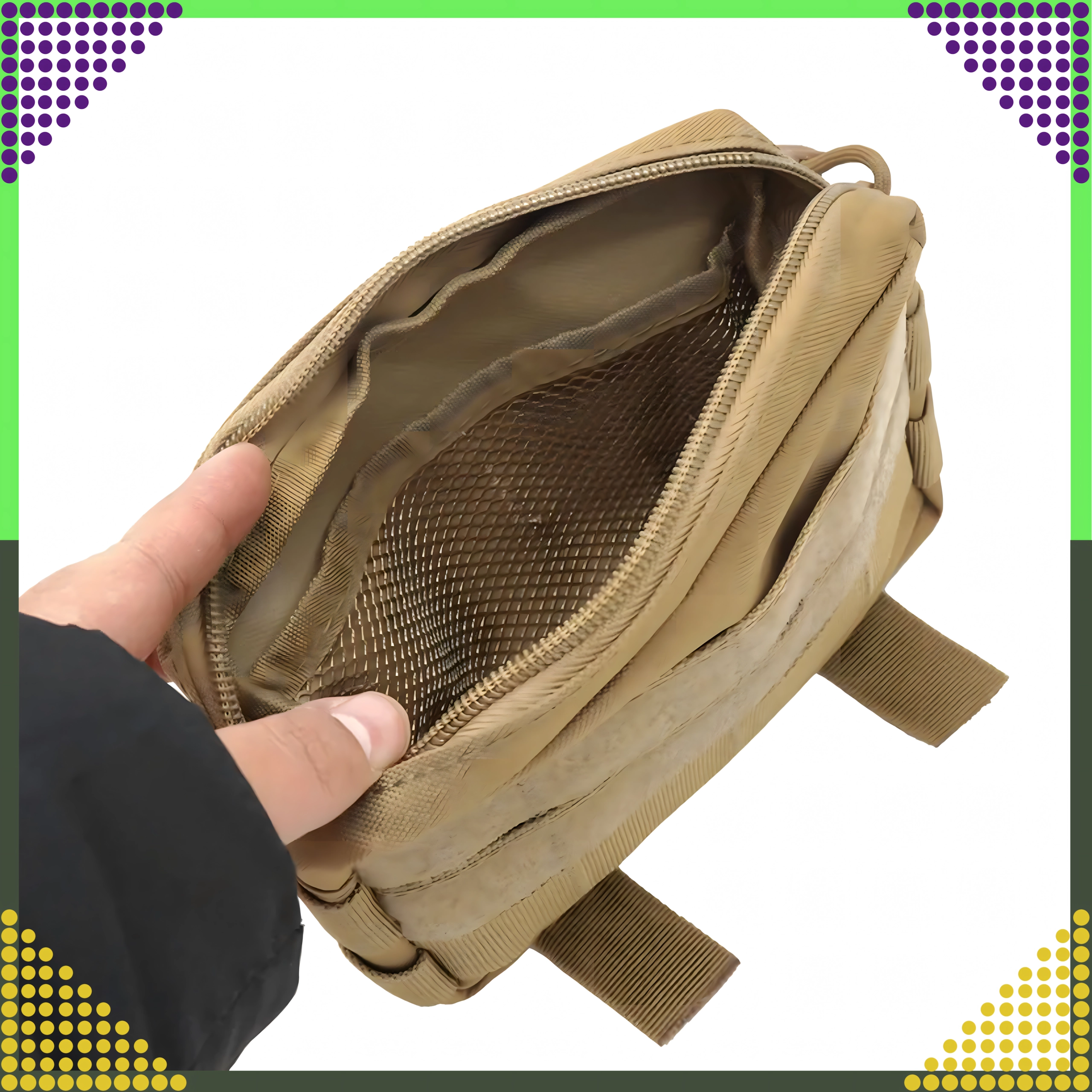 Dankzij de volledige compatibiliteit met het MOLLE-systeem bevestig je de pouch eenvoudig aan een tactisch vest, rugzak of riem. Twee externe MOLLE-banden maken verdere modulaire uitbreiding mogelijk. De rits met paracord-trekkers garandeert snelle toegang, ook met handschoenen aan.