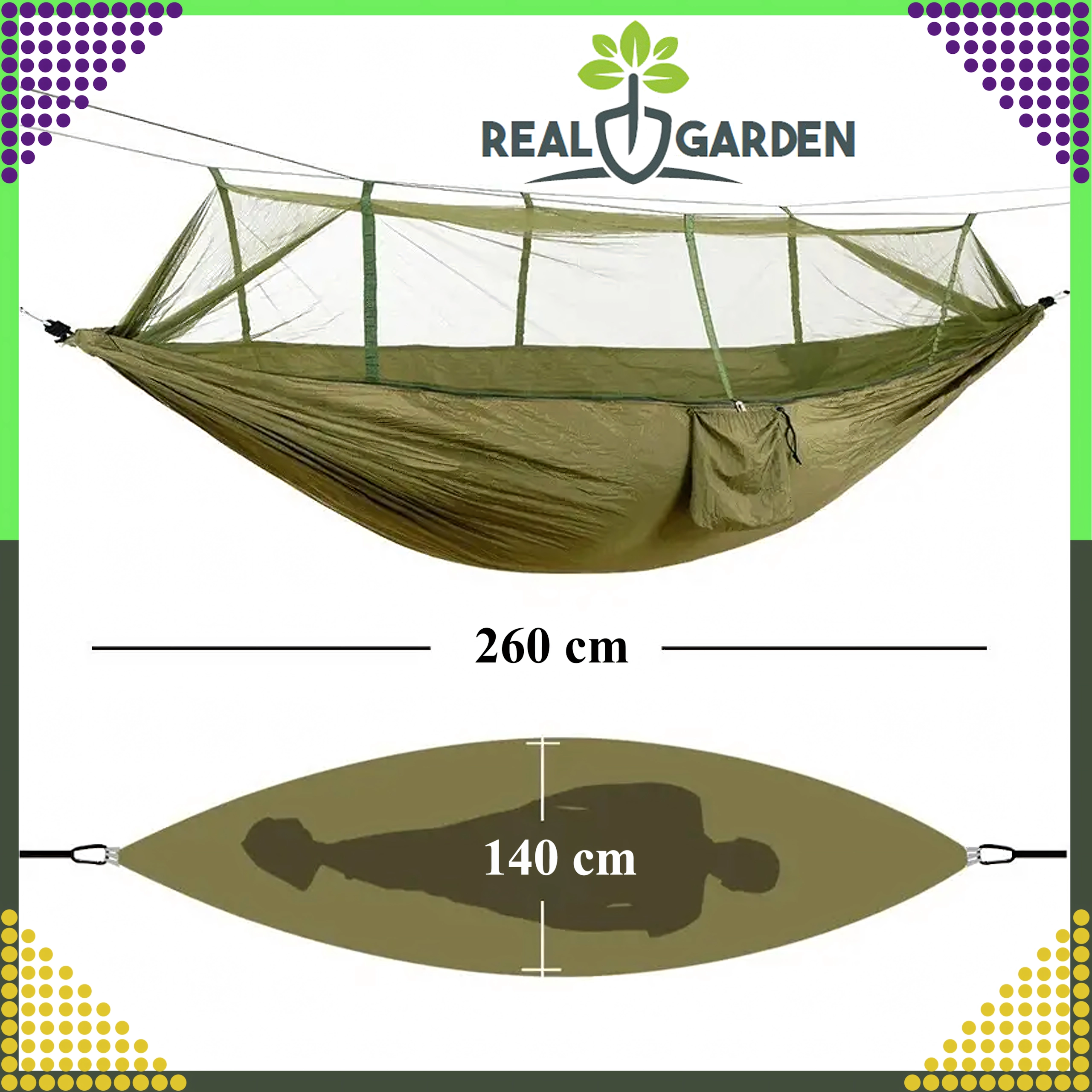 Het geïntegreerde muskietennet beschermt je betrouwbaar tegen insecten, zodat je ook in de natuur van een rustige slaap kunt genieten. Dankzij de afmetingen van 260 × 140 cm biedt hij voldoende ruimte en het draagvermogen van 180 kg garandeert veilig gebruik.