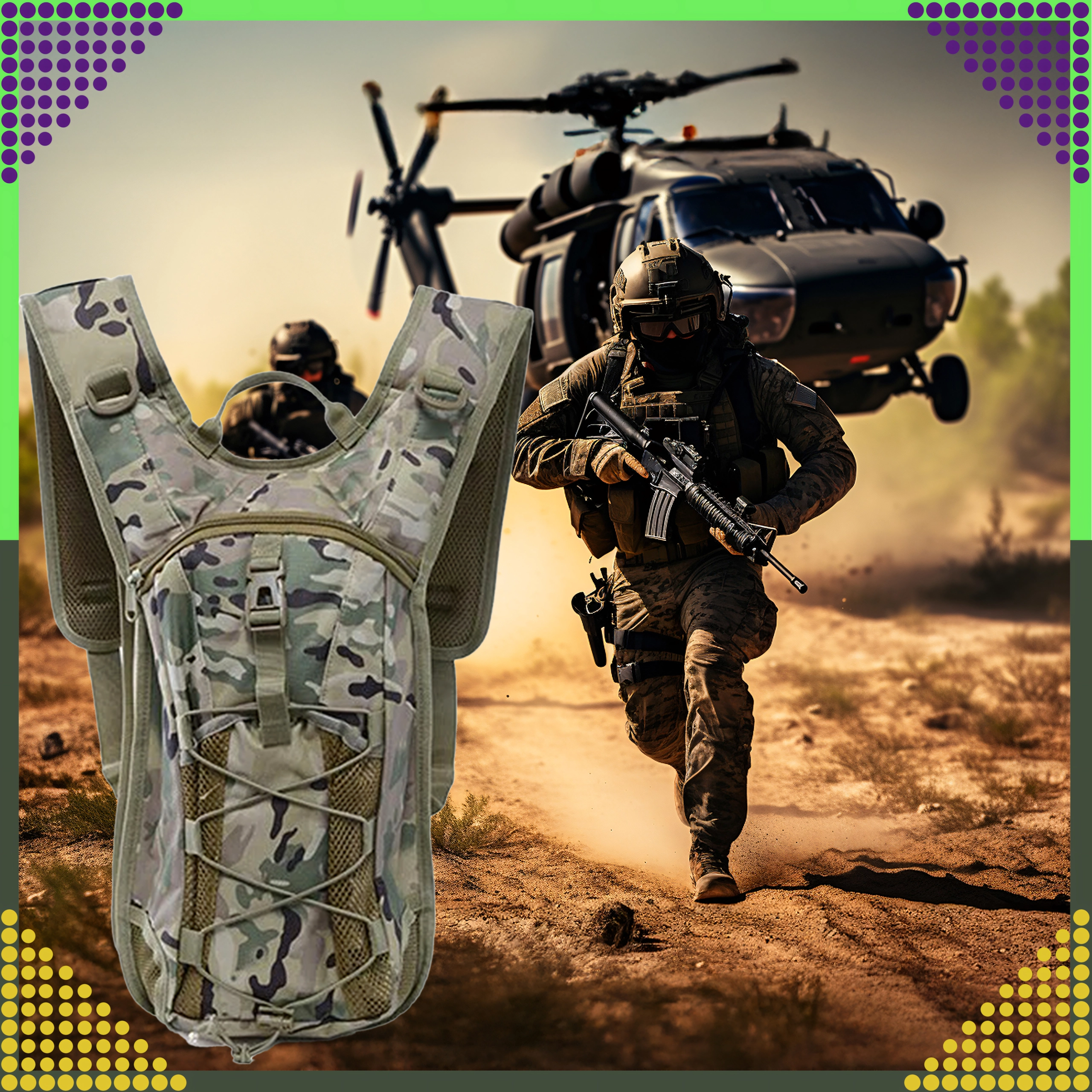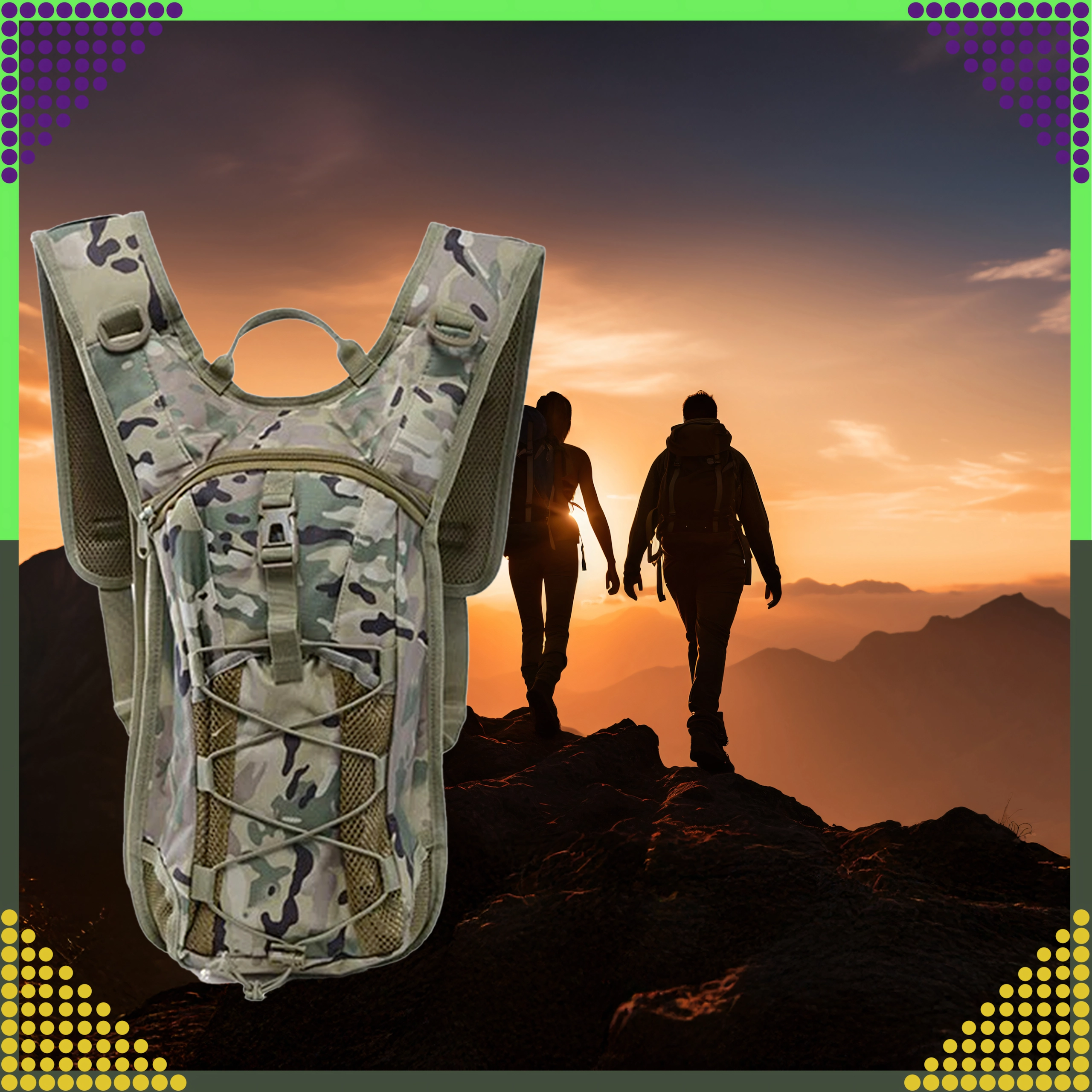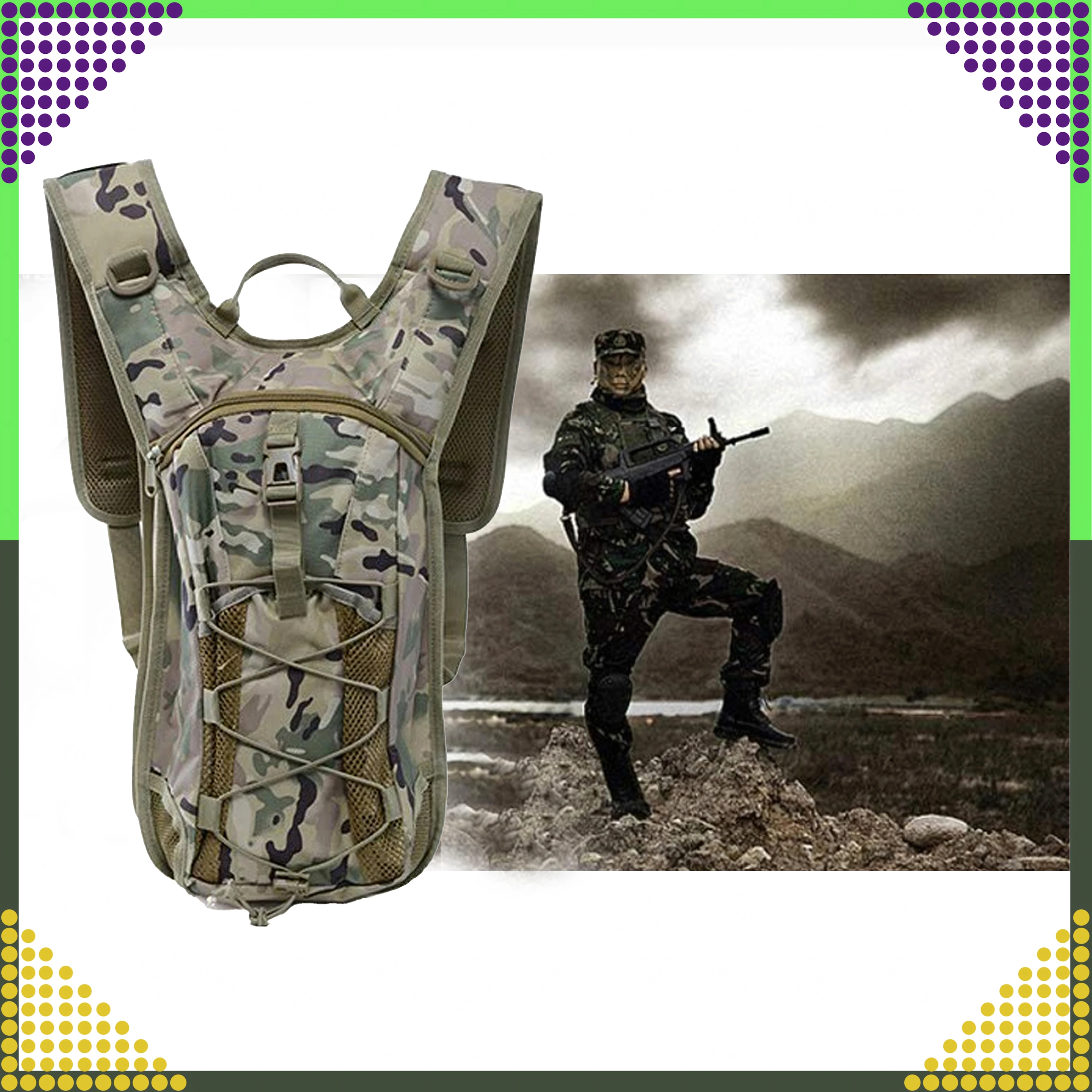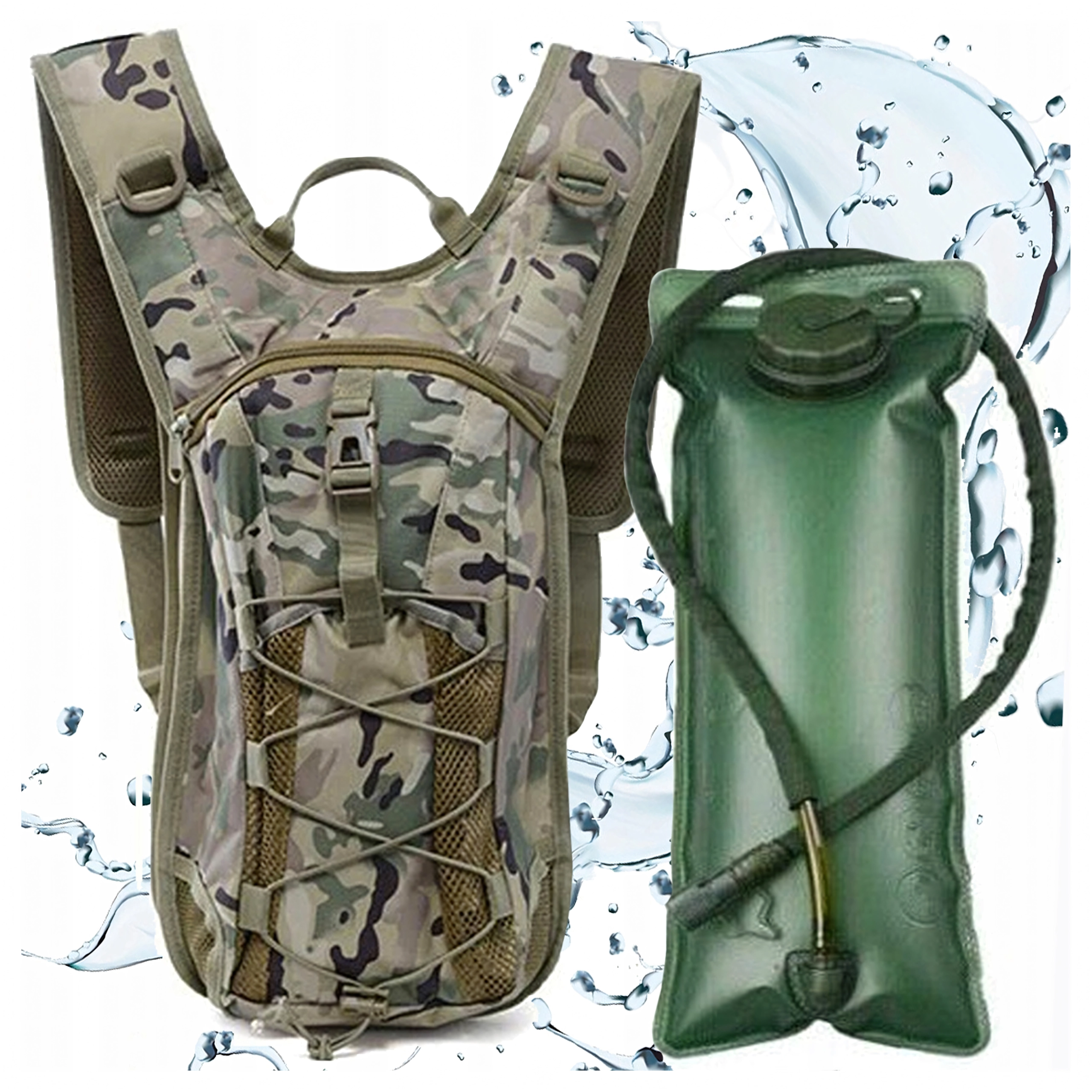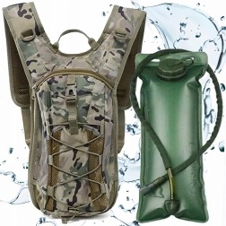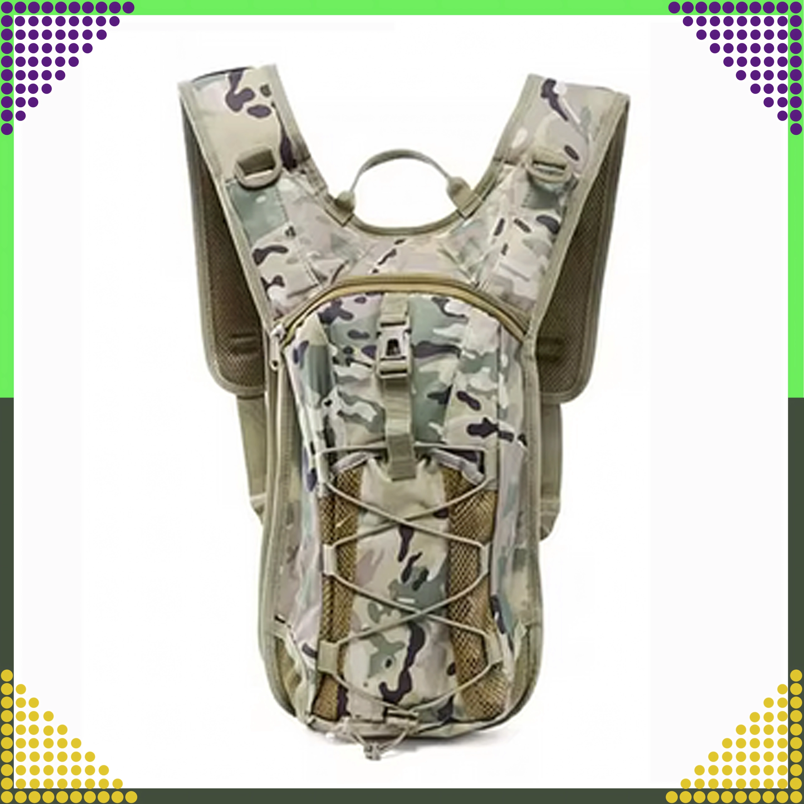Voorvak met rits, elastisch bungeekoord en zijdelingse D‑ringen voor het bevestigen van kleine items. Camouflage‑look en sterke stiksels kunnen ruw terrein aan.
