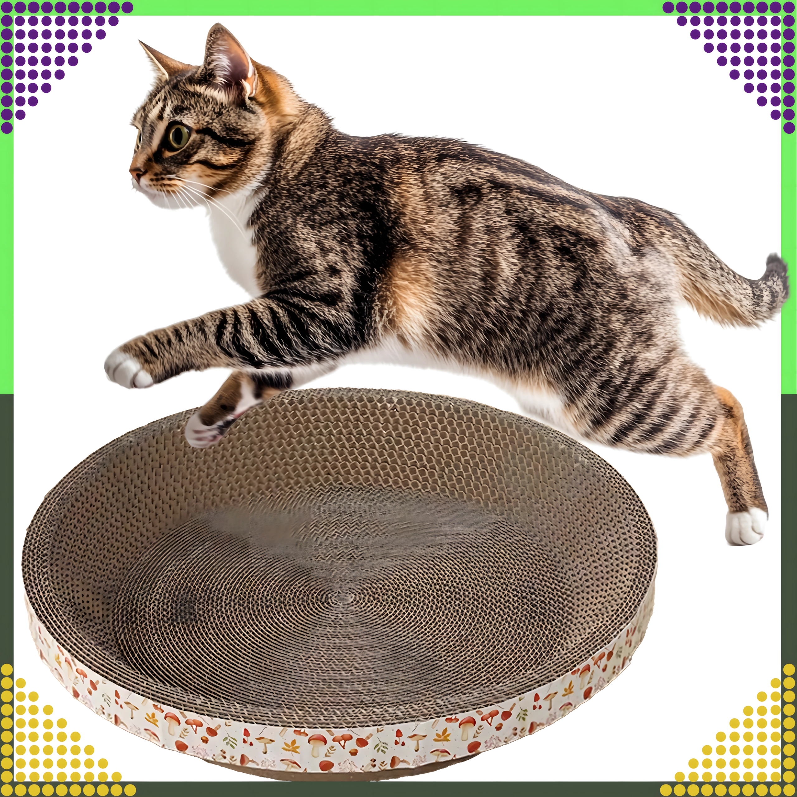 De ronde kartonnen krab- en ligmand met een diameter van 30 cm biedt katten voldoende ruimte om te krabben, spelen en rusten. Dankzij de stevige honingraatstructuur is het oppervlak duurzaam en nodigt het katten uit tot natuurlijk slijpen van de nagels, waardoor het risico op beschadiging van je meubels afneemt.