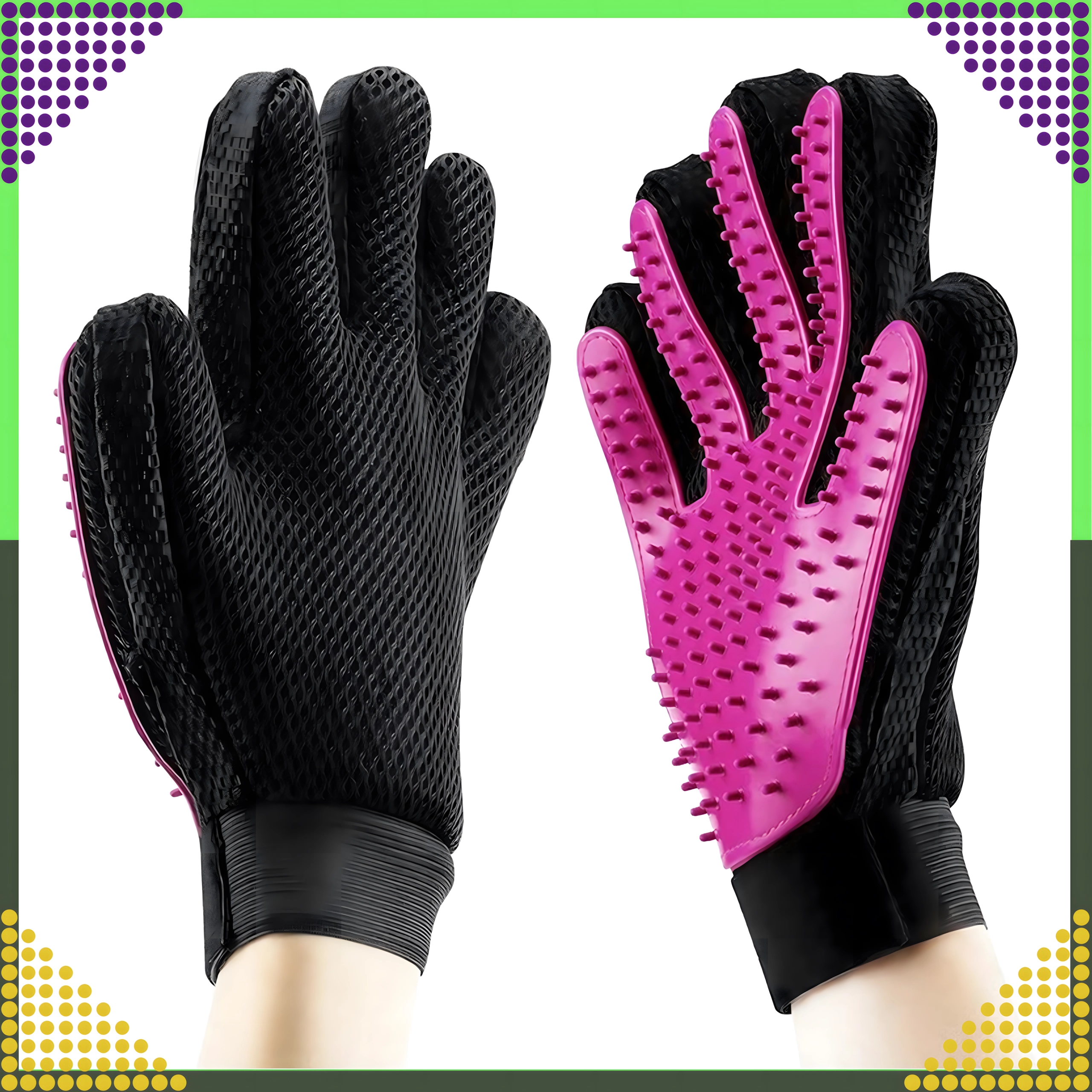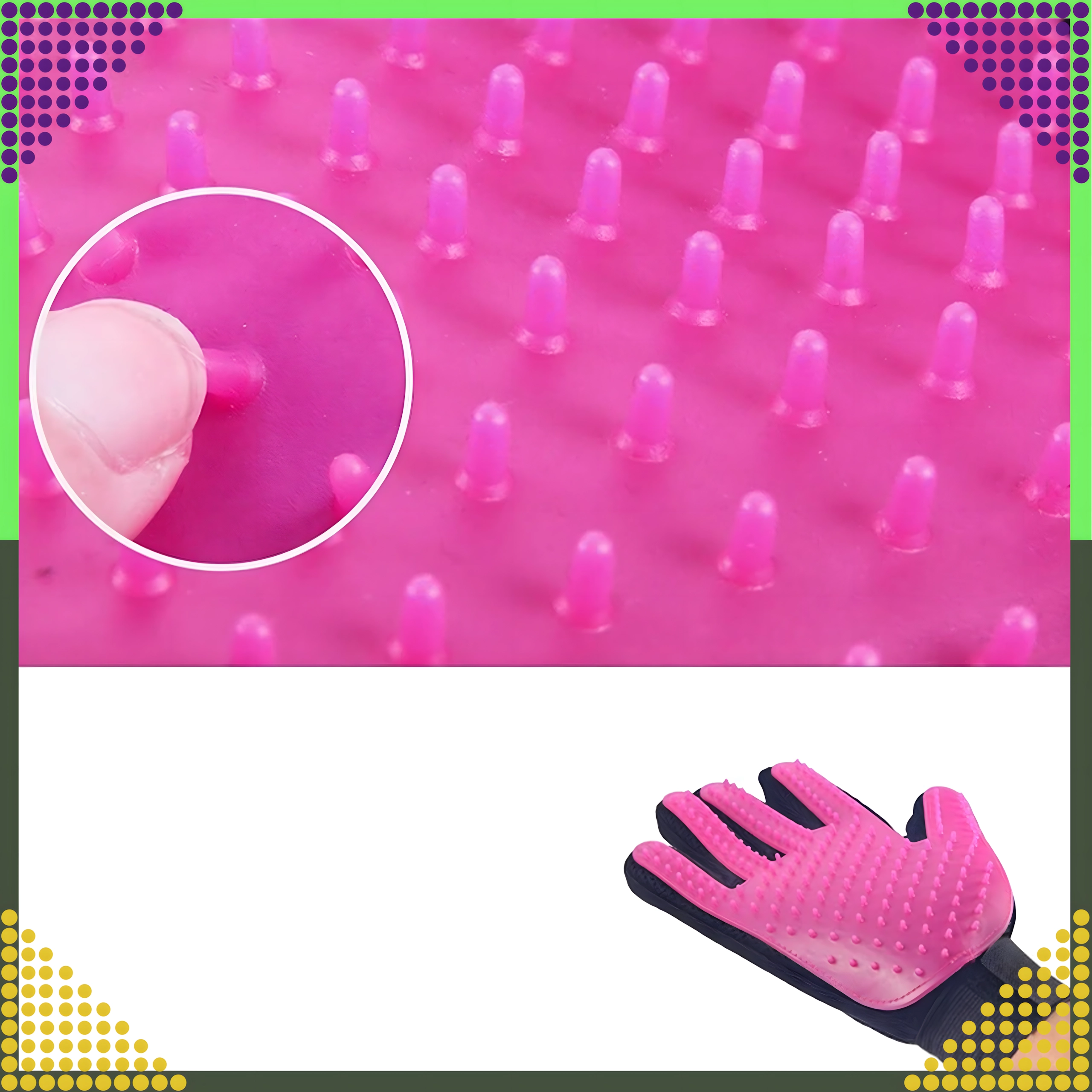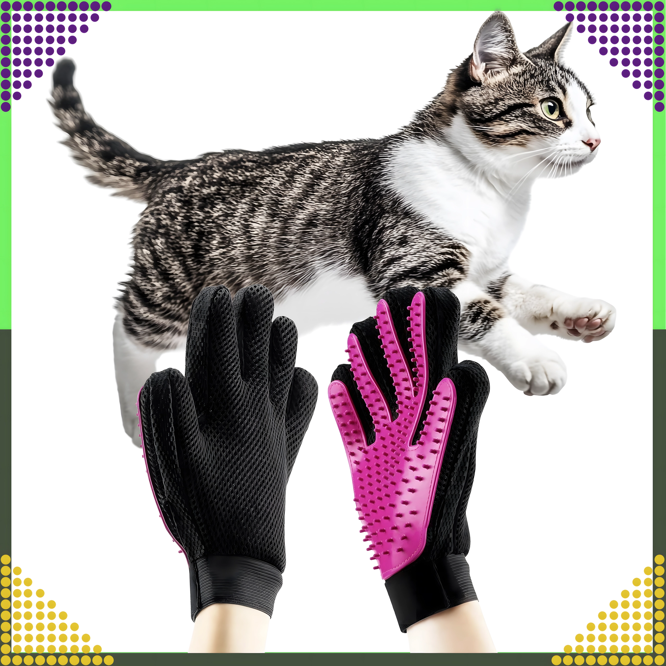 Ontdek een eenvoudige manier om de vacht van je huisdier schoon en glanzend te houden, zonder stress. De handschoen met zachte siliconen puntjes vangt losse haren effectief op tijdens het aaien en geeft tegelijk een prettige massage die de doorbloeding van de huid stimuleert en de natuurlijke glans van de vacht ondersteunt.