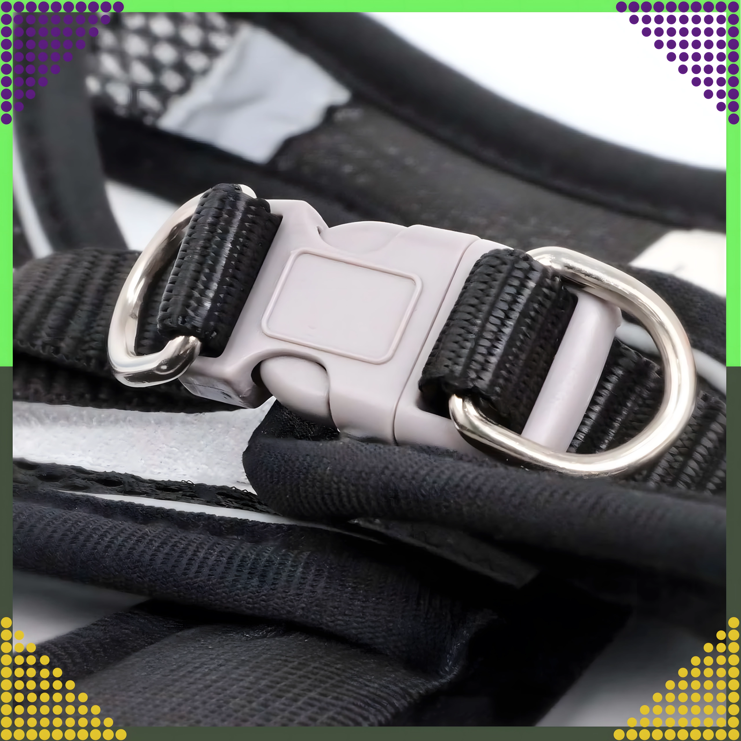 Dubbele metalen D-ringen en verstelbare banden met gespen houden het harnas stevig op zijn plaats en maken het eenvoudig om de maat aan te passen.