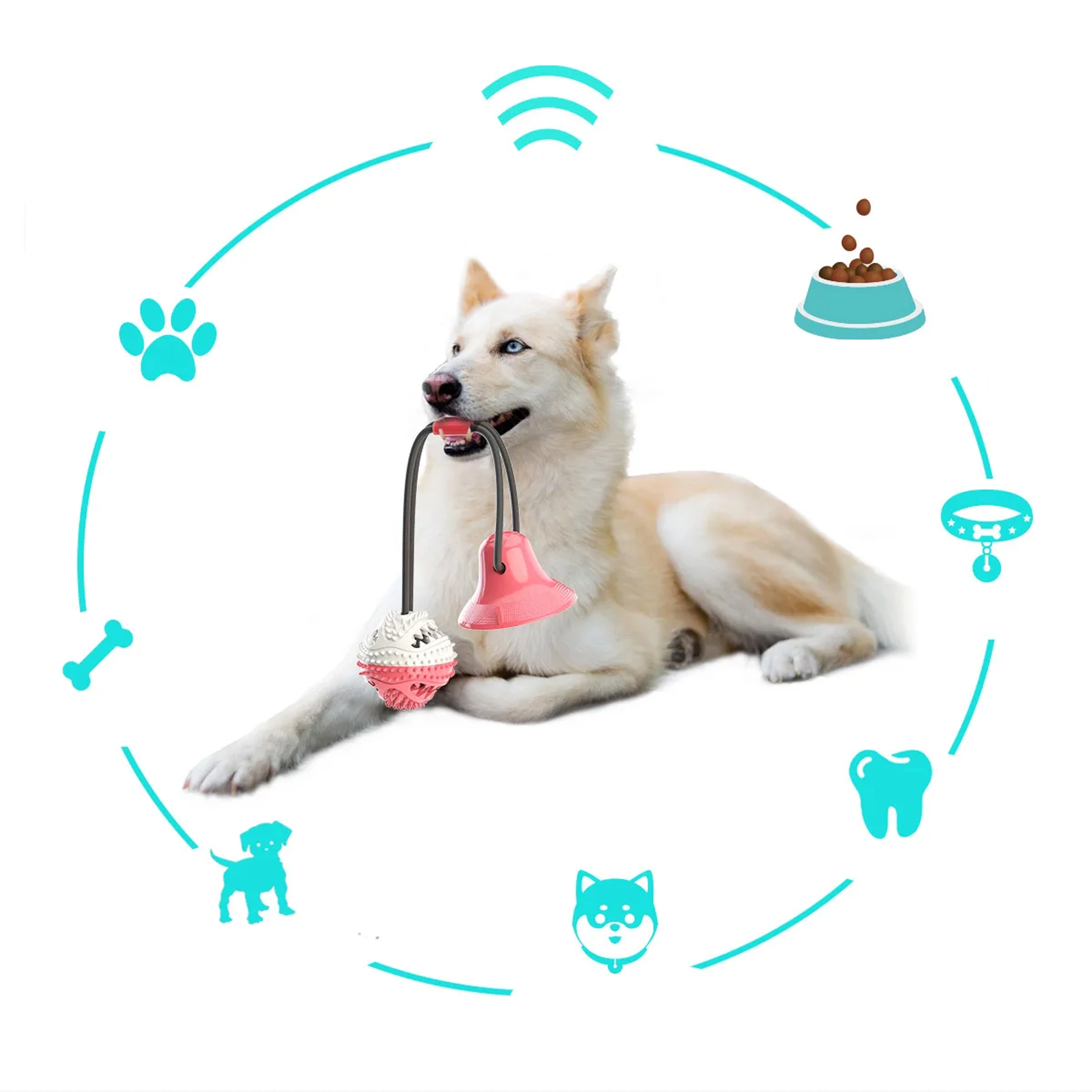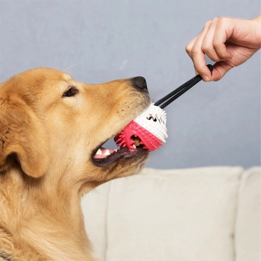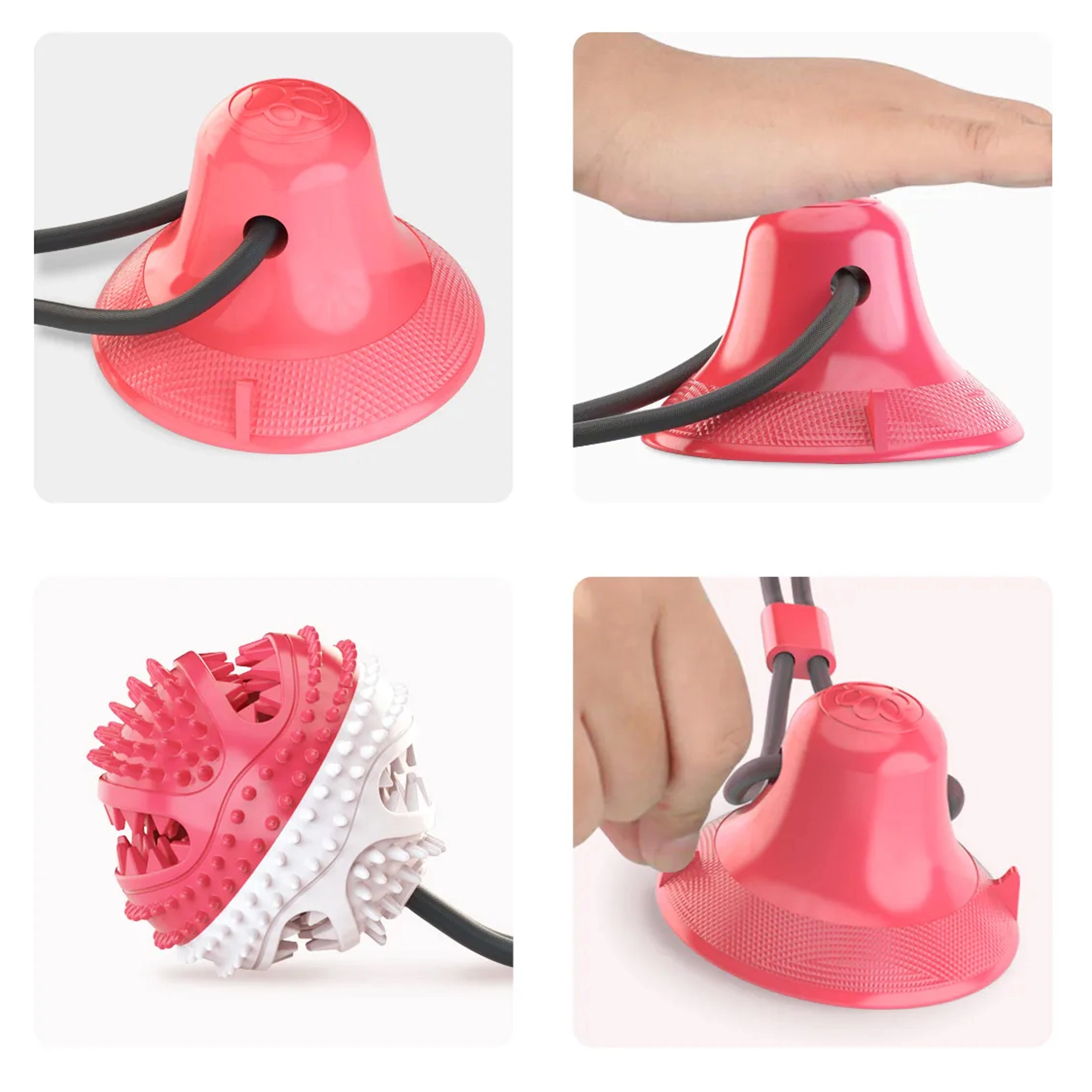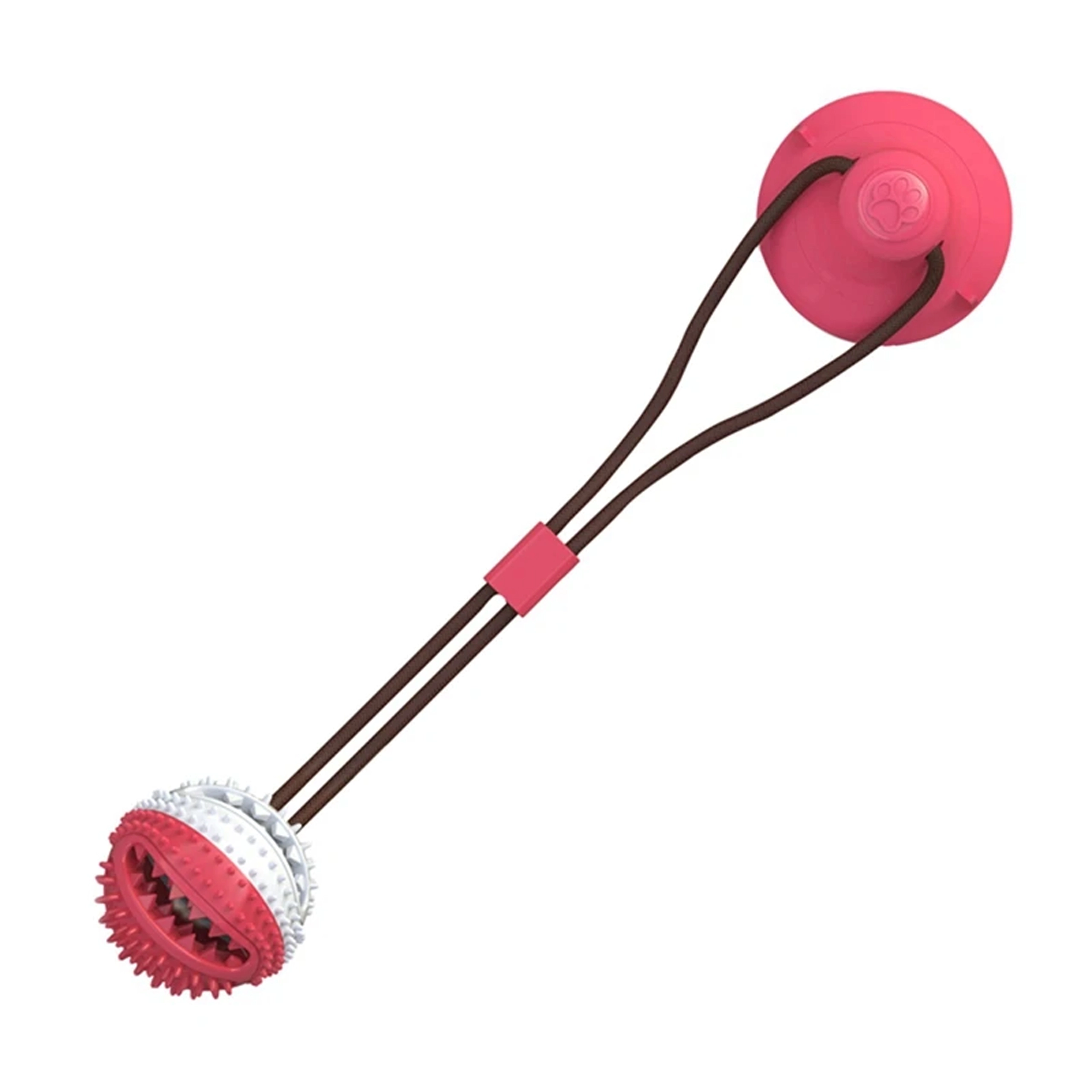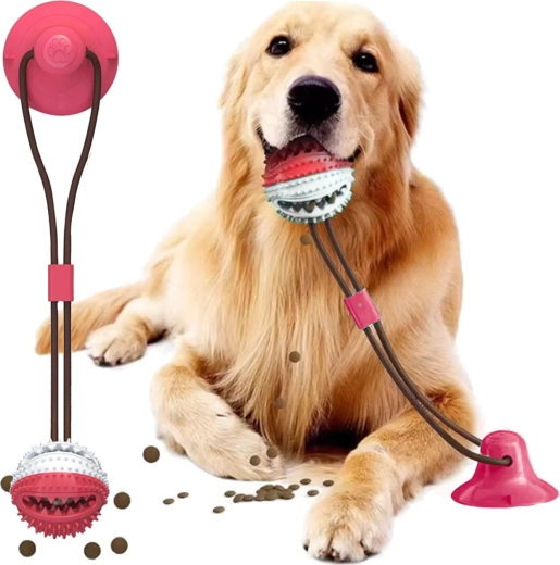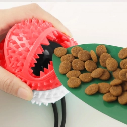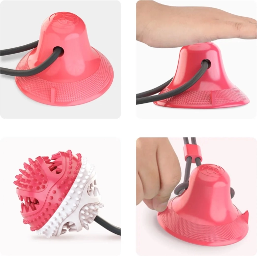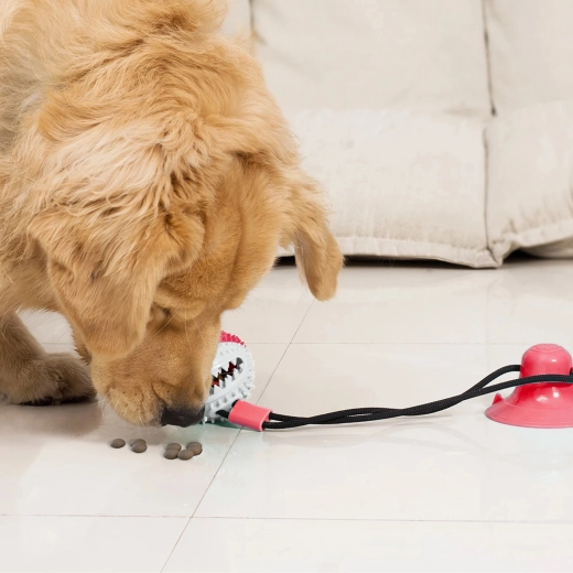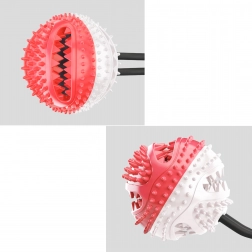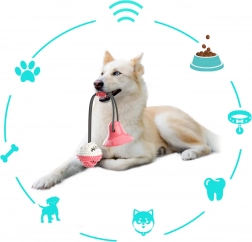 De interactieve bal met zuignap vermaakt je hond met trekken, kauwen en het zoeken naar snacks. Dankzij het duurzame koord en de sterke zuignap kan het speeltje op gladde oppervlakken worden bevestigd, zodat de hond veilig kan trekken en proberen de bal los te krijgen. De getextureerde rubberen nopjes reinigen de tanden mechanisch en masseren zacht het tandvlees tijdens het spelen, wat de mondhygiëne ondersteunt.