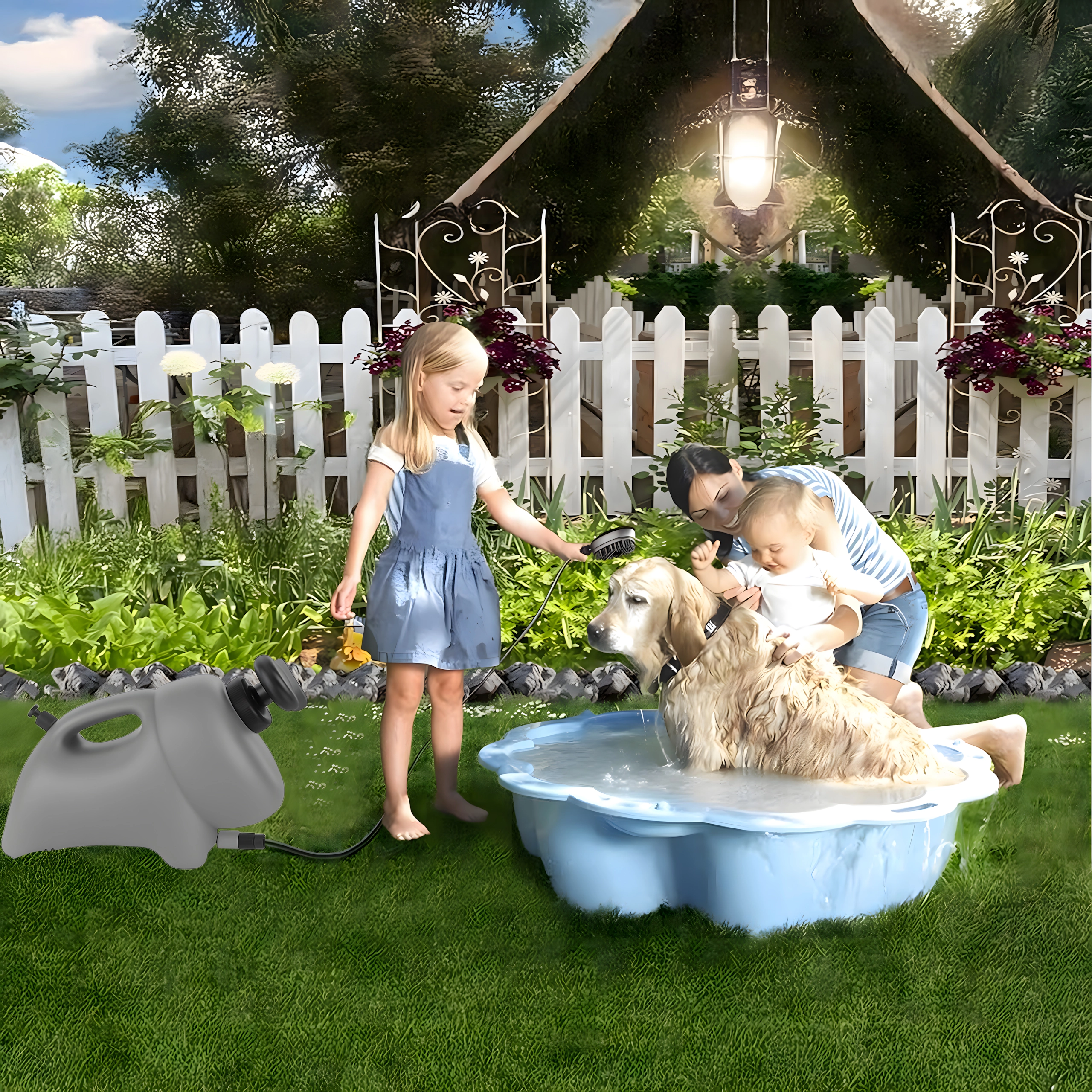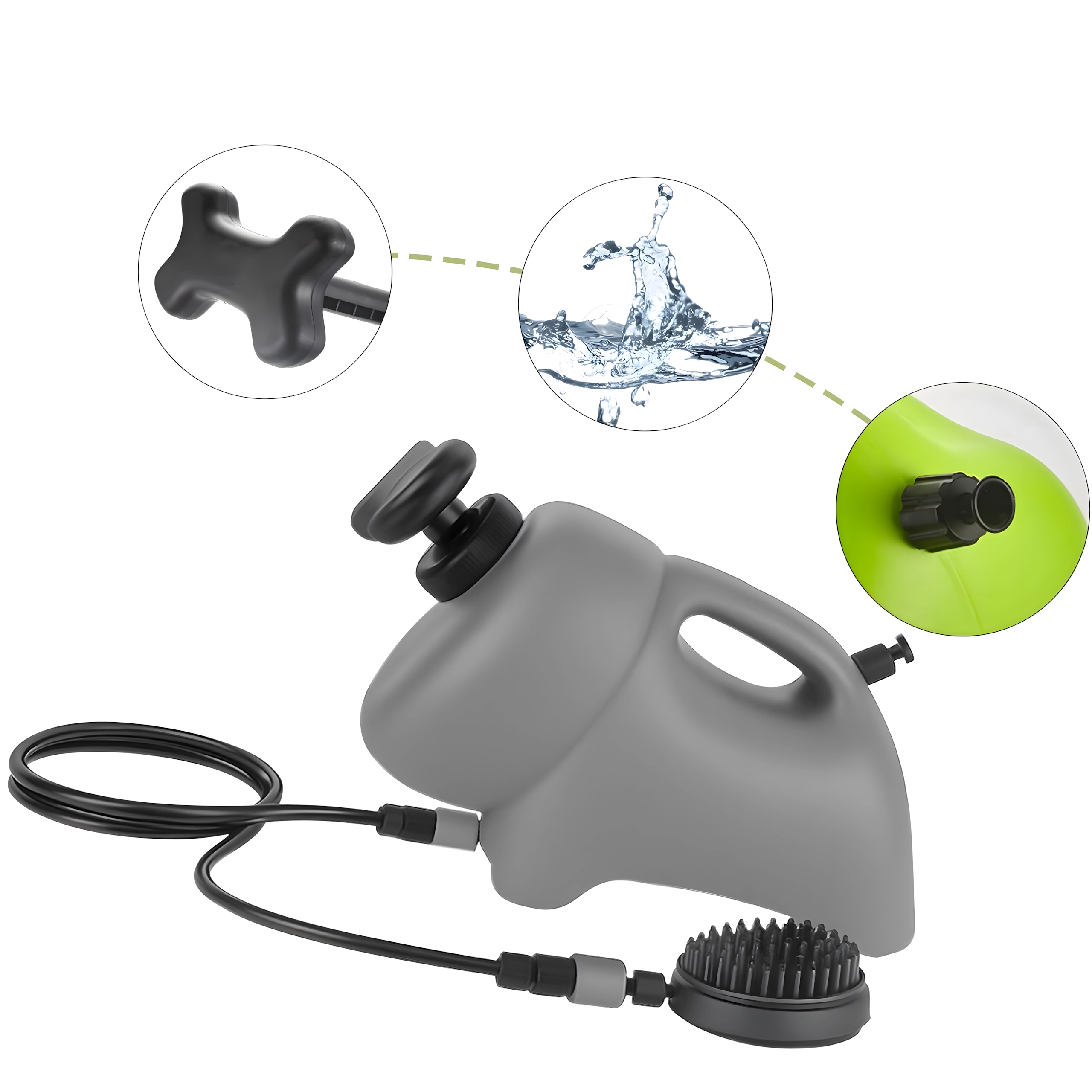 Praktische en stille draagbare wasunit met een inhoud van 8 l voor het eenvoudig wassen van honden en katten thuis en buiten. Combineert douche en massageborstel 2-in-1, heeft een lange slang voor comfortabel bereik en vereist geen stroomvoorziening. Het reservoir houdt warm water tot 2,5 uur vast, ideaal ook voor koelere dagen.