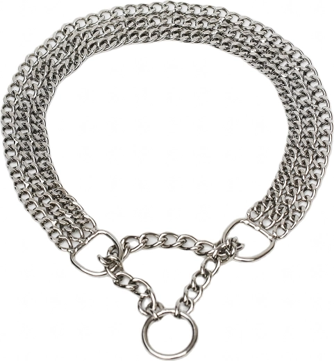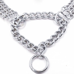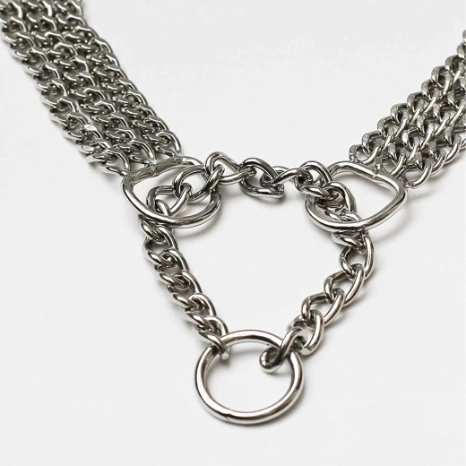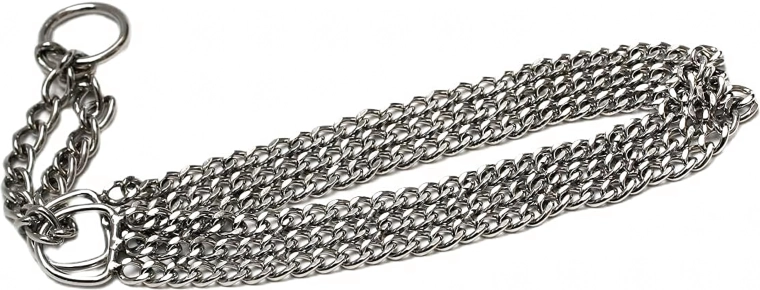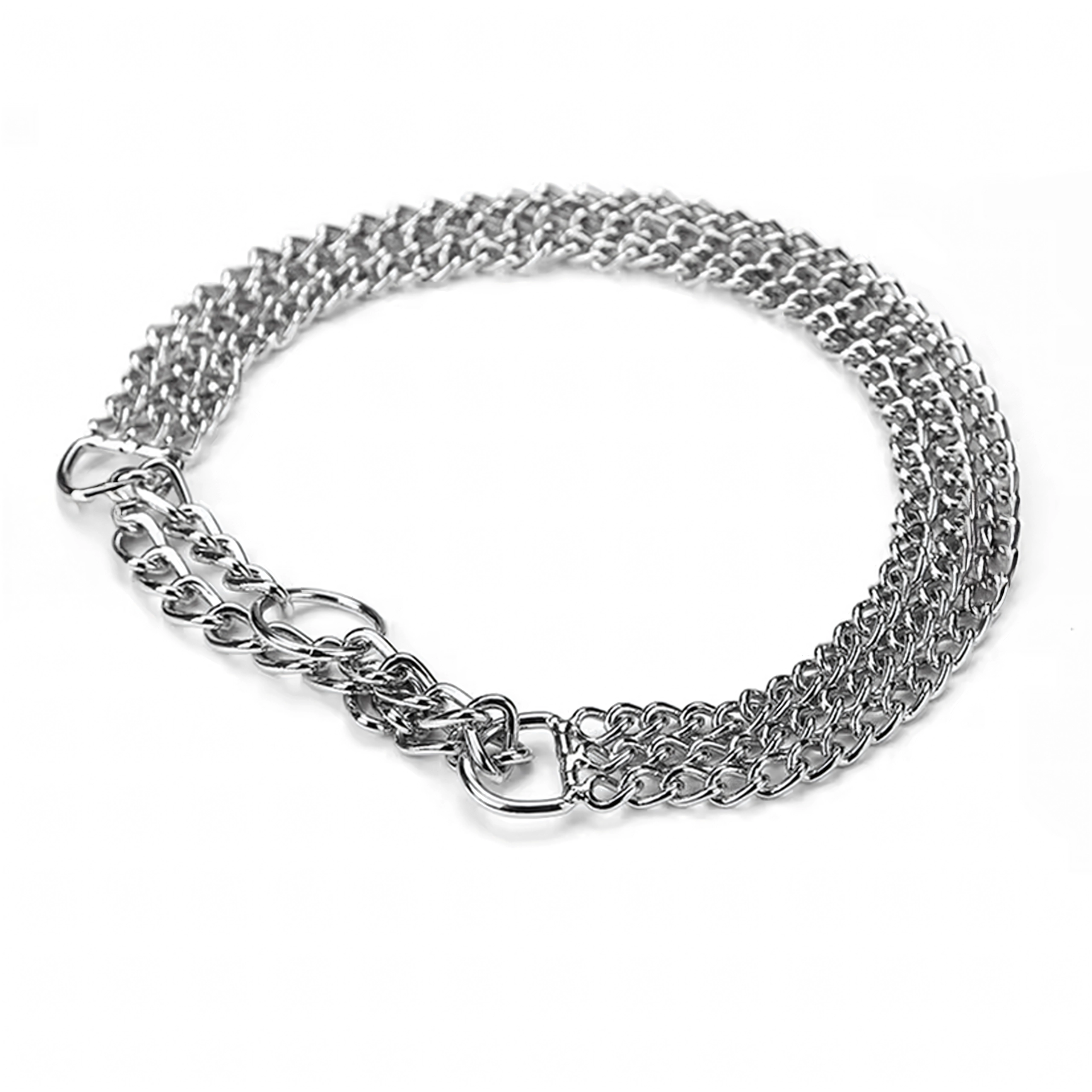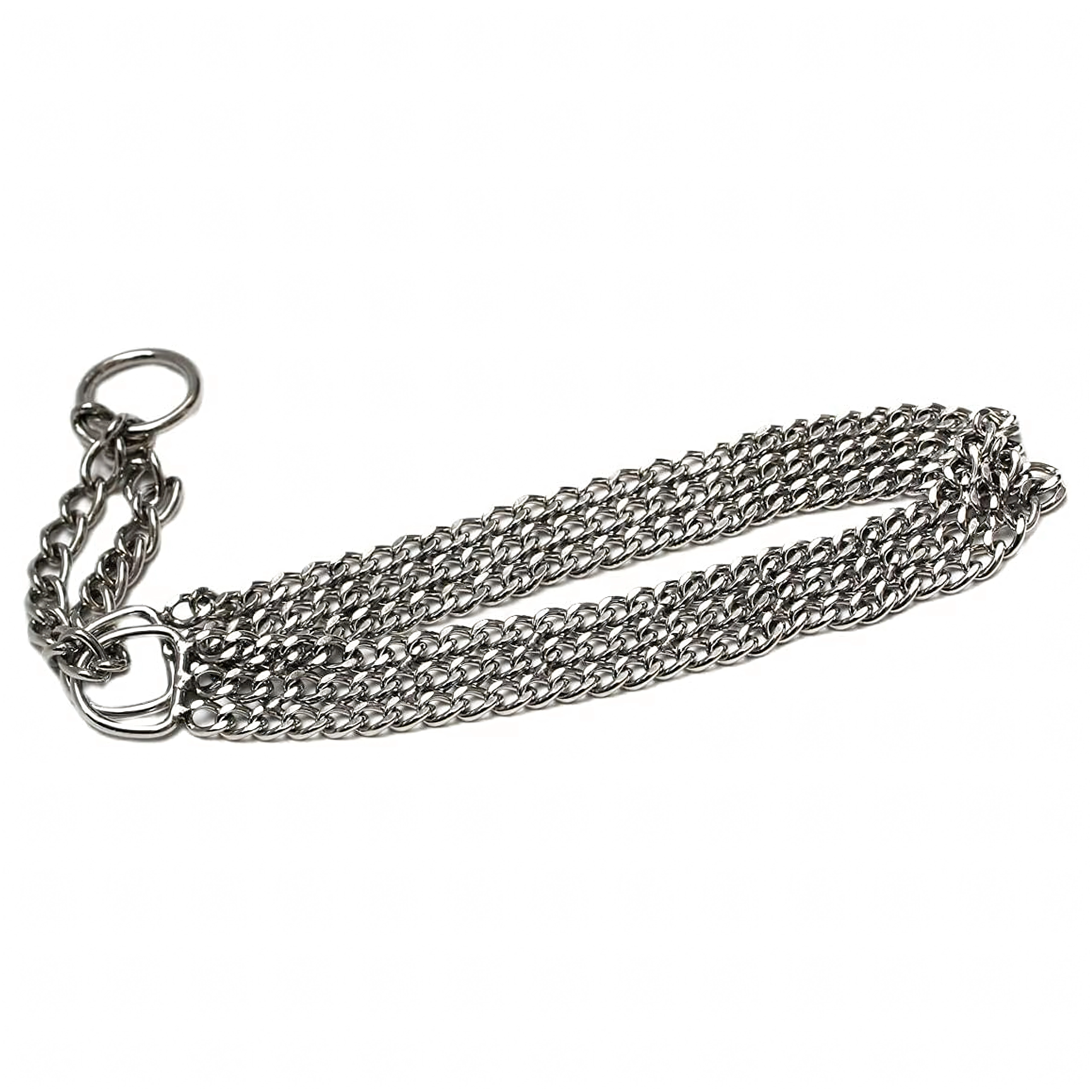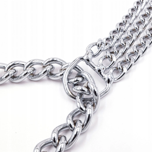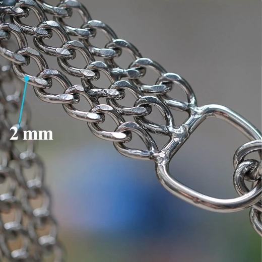 Deze slipketting is gemaakt van hoogwaardig verchroomd staal, dat zich onderscheidt door hoge sterkte, corrosiebestendigheid en een glad oppervlak voor het comfort van de hond. De drievoudige ketting verdeelt de druk gelijkmatig en biedt nauwkeurige en gevoelige controle tijdens de training.