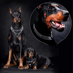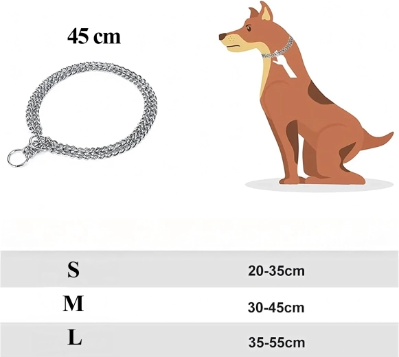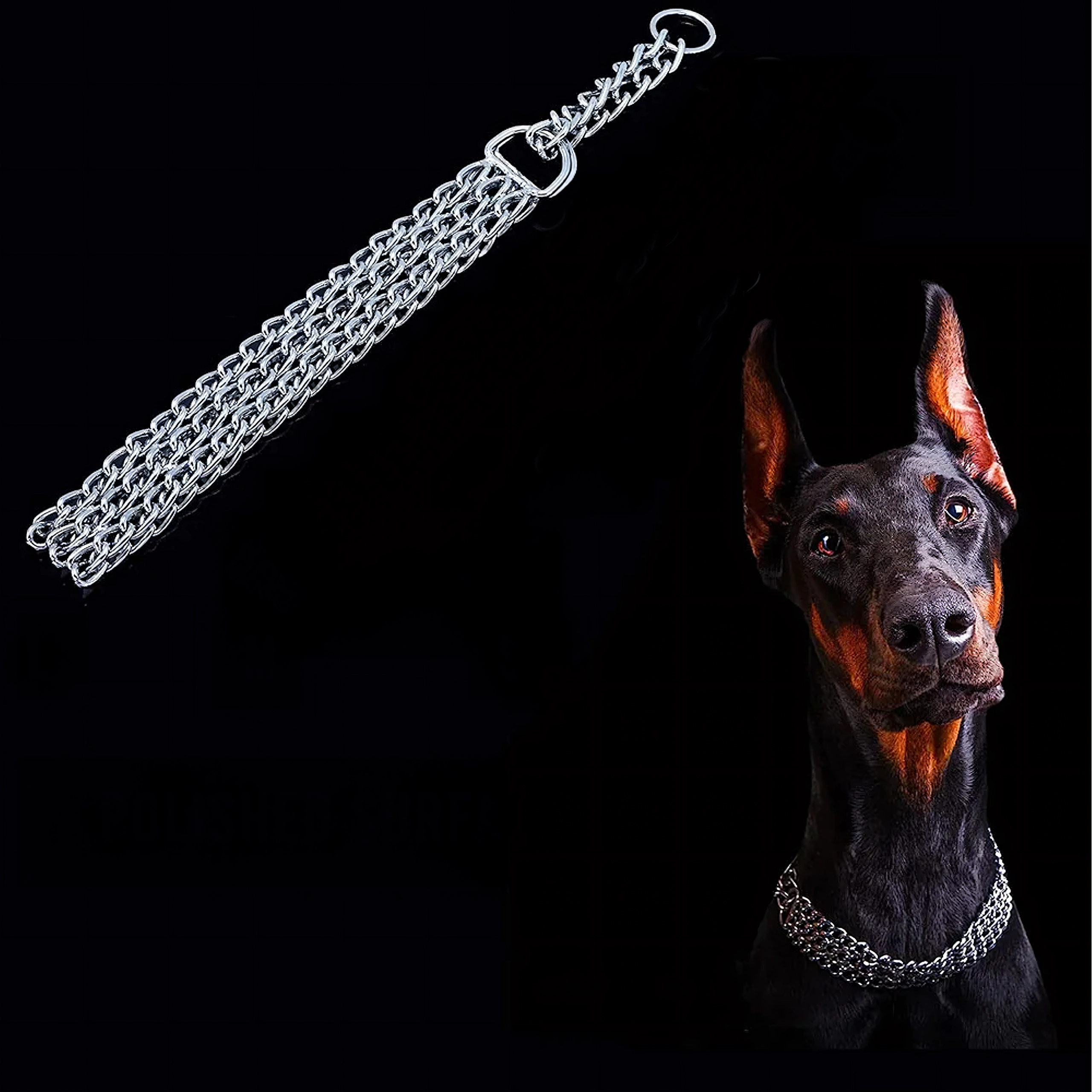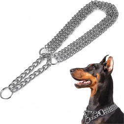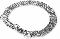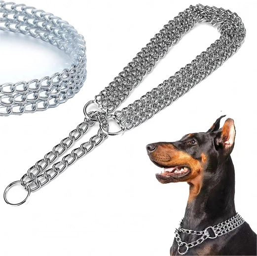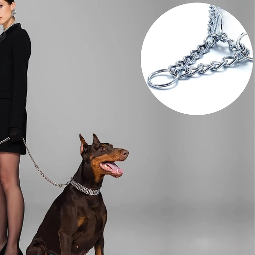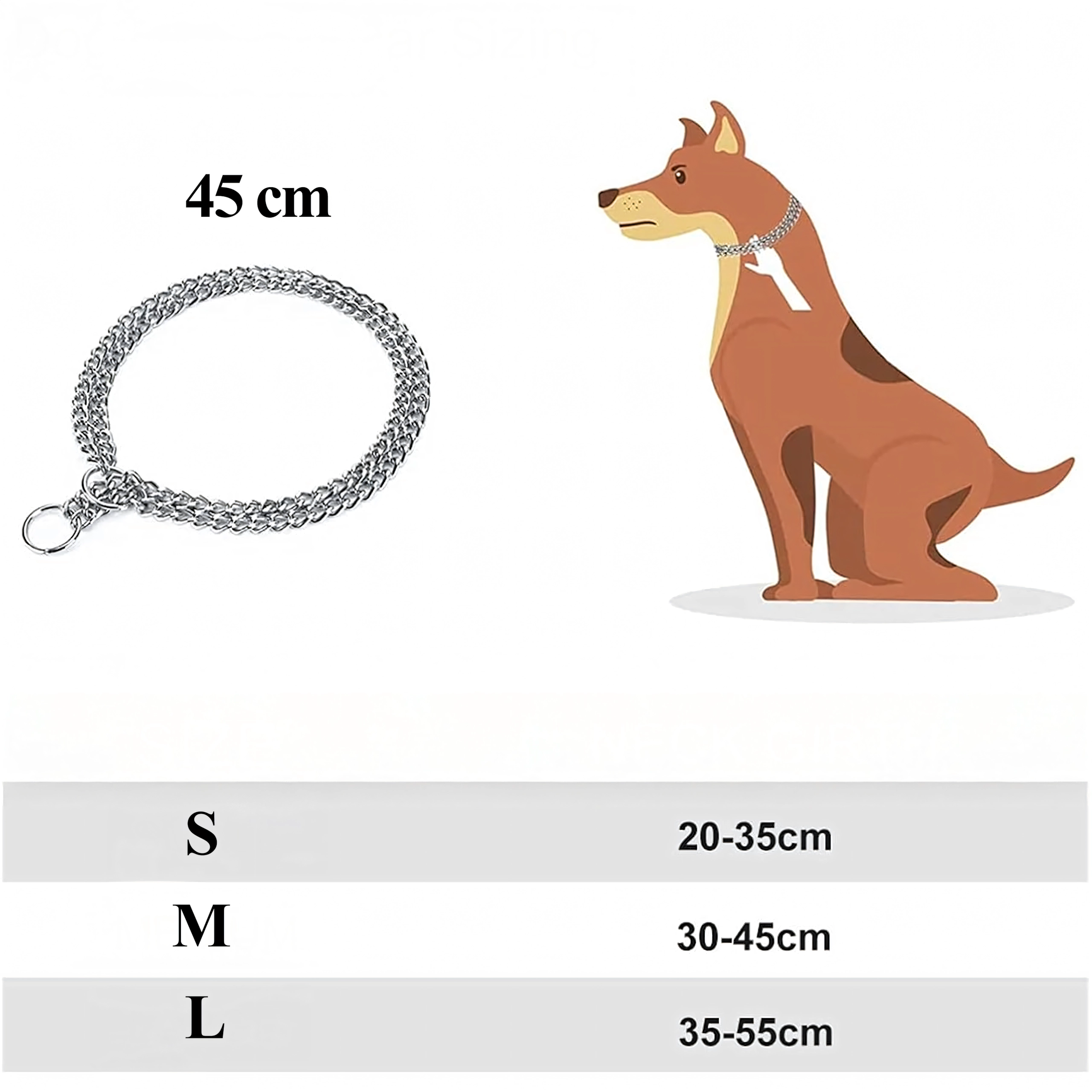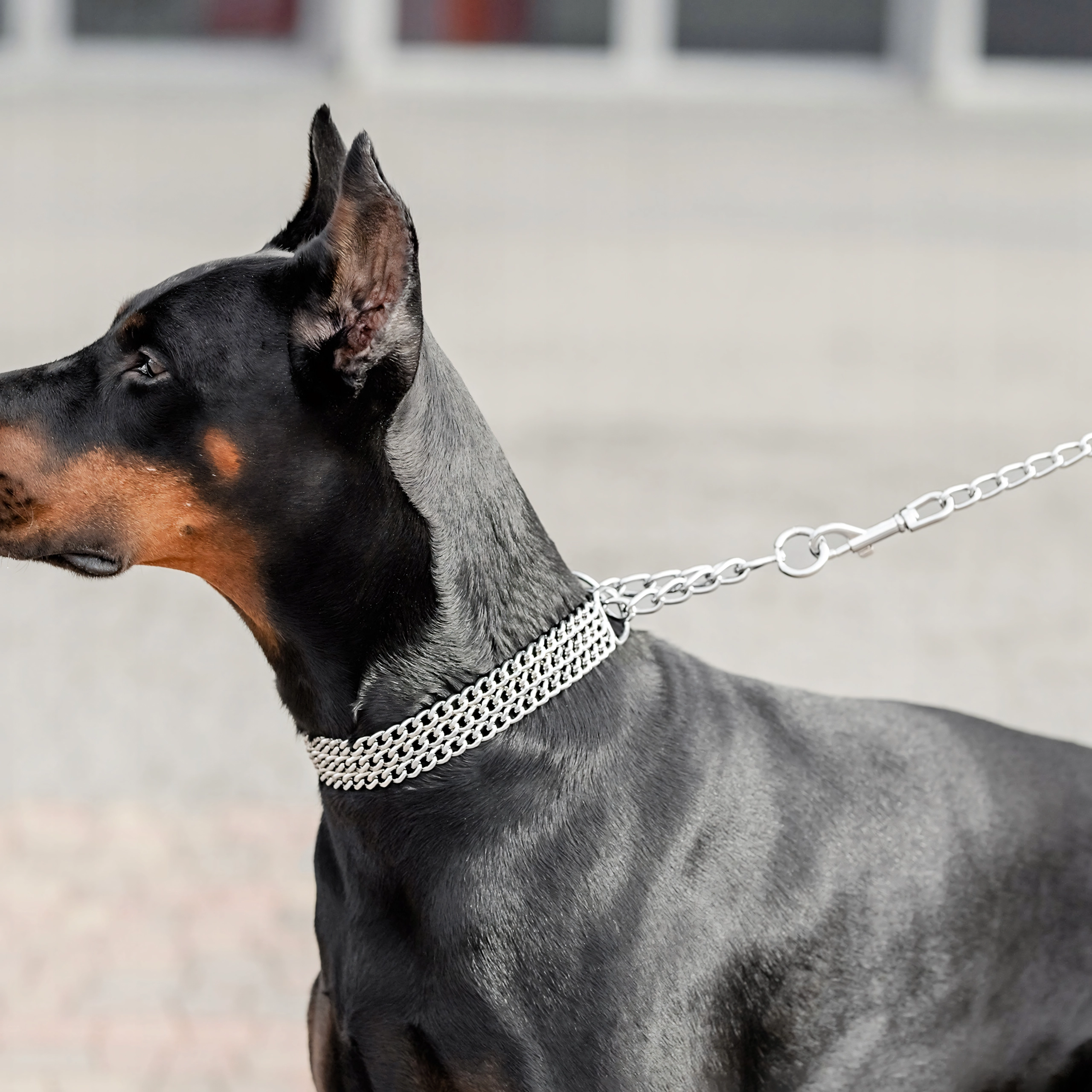 Deze slipketting is gemaakt van hoogwaardig verchroomd staal, dat zich onderscheidt door hoge sterkte, corrosiebestendigheid en een glad oppervlak voor het comfort van de hond. De drievoudige ketting verdeelt de druk gelijkmatig en biedt nauwkeurige en gevoelige controle tijdens de training.