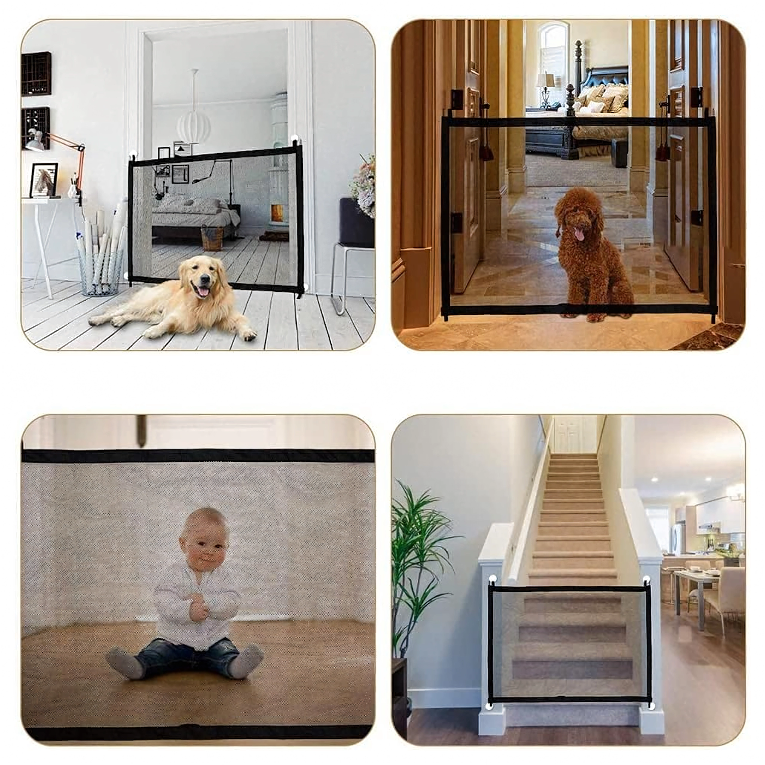 De montage gebeurt zonder boren met houders/zelfklevende haken, zodat muren en kozijnen onbeschadigd blijven. Het hekje is licht, eenvoudig op te vouwen en te verplaatsen naar waar het nodig is. Perfect voor huurwoningen, vakantiewoningen en moderne interieurs.
