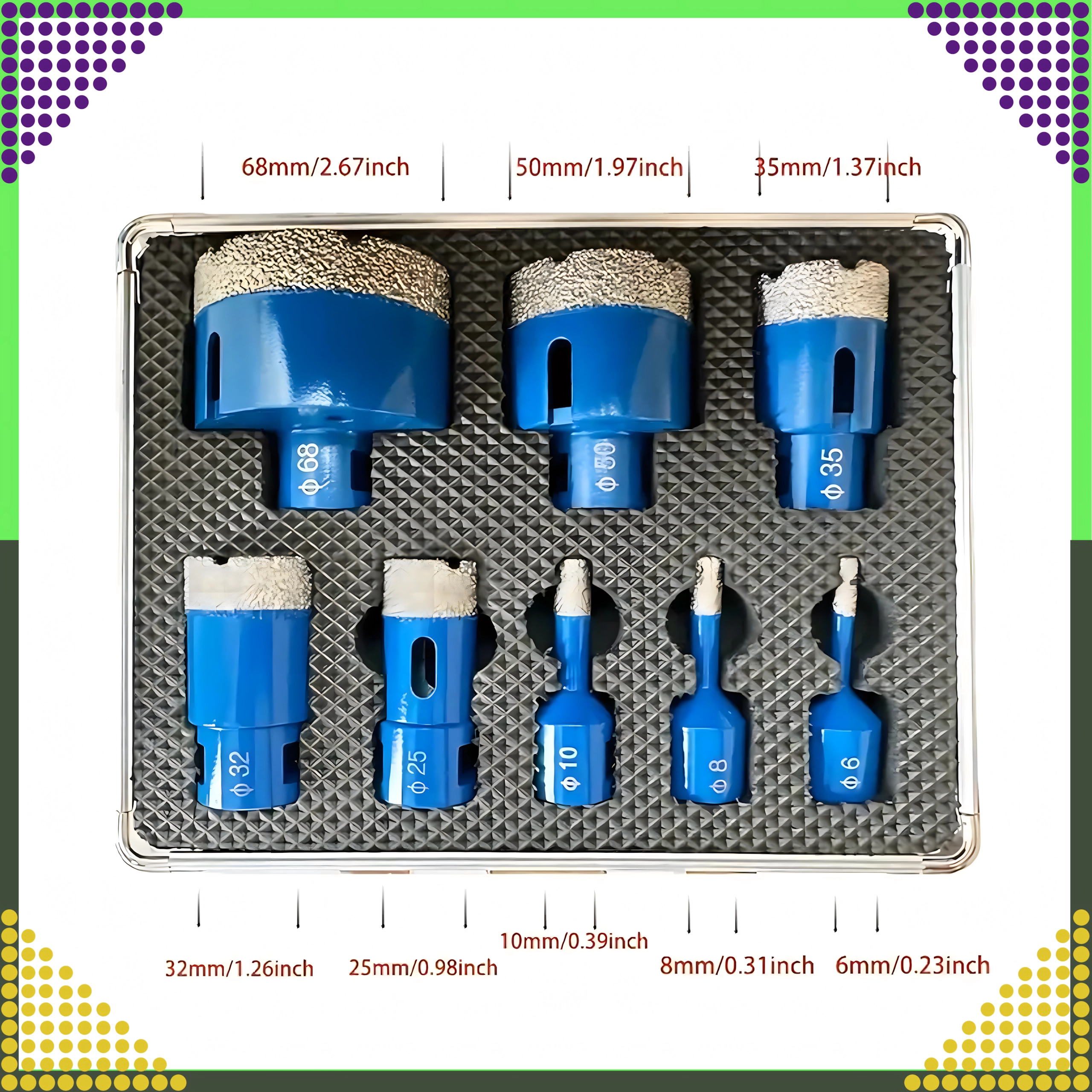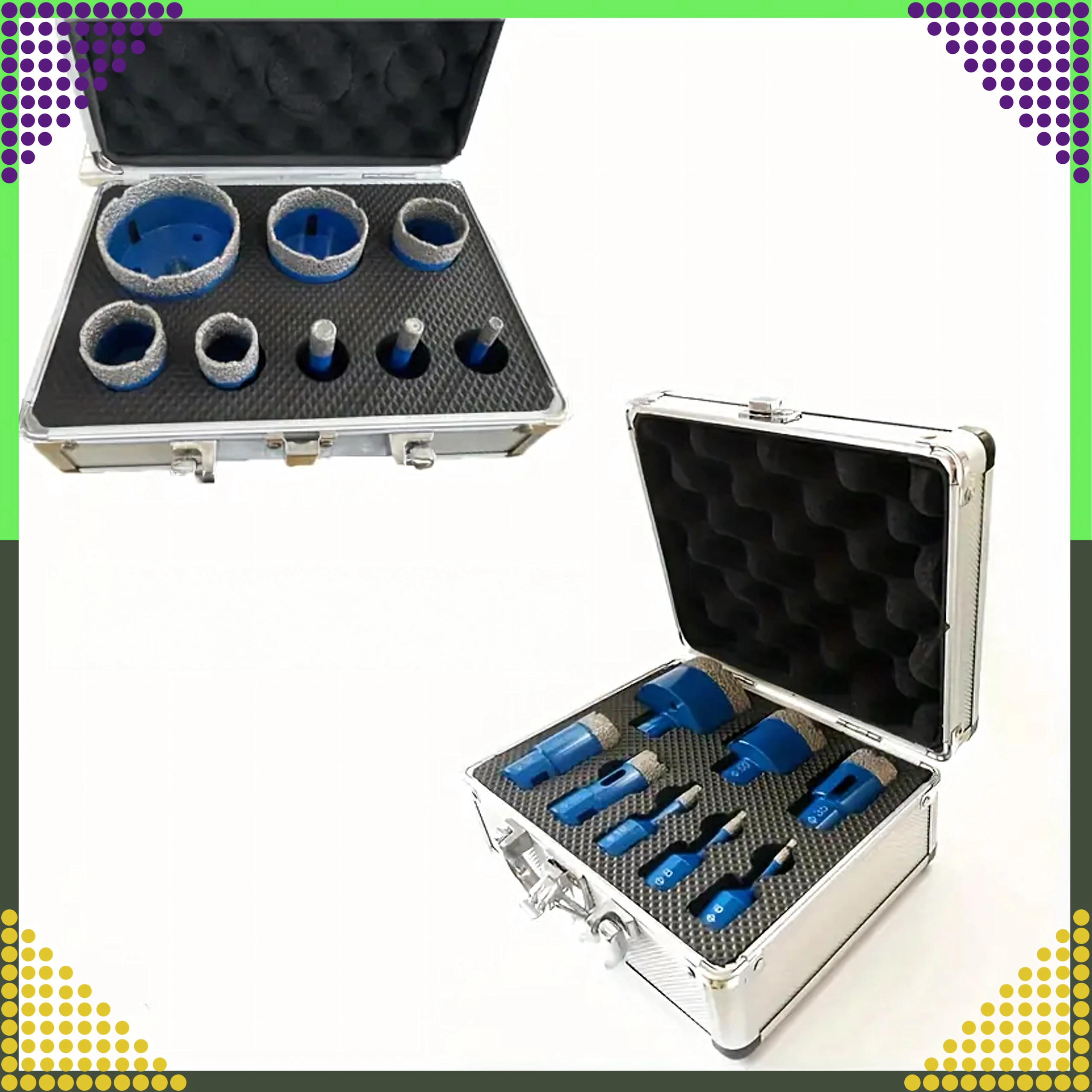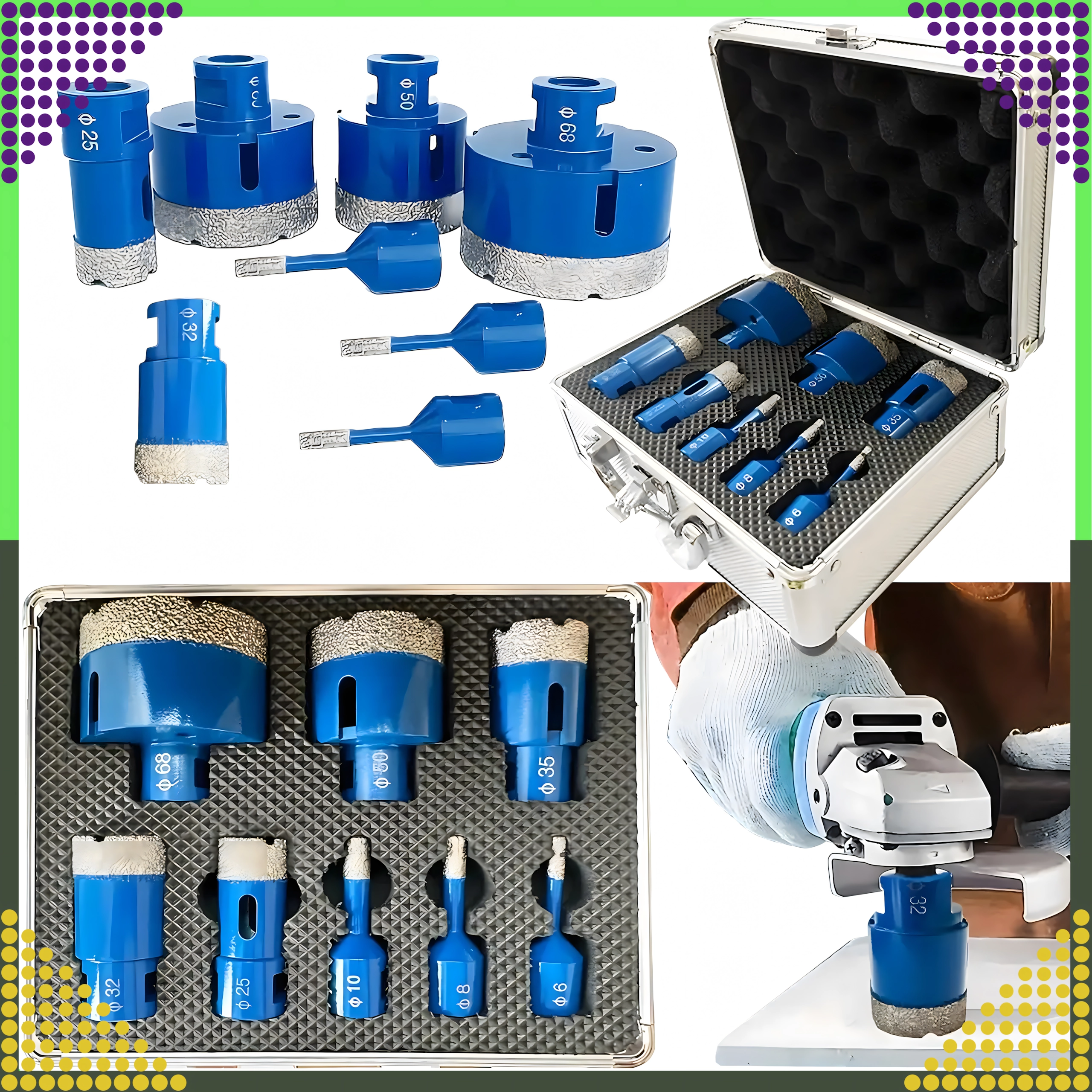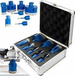 Universele set diamantgatenzagen voor nauwkeurig boren in gres, tegels, beton, baksteen en graniet. Bevat 8 maten (6, 8, 10, 25, 32, 35, 50, 68 mm) voor breed gebruik. De duurzame diamantlaag zorgt voor een lange levensduur en gladde randen van de gaten. Alles is opgeborgen in een praktische aluminium koffer voor veilig transport en opslag.