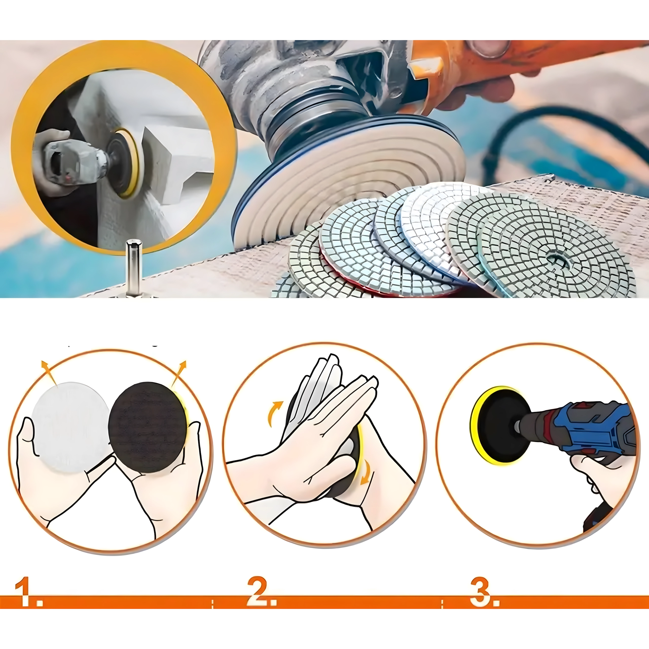 Geschikte materialen: gres, keramiek, natuursteen, graniet, marmer en andere harde oppervlakken. Klittenband (Velcro) garandeert snelle montage en wissel van schijven op steunpads en compatibele schuur-/polijstmachines. Werken nat én droog verhoogt de veelzijdigheid en de kwaliteit van het resultaat.