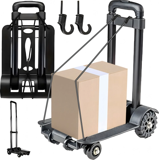 Maak het dagelijkse hanteren van ladingen eenvoudiger. Deze opvouwbare transportkar combineert een laag gewicht, een stevige constructie van aluminium en kunststof en een telescopische handgreep die zich aanpast aan jouw lengte. Dankzij de compacte afmetingen berg je hem na gebruik gemakkelijk op in een kast, auto of rek.