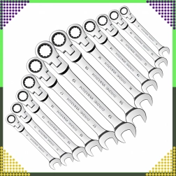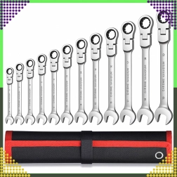 De ratelring maakt vloeiende bewegingen mogelijk, zelfs waar weinig ruimte is. Duidelijk gemarkeerde maten en een praktische oproletui houden de set altijd overzichtelijk en binnen handbereik.
