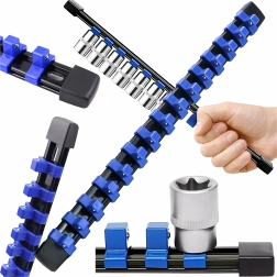 Professionele rail voor 3/8" doppen helpt orde te houden in de werkplaats en onderweg. Dankzij de robuuste metalen basis en sterke kunststof clips heb je je doppen altijd bij de hand en veilig vastgezet. Compacte afmetingen en een laag gewicht maken dragen en opbergen in de gereedschapskist eenvoudig.